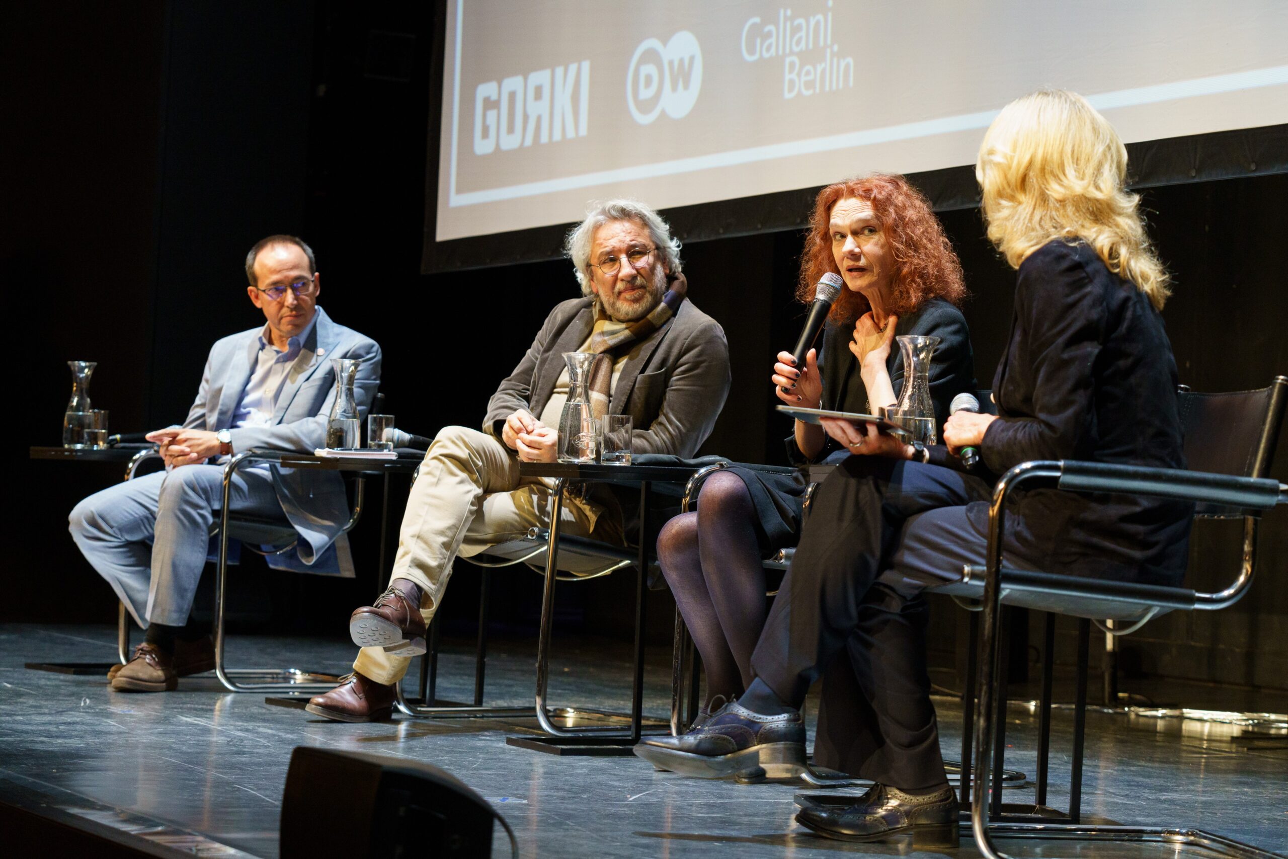 Mit einer Lesung aus Die rissige Brücke über den Bosporus gab der Sprecher, Schauspieler und Dramaturg Frank Arnold Einblick in das neue Buch Can Dündars. Begrüßt wurde das Publikum im vollen Saal des Gorki Theaters im Anschluss durch Verleger Wolfgang Hörner und den Journalisten Peter Limbourg (DW). In seinem Grußwort betonte Peter Limbourg, wie die dramatischen Entwicklungen in der Türkei aber auch aktuell in Israel die Freiheit und Sicherheit vieler Menschen in ganz Europa einschränken und unser Handeln fordern, um die Werte der Demokratie zu verteidigen. Die Arbeit Can Dündars sei daher umso wichtiger, waren sich die beiden Redner einig.