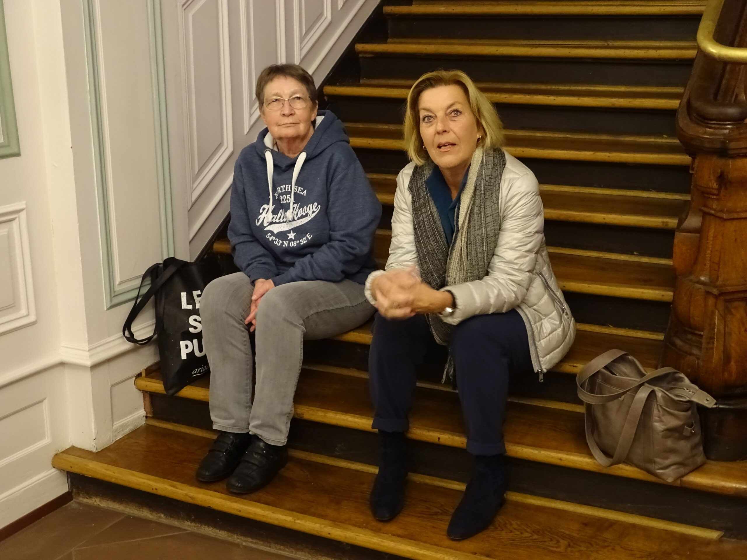 Lesung ist fertig, meine Mama und Dora Heldt sitzen auf der Barocktreppe des Langenselbolder Schlosses.
