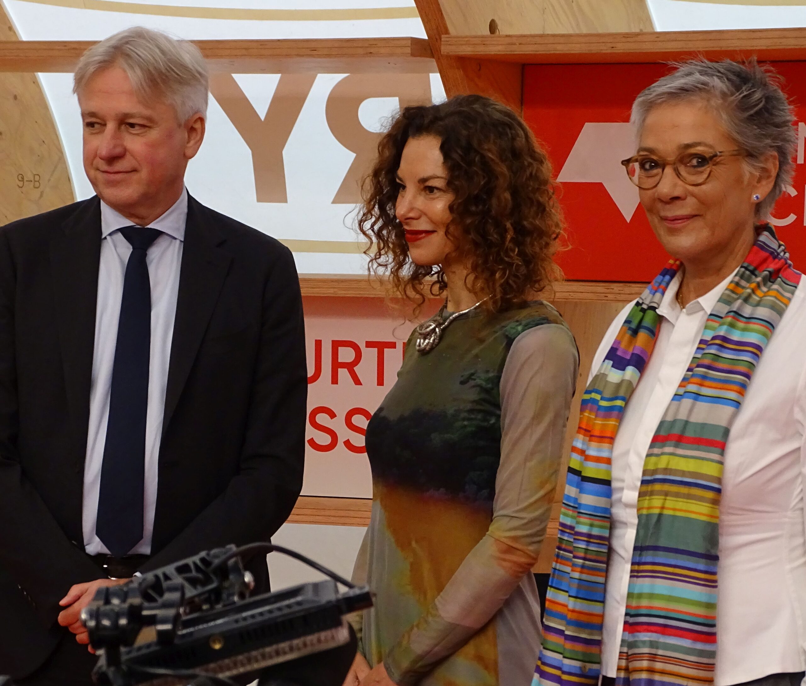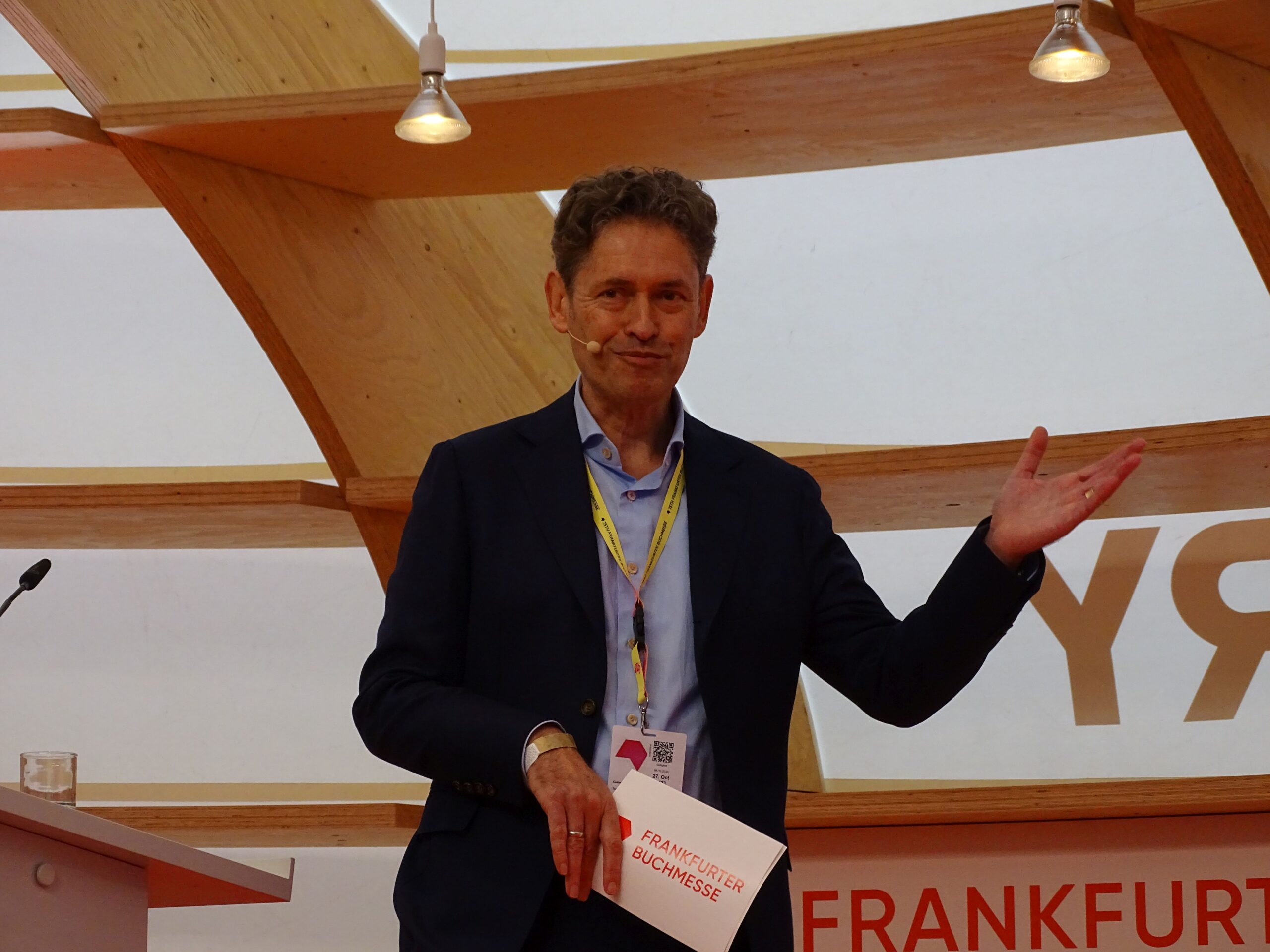 Durchs Programm führte Torsten Kasimir als neuer Pressesprecher der Frankfurter Buchmesse. Fast schon einen Ticken zu charmant, aber immer voll auf den Punkt zeigte der ehemalige Chefredakteur des Börsenblatts, dass er nicht nur gut Presse machen, sondern auch gut pressesprechen kann. Schon wie er seine Cue Card hält!
