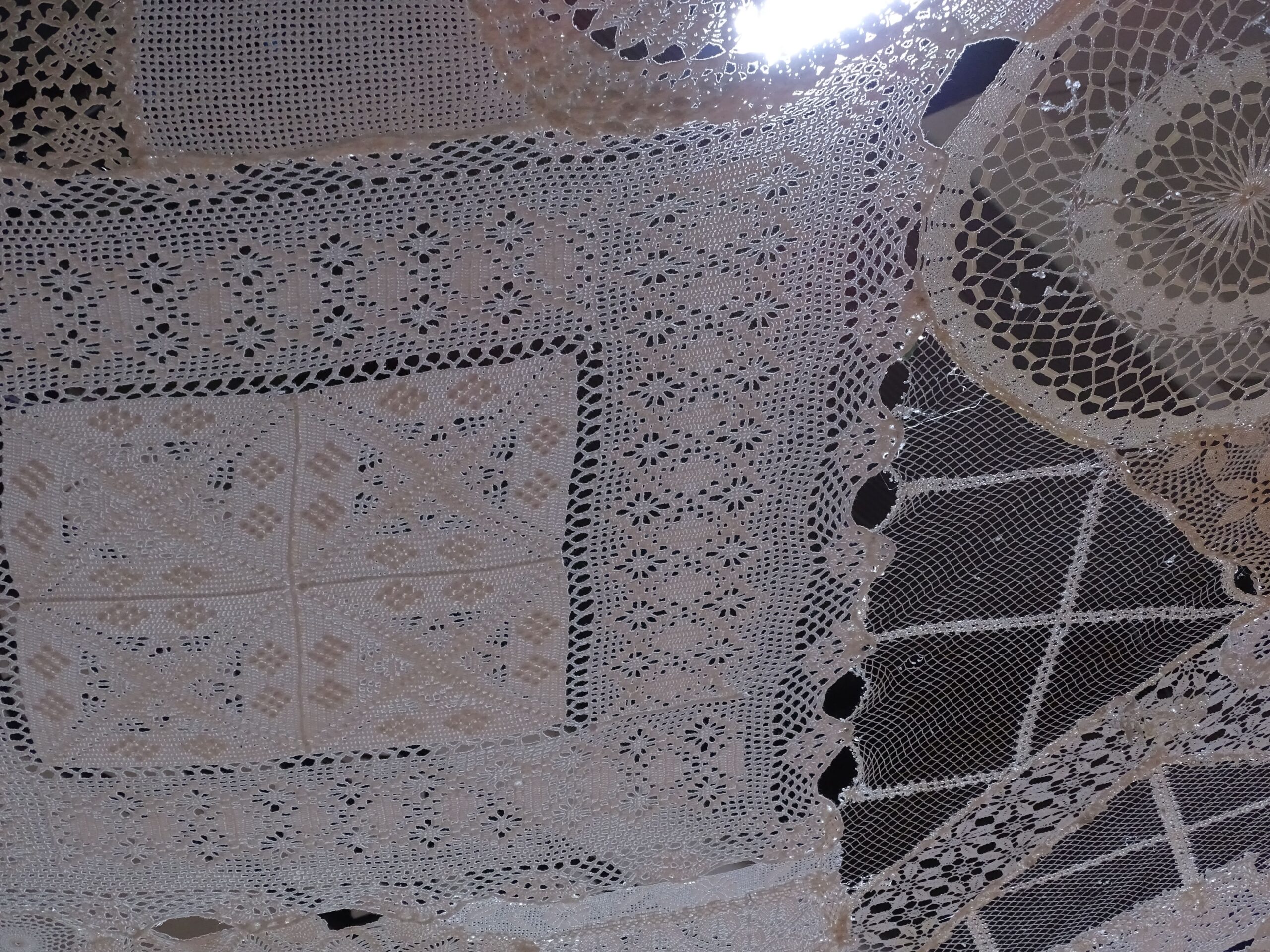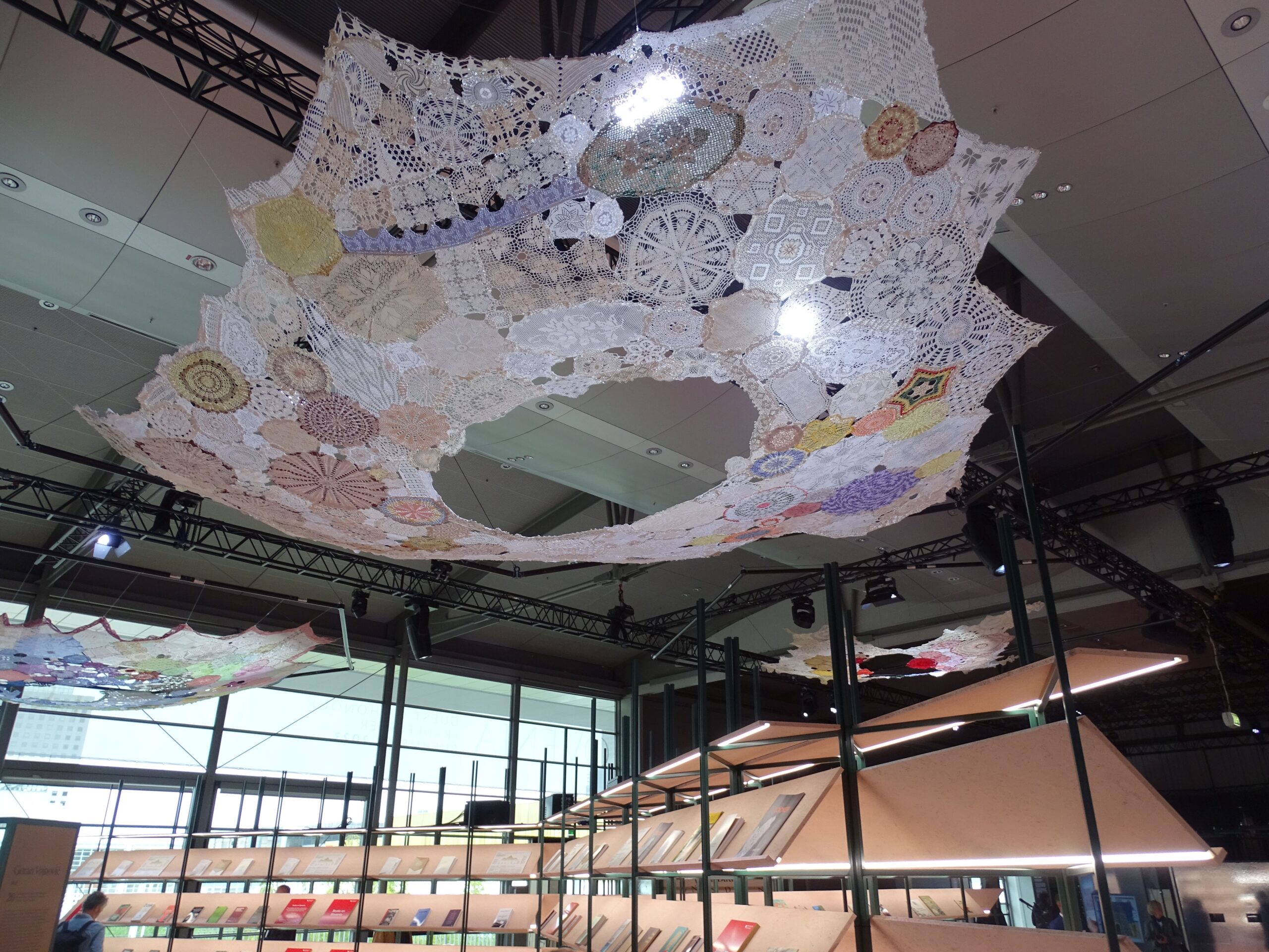 Hier sehen Sie das Bücherwald-Regal, und was dort an der Decke aussieht wie zusammengetackerte Spitze, ist in Wahrheit zusammengetackerte Spitze.