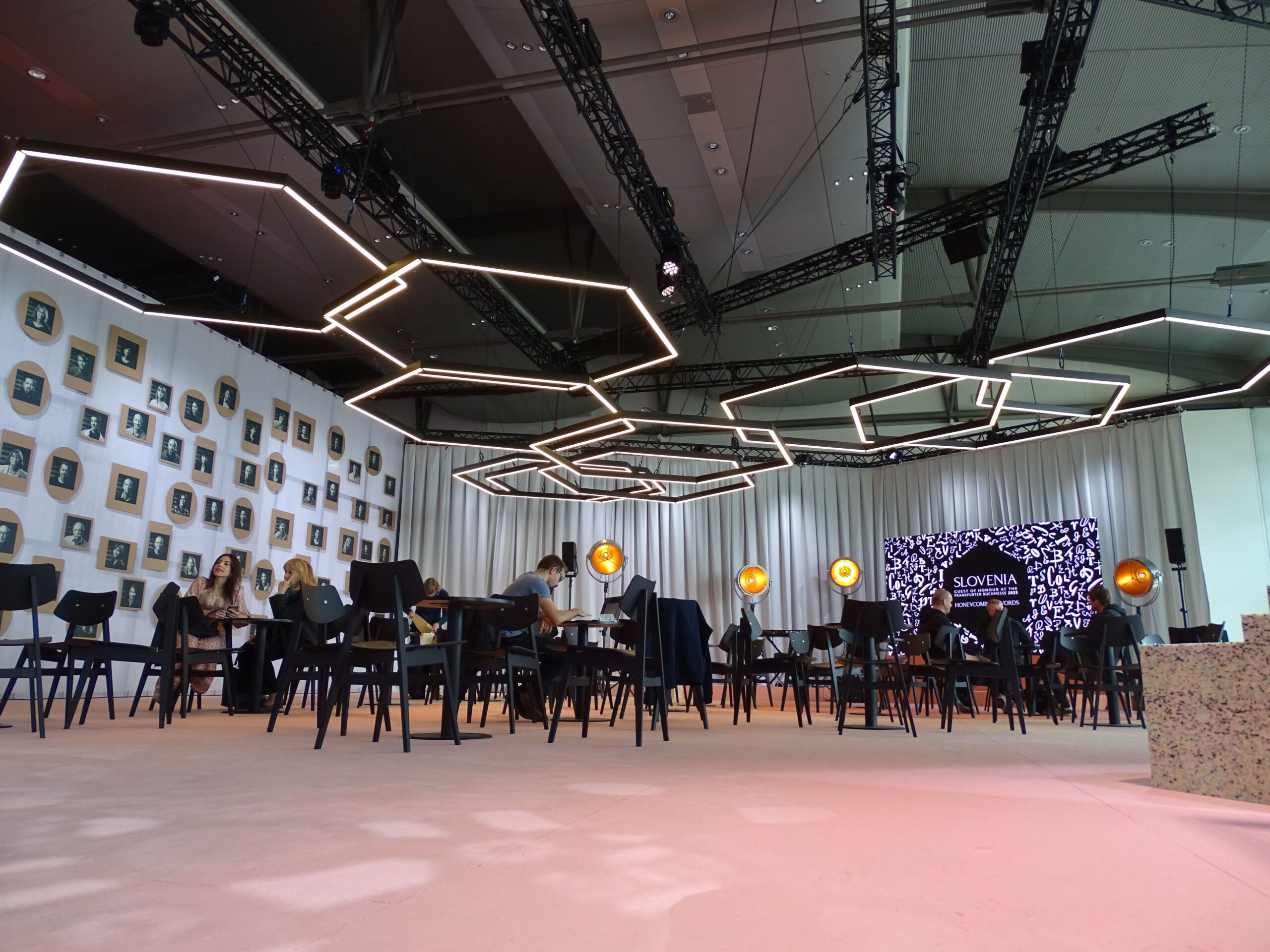 Ja, dieser ist kein Pavilion, sondern ein Pavillon, und das Gastland darf ihn jedes Jahr herrichten. Weil Slowenien eines der recyclingsten Länder Europas ist, soll der Raum mit maximalem Tageslicht auskommen, mit Bücherregalen Wald symbolisieren und Werkstoffe zweitverwerten.
