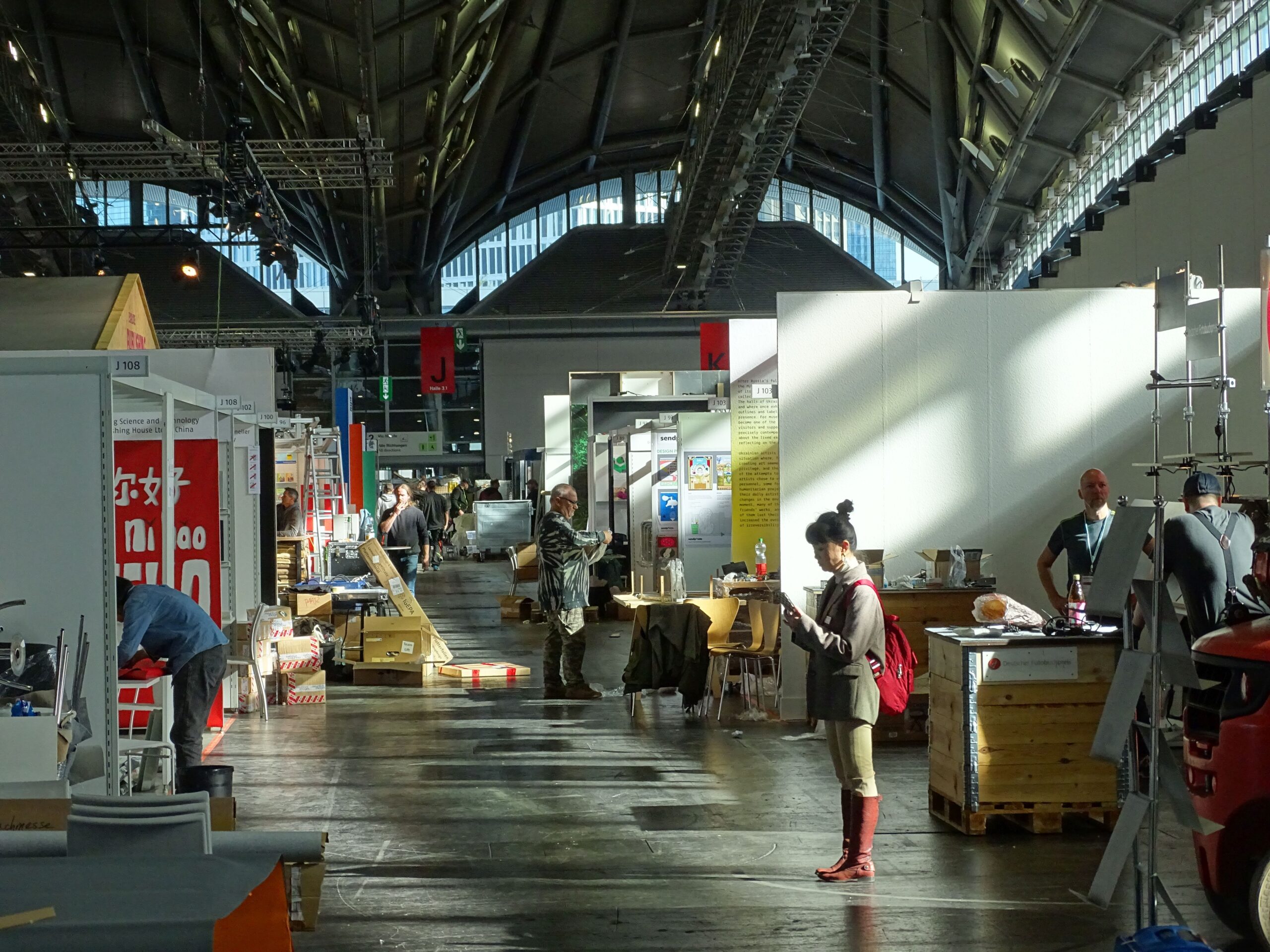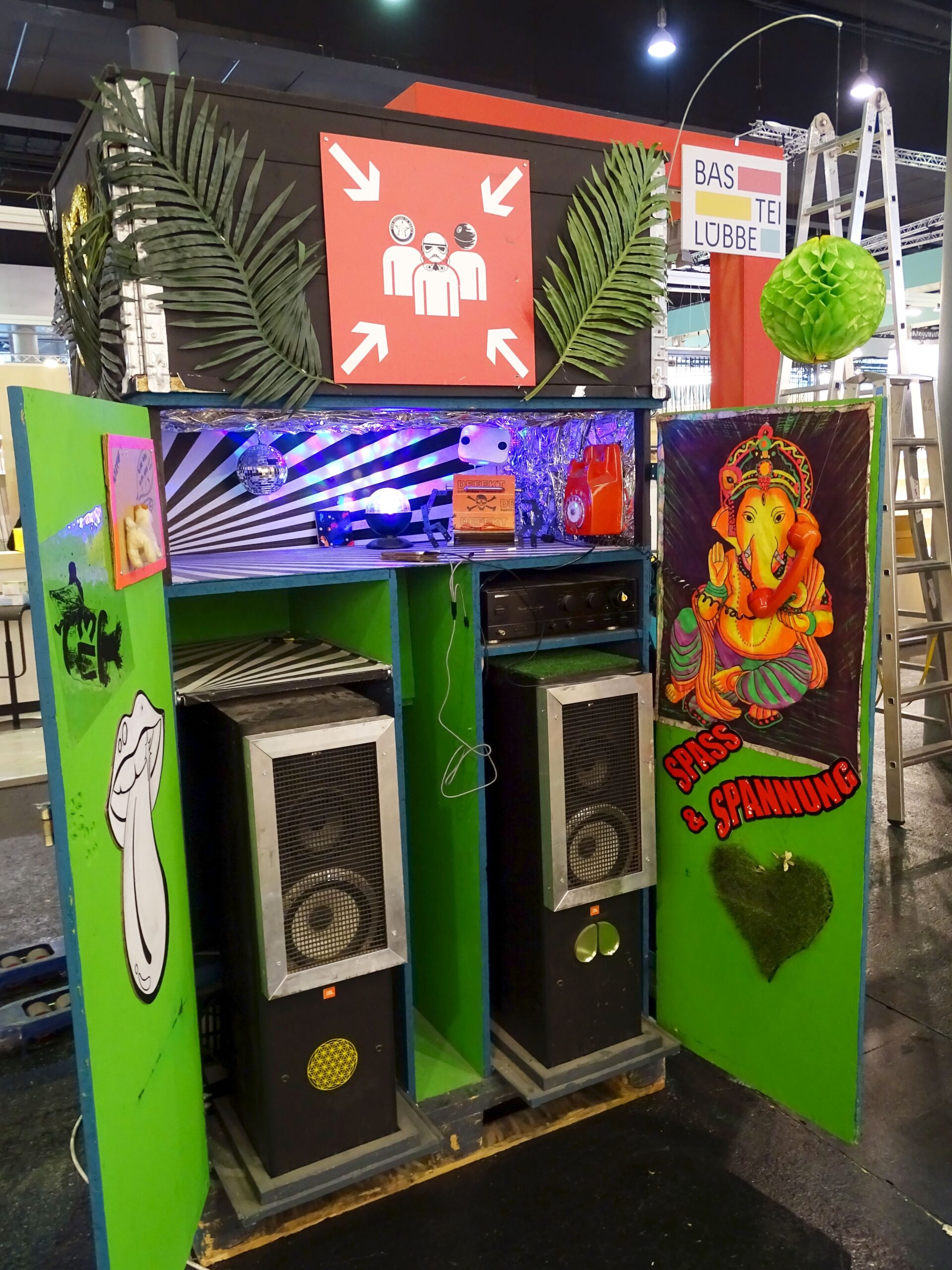 Viele lassen laut Musik laufen beim Aufbau (typisches Dienstags-Ambiente), aber hier hat sich ein Verlag seine eigene Chillbox (Ambient Box?) gestaltet, komplett mit Discokugel und Vintage-Deko.