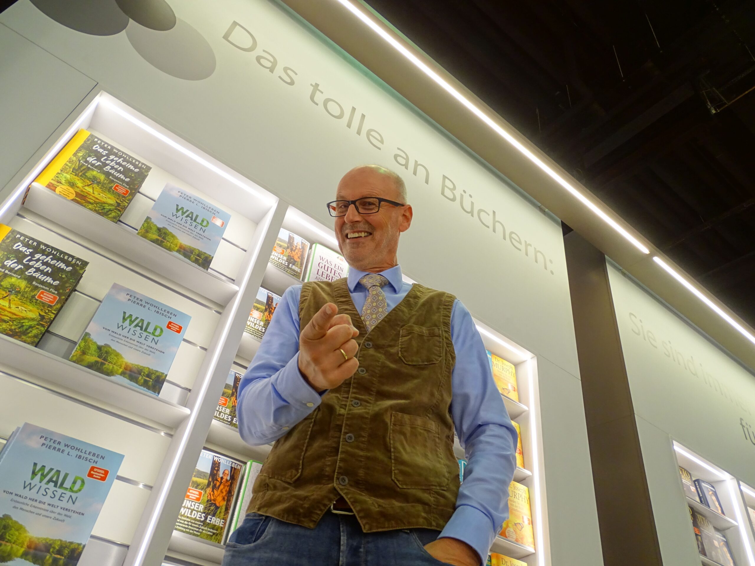 Der Förster, Forstologe, Arborhetiker, Laubfrosch und Waldmeister Peter Wohlleben stellt gleich zwei tolle Bücher auf dieser Messe vor: Zum einen hat er seinen Ur-Erfolg Das geheime Leben der Bäume in eine Graphic Novel verwandelt, zum anderen stellt er in seinem neuen Sachbuch Unser wildes Erbe den größeren Zusammenhang zwischen unseren Ökosystemen und unserer Geschichte her – Mensch, Planet und Evolution arbeiten auf viele faszinierende Weisen zusammen. Ich traf ihn beim Ludwig-Verlag am Random-House-Stand, wo er gerade Wurzeln schlagen wollte.