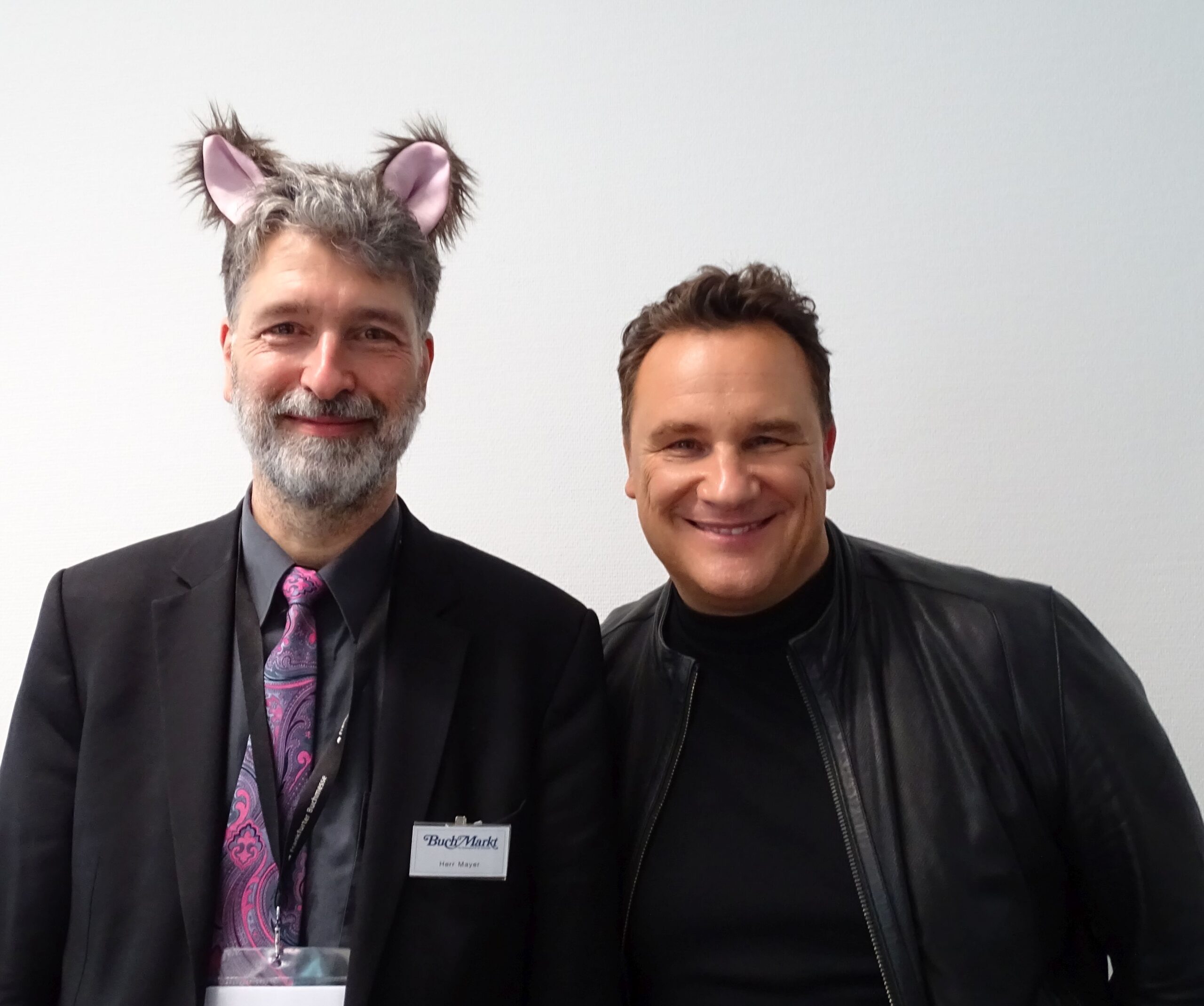 Und hier ist mein Lieblingsfoto: Mayer, frustriert, weil er nirgends an Otto Waalkes herankommt für ein einziges, gutes, exklusives Foto für den BuchMarkt.