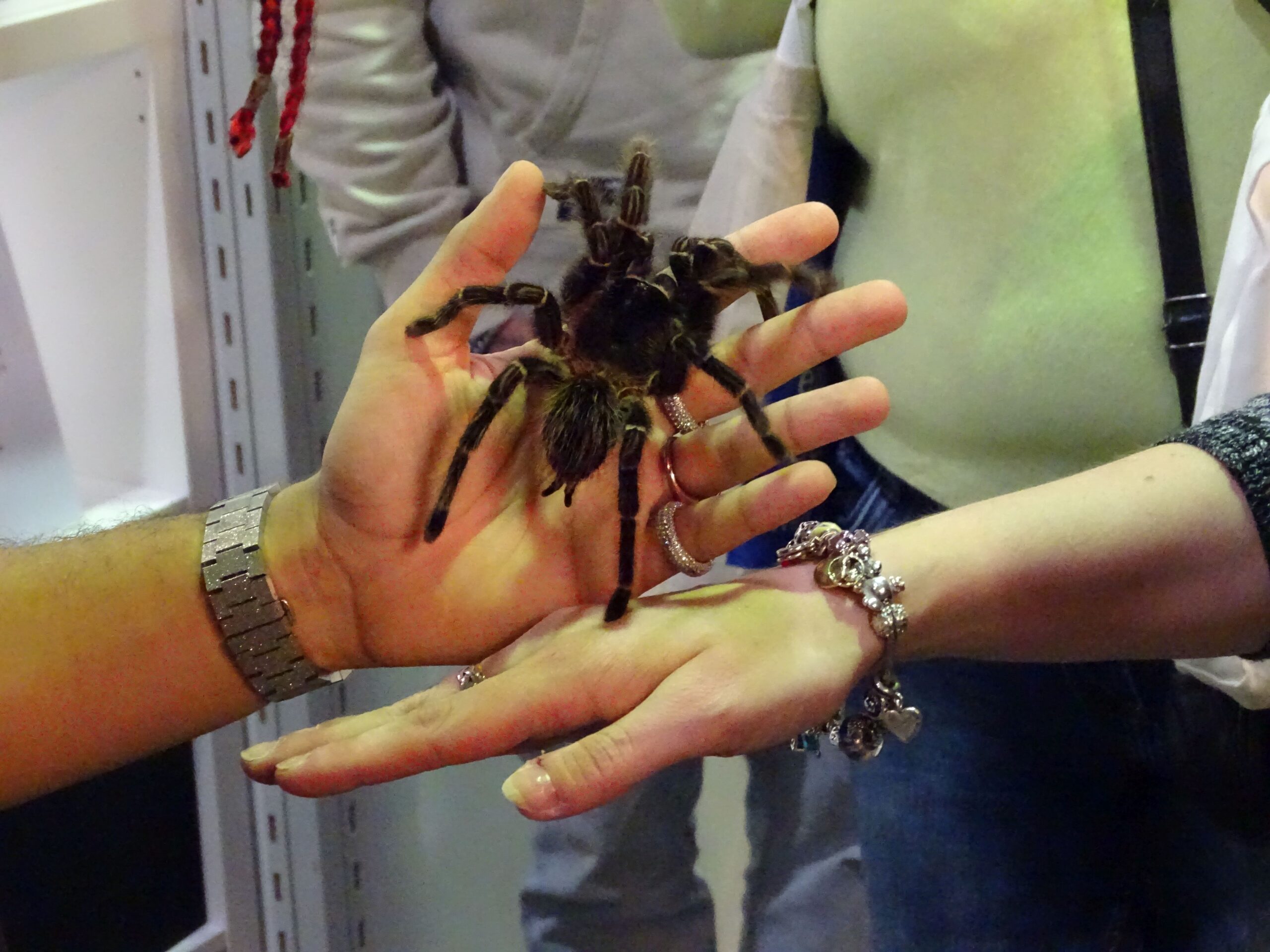 Um das mit einer beeindruckenden Aktion zu bewerben, hat Soruklu Deniz eine lebende Riesenvogelspinne mitgebracht.