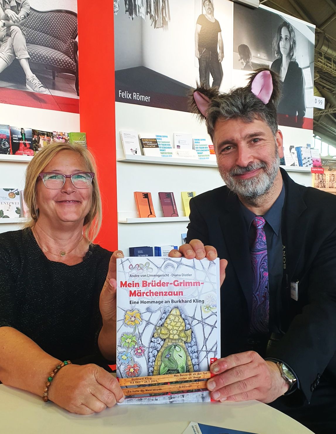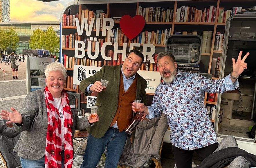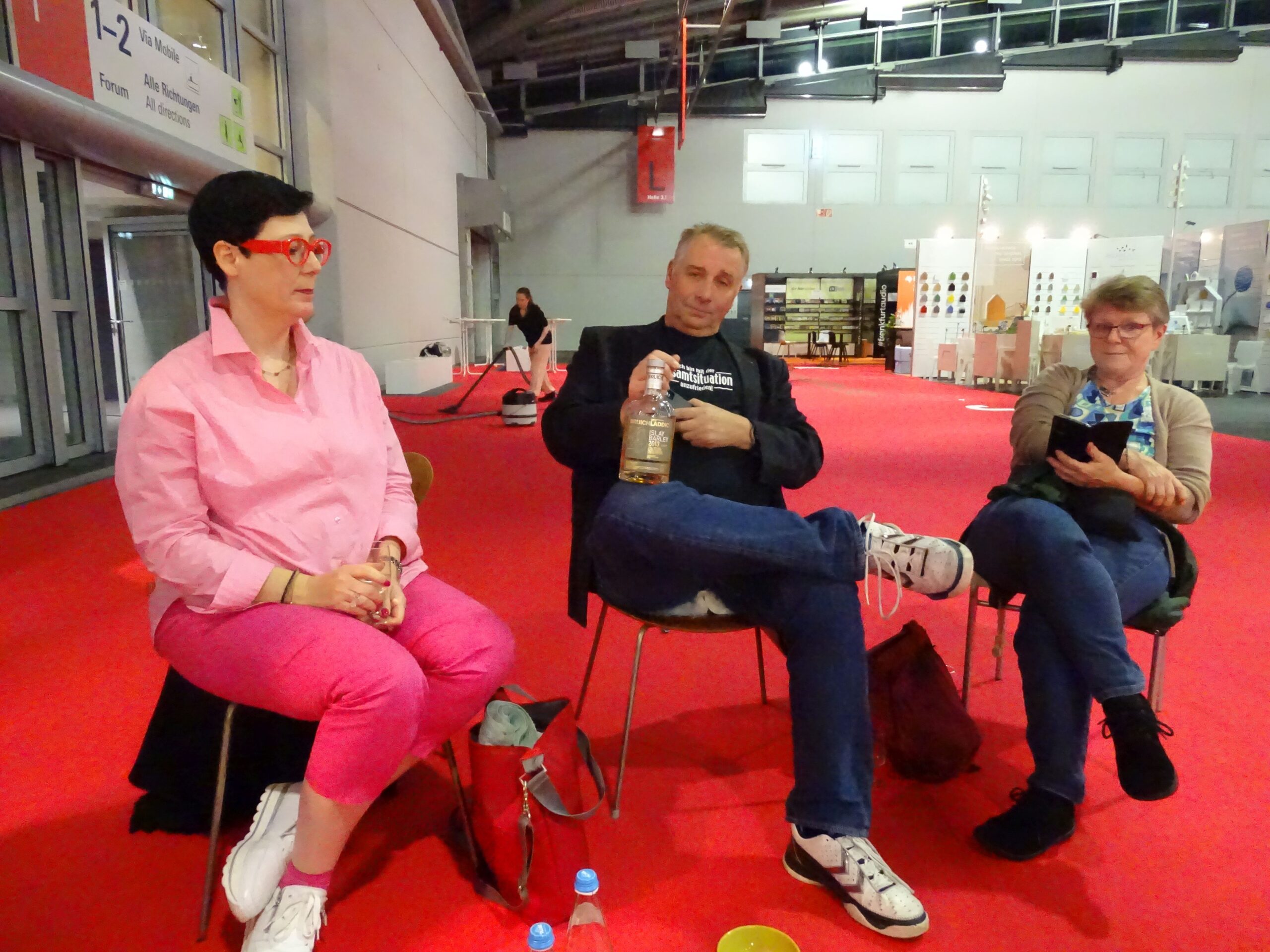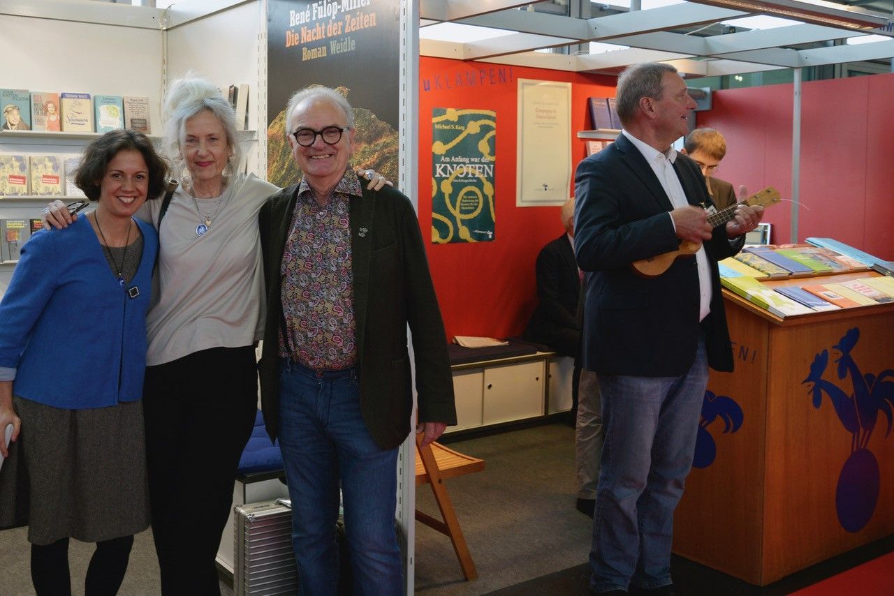 Links: Carolina López, Barbara und Stefan Weidle. Die Weidles haben ihren Verlag an Wallstein verkauft und feiern ihren letzten eigenen Verlagsstand. Zur rechten steht Dietrich zu Klampen.