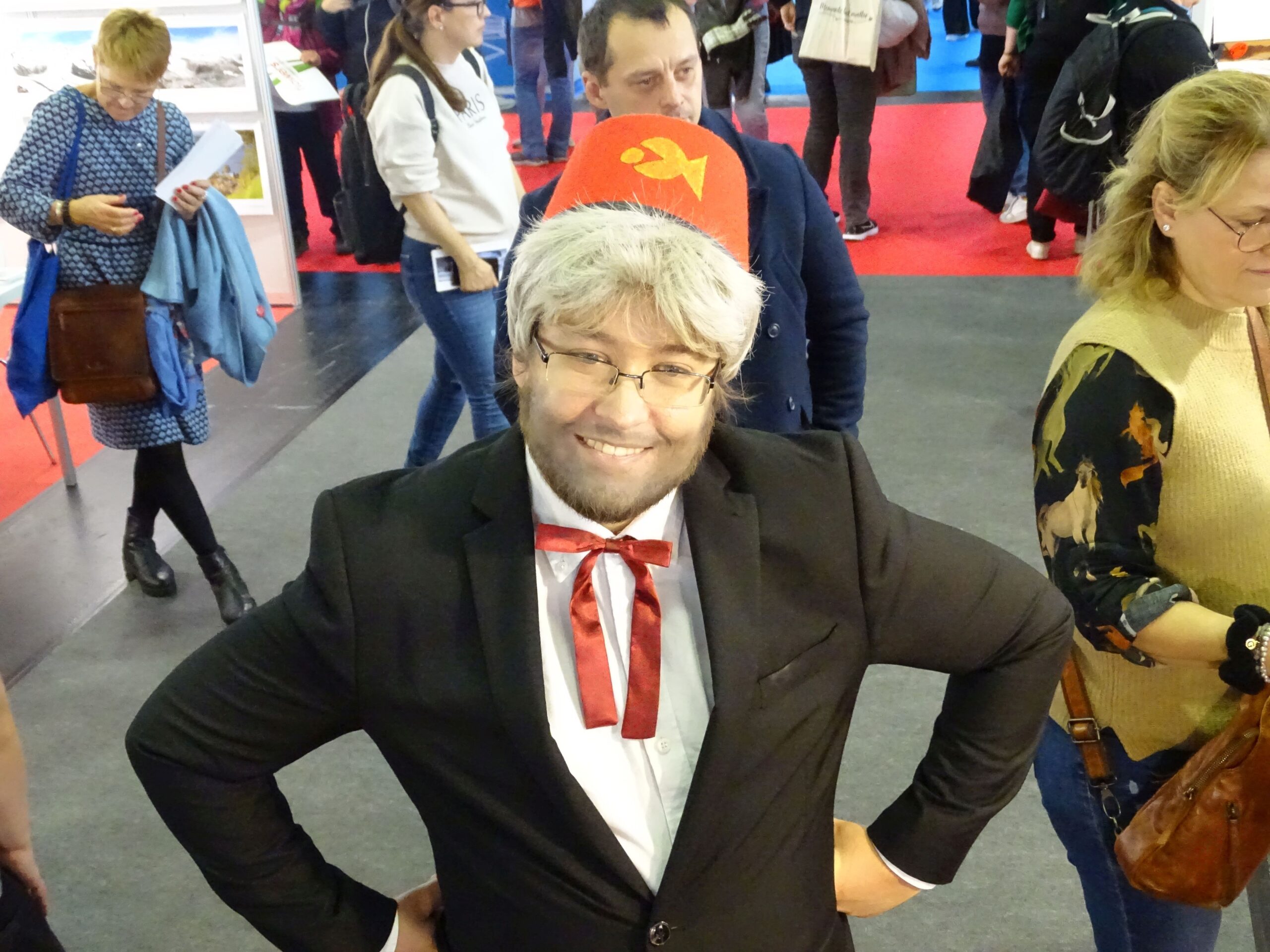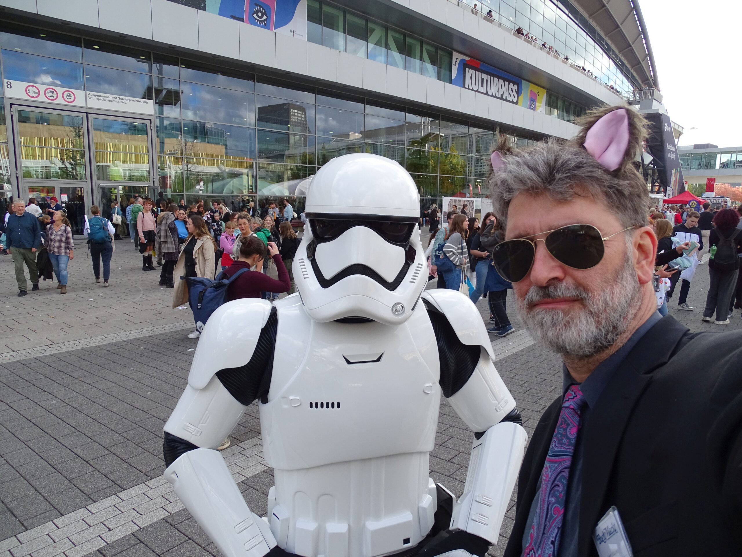 Jule Wenzel hat es geschafft, mich in der riesigen Menschenmenge nicht zu verlieren. (Ich bin der mit den Öhrchen.) Jule Wenzel weiß im Gegensatz zu mir, wie man ein Smartfon bedient. Jule Wenzel hat mich gerettet, als mein Diktiergerät versagte. Jule Wenzel hat meinen Tag mit Sätzen vorwärtsgebracht wie „Sie müssen noch das Foto machen“ und „Die Rolltreppe ist gleich zu Ende“. Jule Wenzel hat am Ende der Woche dann ihre eigene Familie wie ein Profi über die Messe geführt.