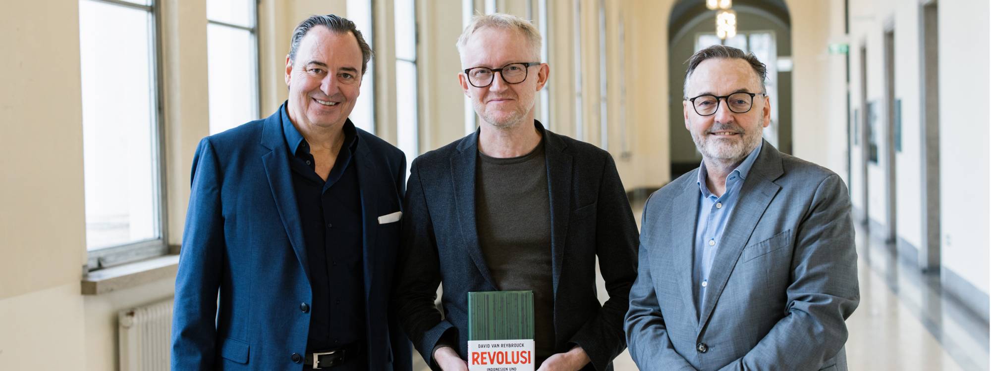 Der Vorsitzende des Börsenvereins in Bayern Klaus Füreder nennt David Van Reybrouck einen großartigen Zuhörer und begnadeten Erzähler und bedankt sich bei ihm für seine „verdienstvolle Arbeit im Dienste der Verantwortung und der Aufklärung“ und bewundert seinen moralischen und intellektuellen Mut, der ihn dabei ganz im Sinne des Geschwister-Scholl-Preises geleitet habe. „Beeindruckend schlagen Sie den Bogen vom 17. Jahrhundert bis heute, zeigen die engen wirtschaftlichen Verflechtungen von den Niederlanden mit Indonesien – letztlich aber vor allem die Ausbeutung. Sie zeigen die Involviertheit Indonesiens in den zweiten Weltkrieg – und spätestens jetzt verstehen wir, was Welt-Krieg bedeutet.“