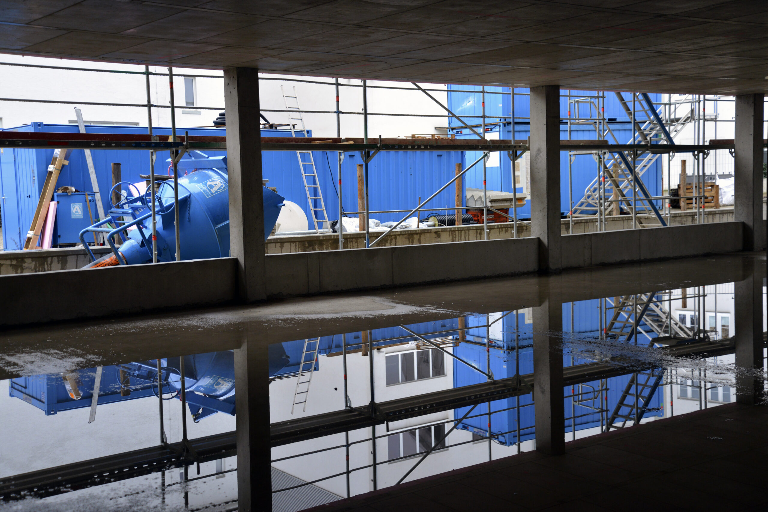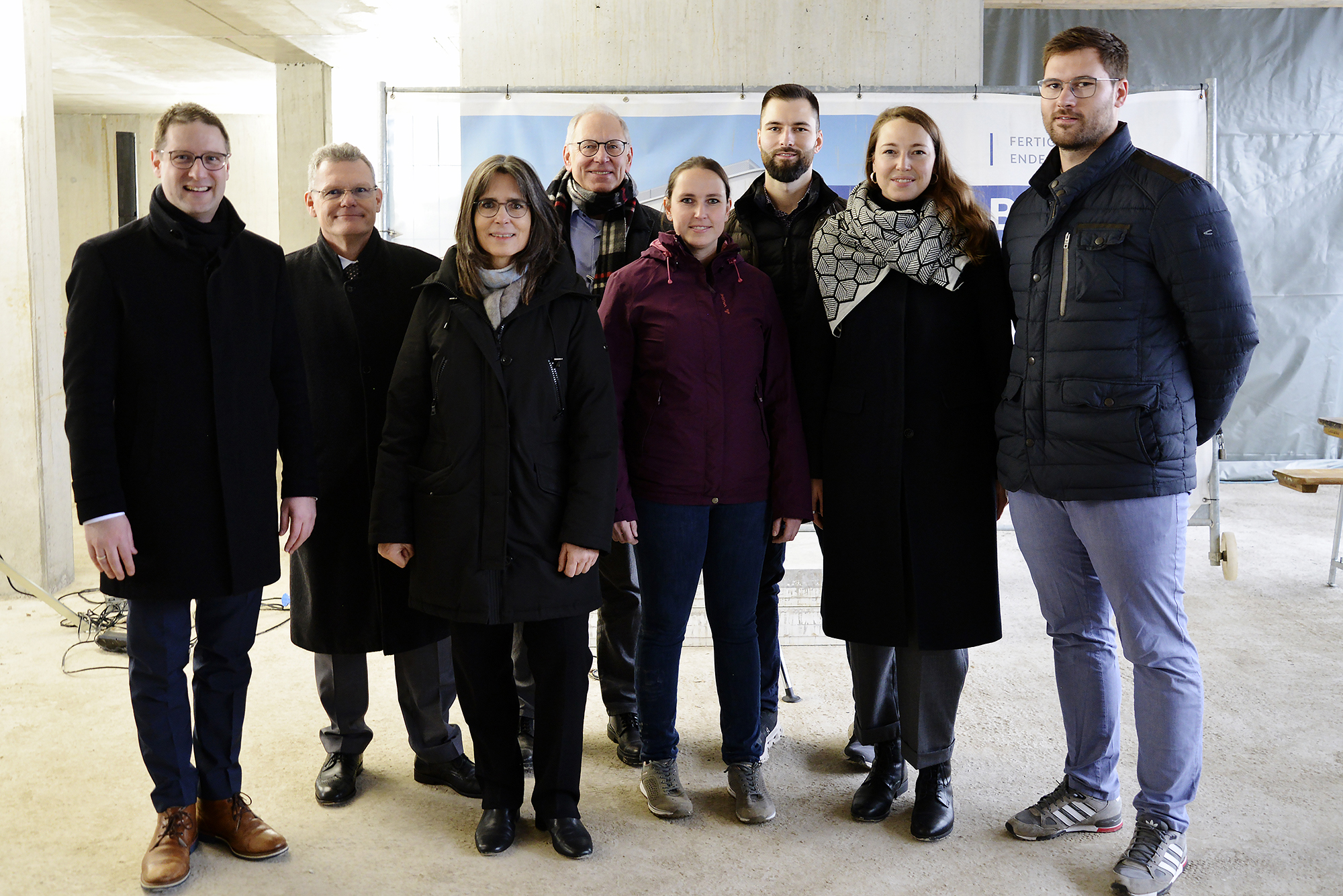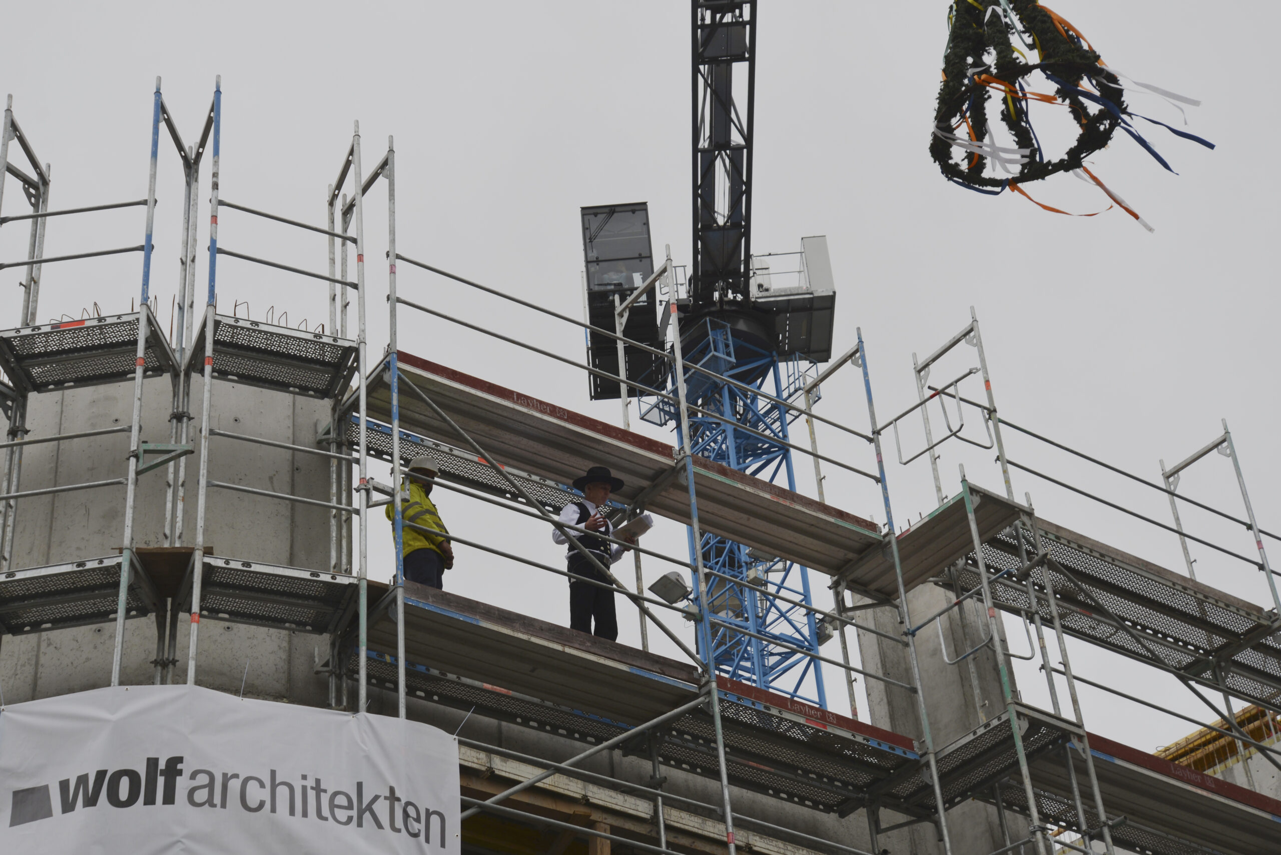 Matthias Rübelmann dankte in seiner Ansprache im künftigen Aufenthaltsraum im Erdgeschoss allen am Rohbau Beteiligten dafür, dass sie die Basis für ein gutes Gebäude gelegt haben, „das für unser Unternehmen die Zukunft sein wird“. Vom Nachbarhaus aus lässt sich seit einem Jahr beobachten, wie die Stockwerke der insgesamt rund 3.000 Quadratmeter-Fläche hochgezogen werden. Mit rund 180.000 Drahtschlaufen, so hat Matthias Rübelmann vorsichtig ausgerechnet, mussten die Eisenstangen der Geschossdecken von Hand verbunden werden.