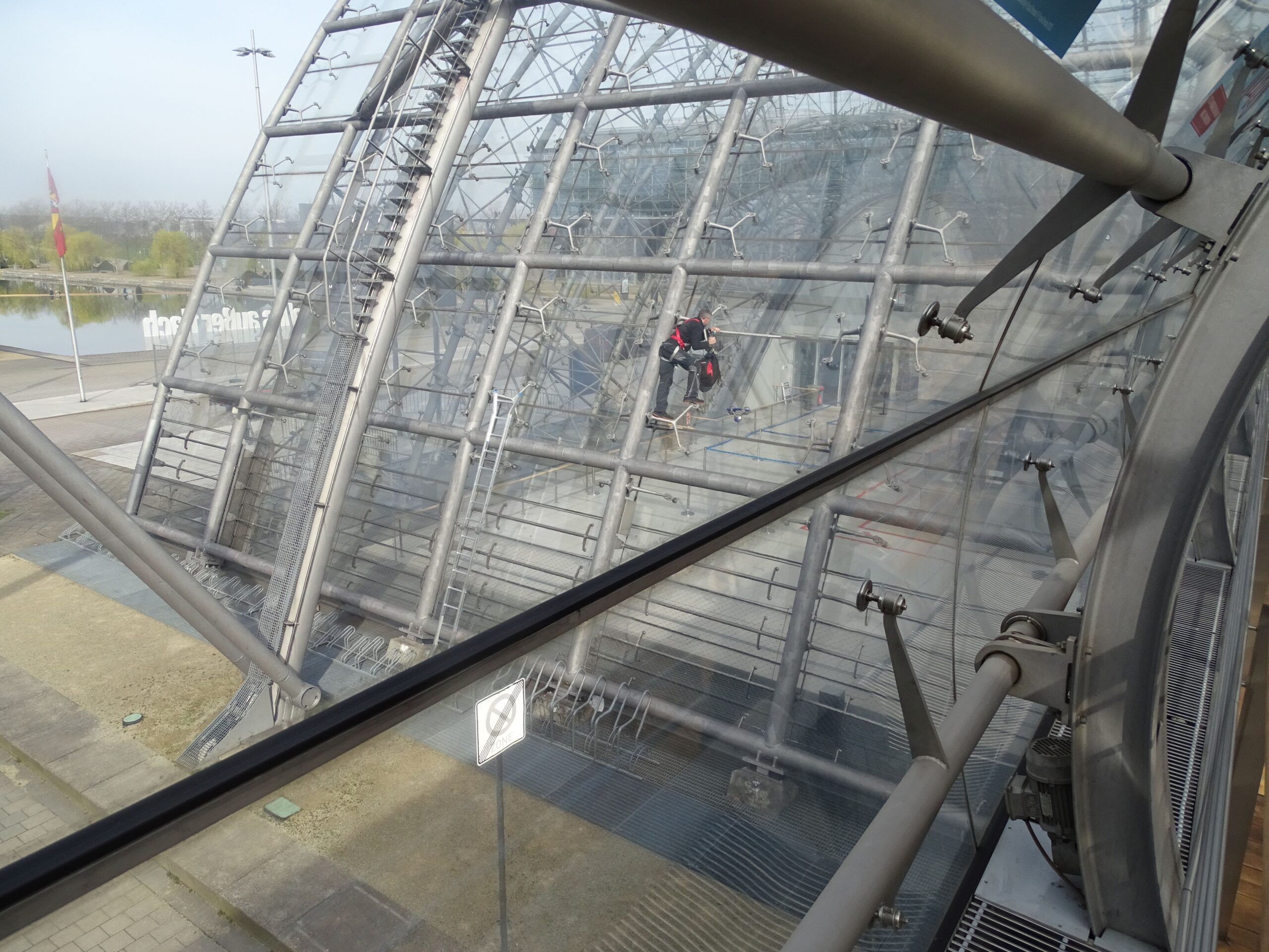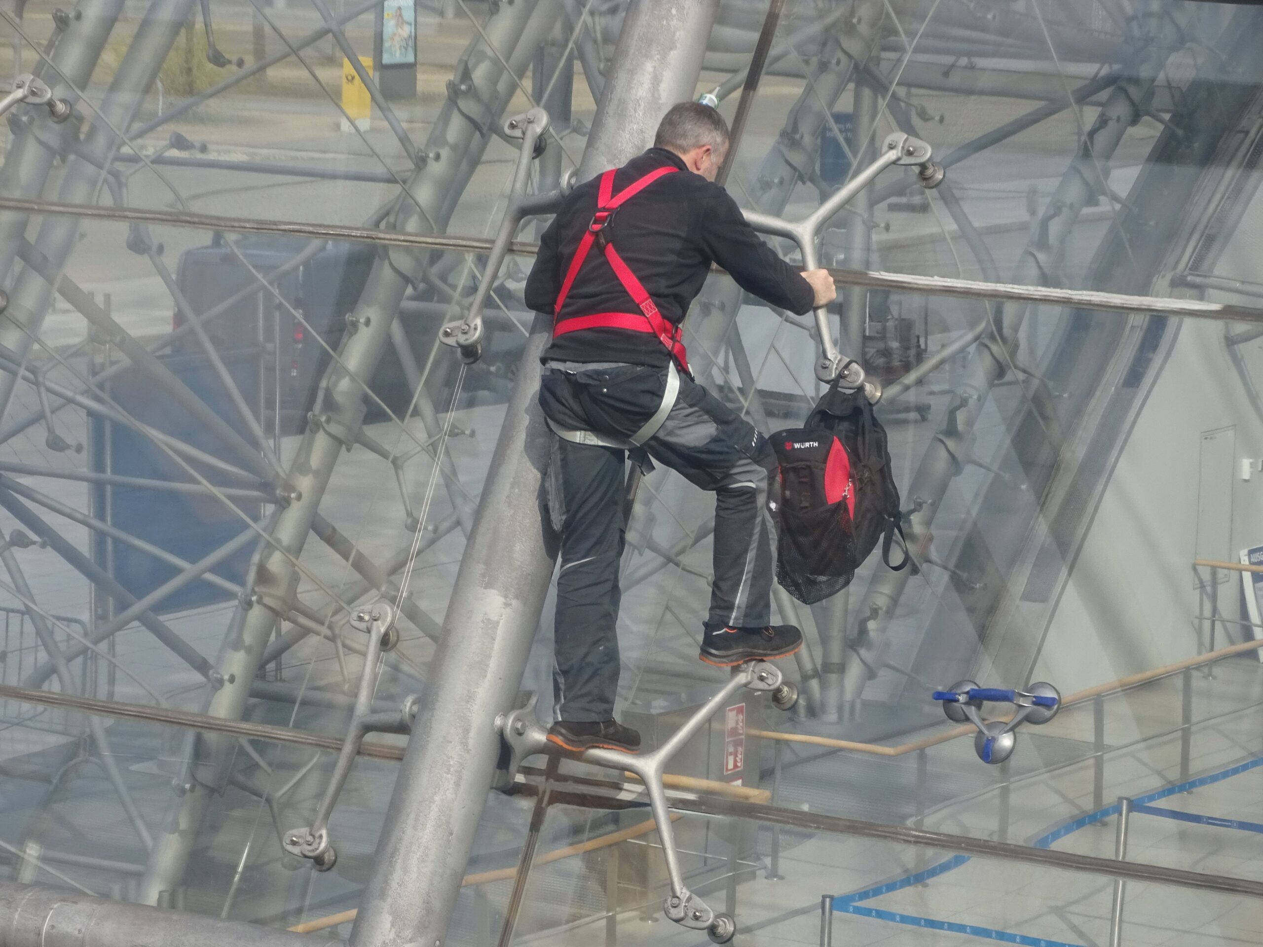 Draußen an der Fassade entdecke ich einen Freeclimber, der freiwillig putzt: