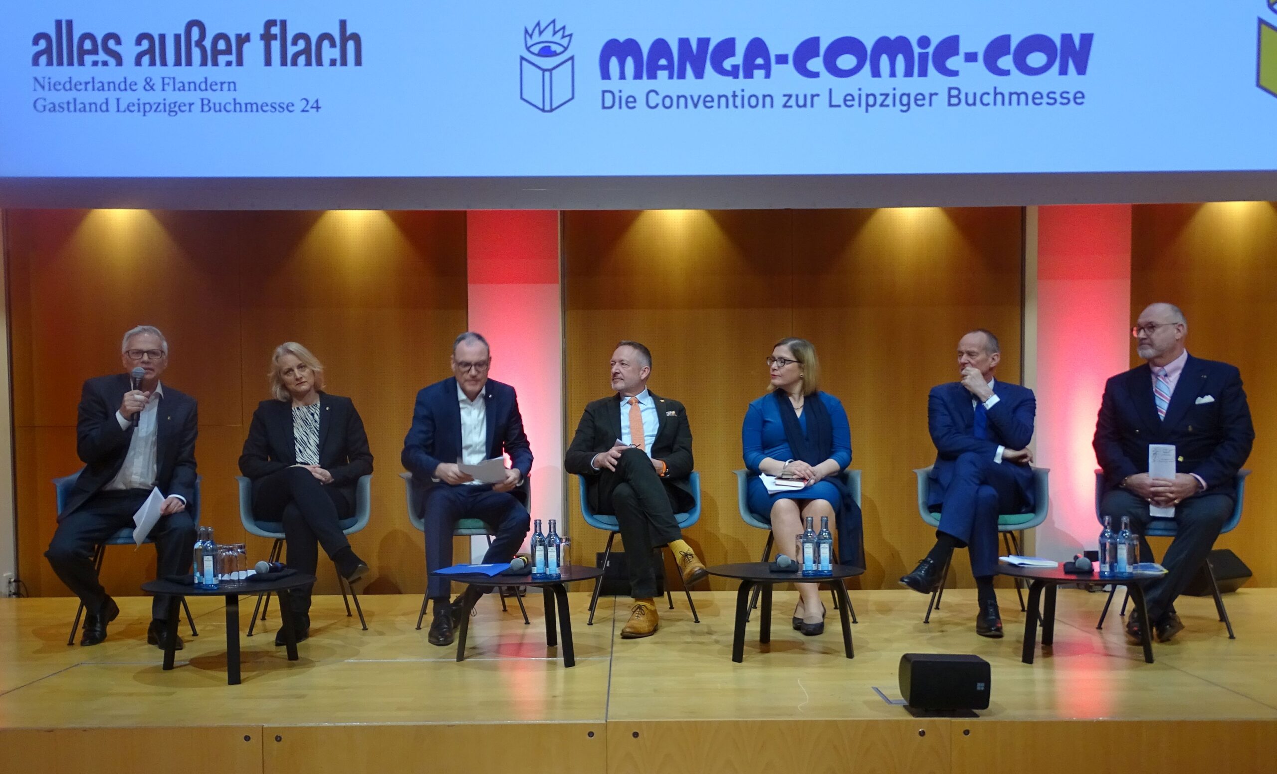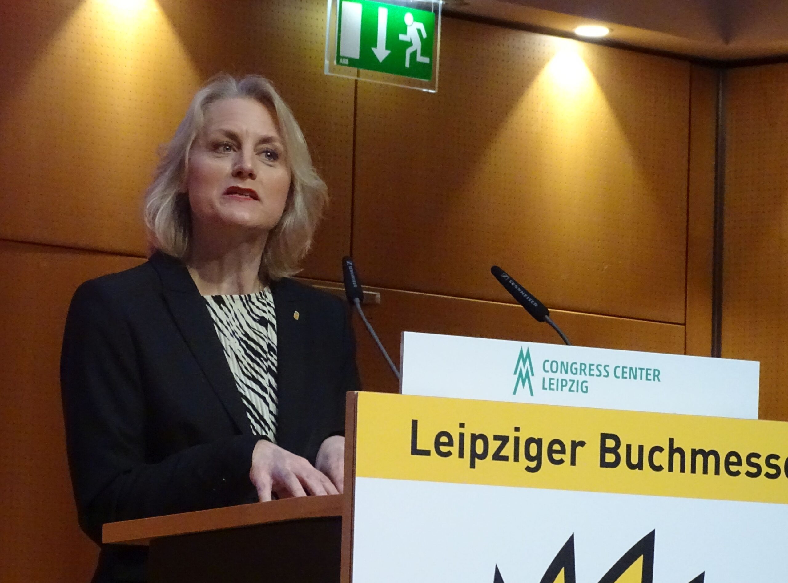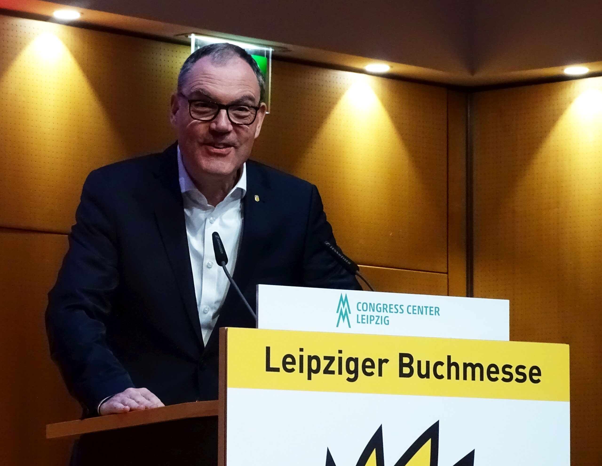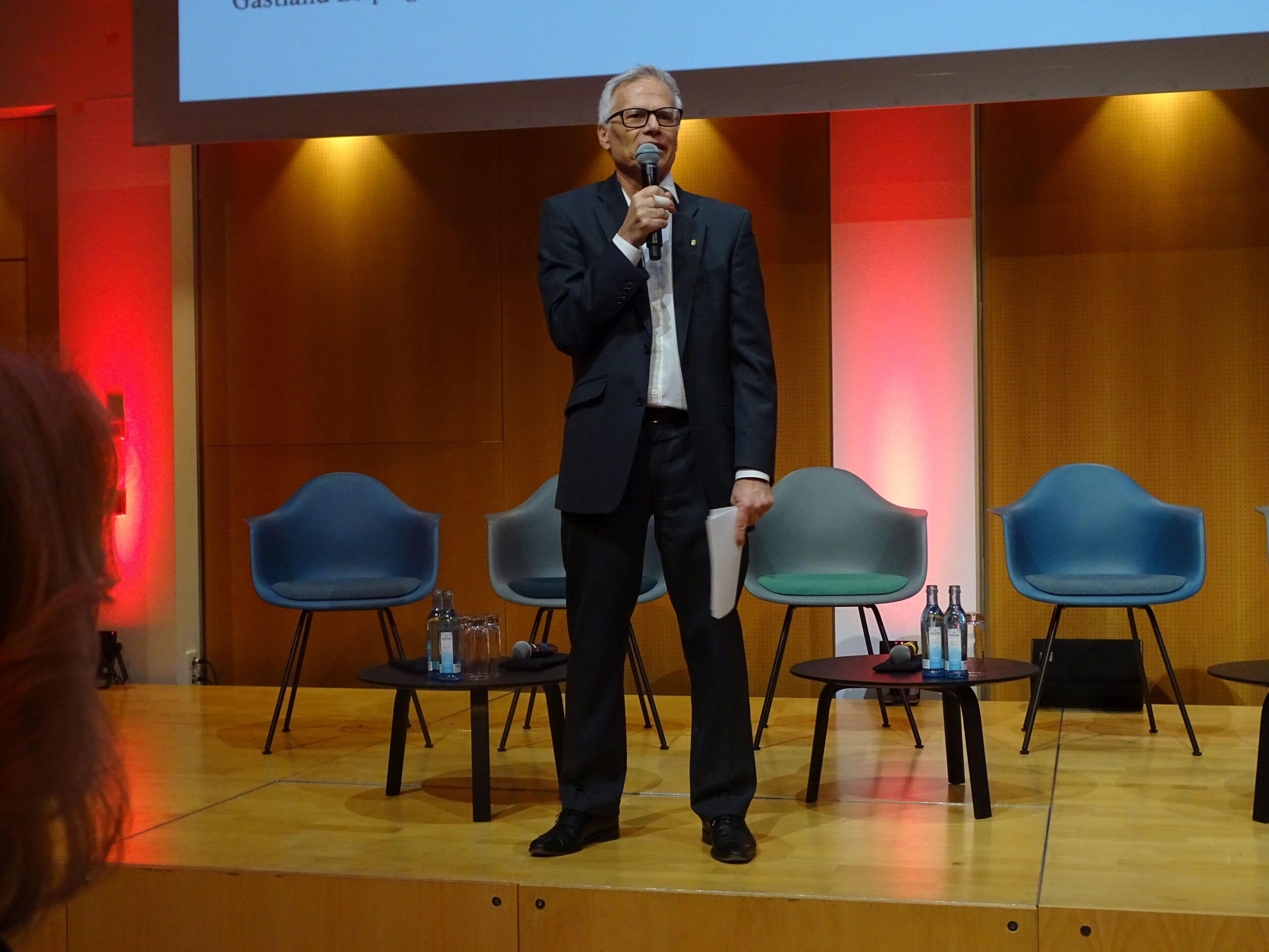 Um die Aufprallwirkung der neuen Messeleitung zu streuen, hat man extra die sonst obligatorischen Rednertische aufgelöst in eine Sitzgruppe, nutzlose Minitischlein und ein einzelnes Rednerpult. Das erfordert mehr Choreographie, als man vorausgesehen hat, und der Wechsel zwischen Moderator und Rednerbegehung des Pultes geschah entsprechend linkisch. Ein Staksen und Deuten.