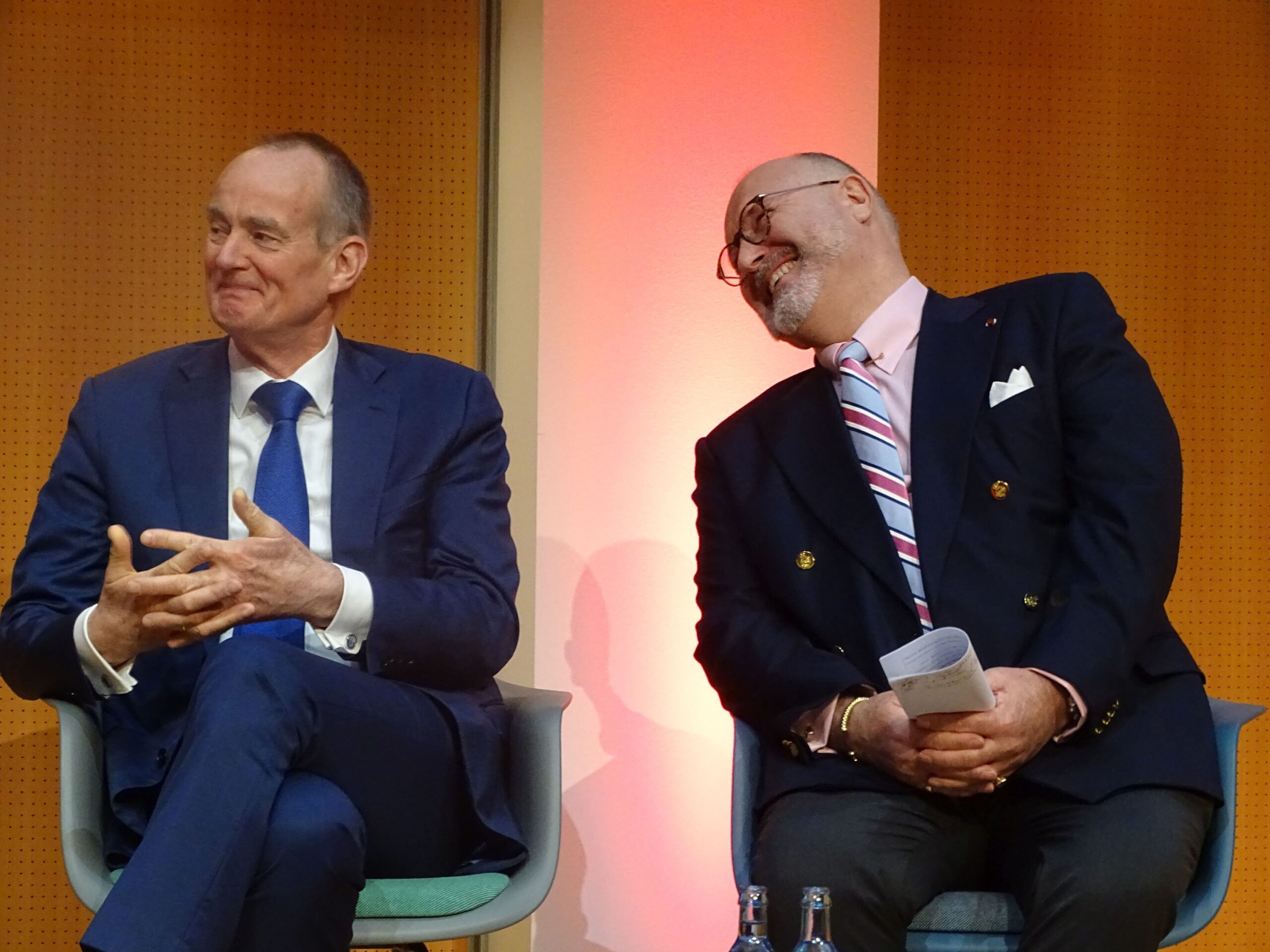 Die Tischlosigkeit führte zudem zu einem Beschoßen der Dokumente: Blätter, Cue Cards und Mikrofone mussten alle beidhändig auf zusammengepressten Oberschenkeln balanciert werden, was ich also ebenfalls sehr loben muss, weil deutlich zu sehen war, wie sehr alle ihre Rednertische vermissten.