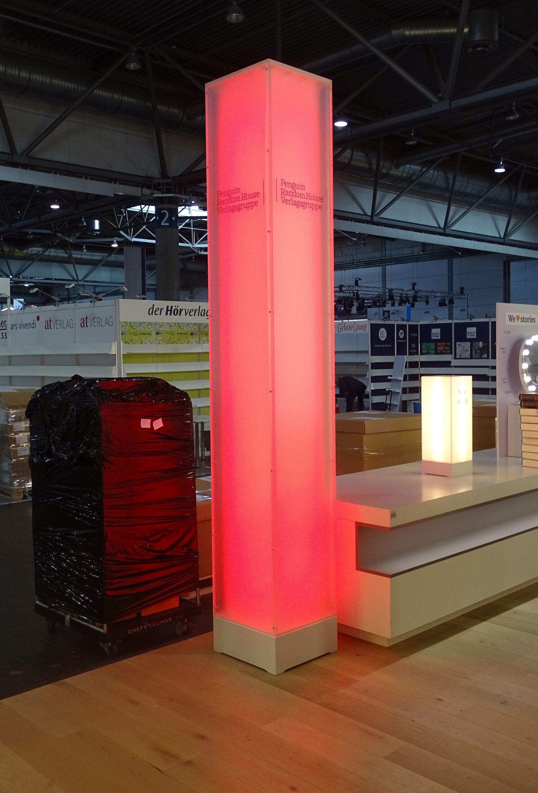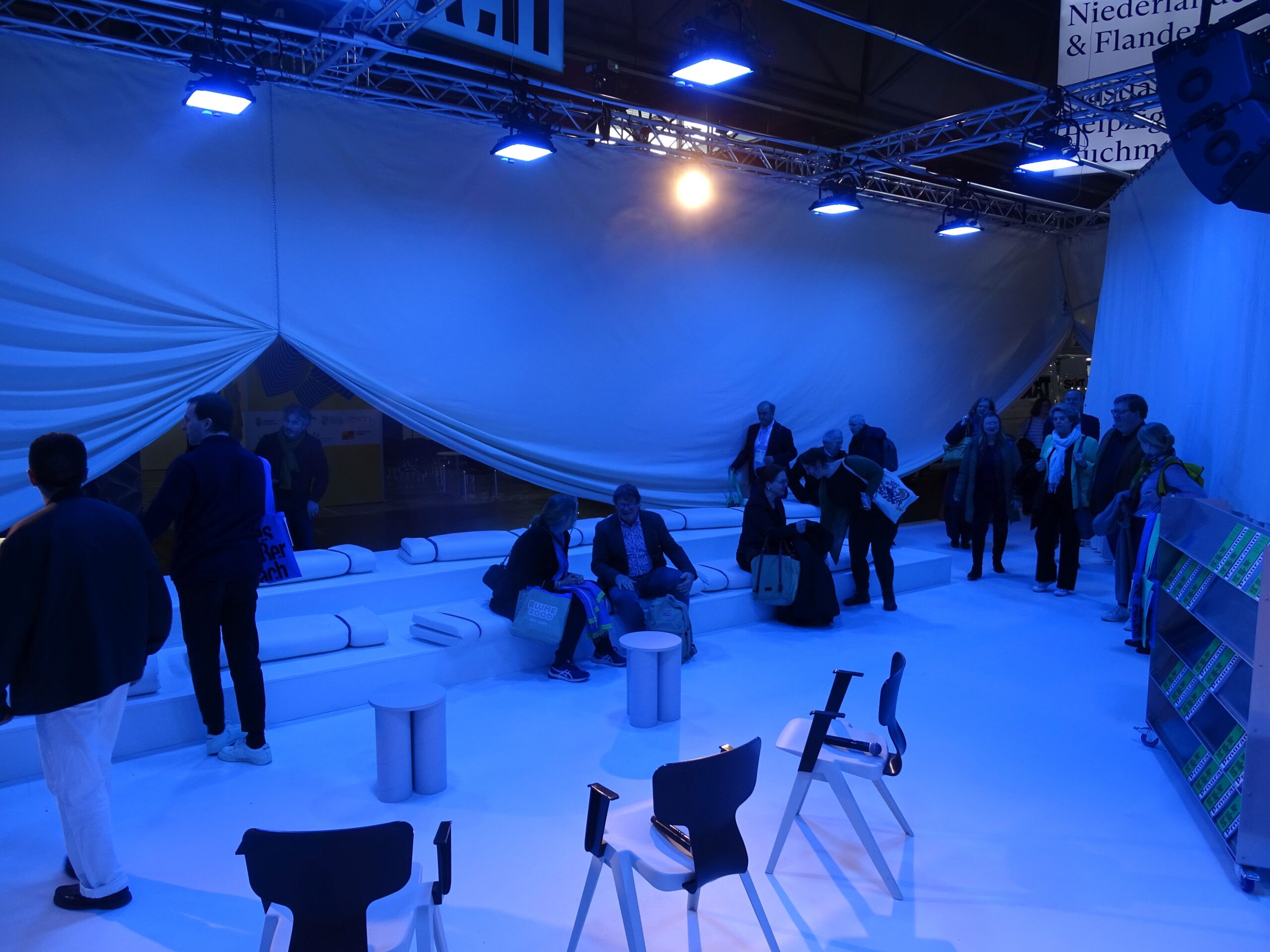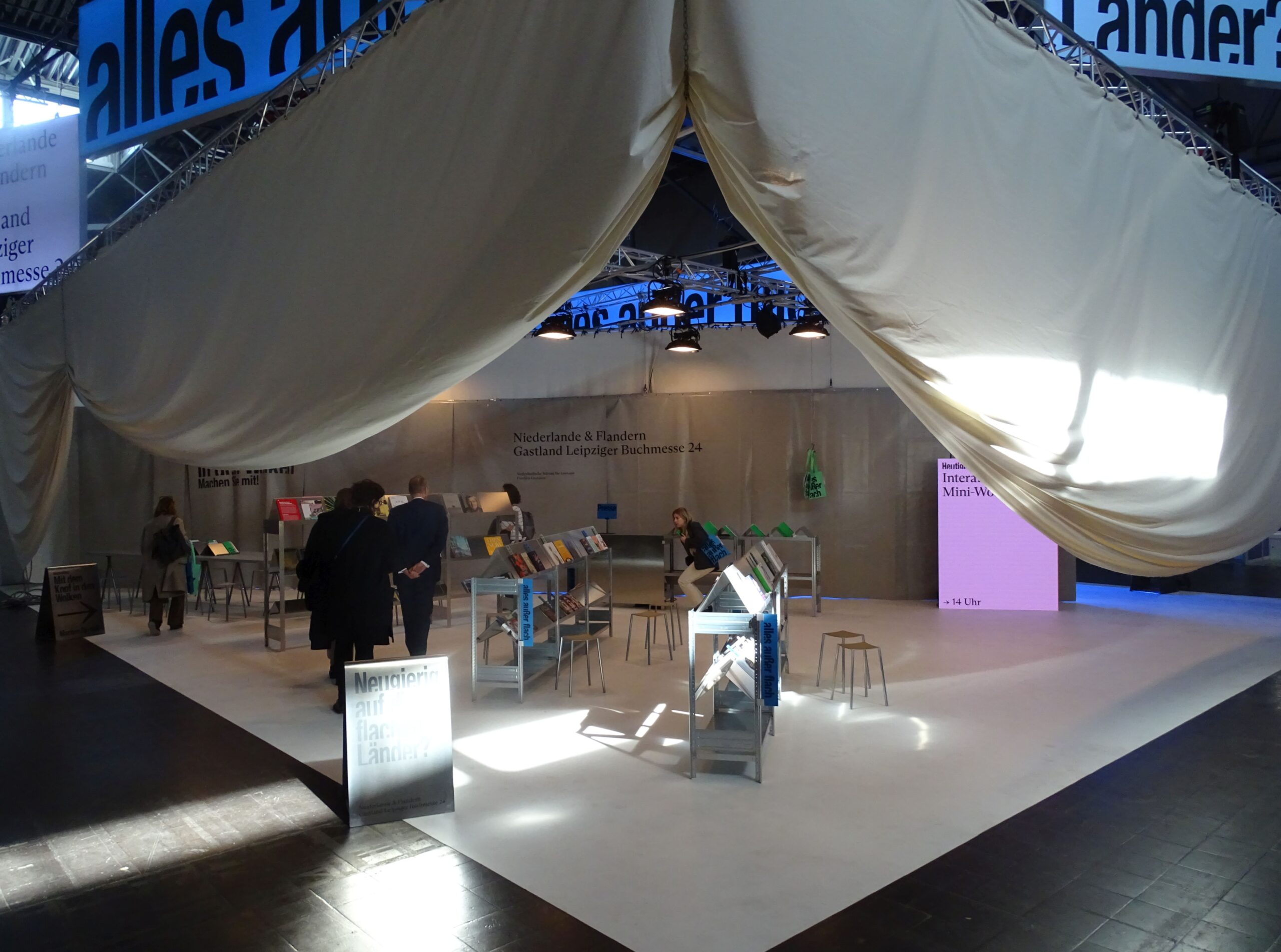 Der Messestand des Gastlandes arbeitet mit dicken Tüchern und intensivem Licht: