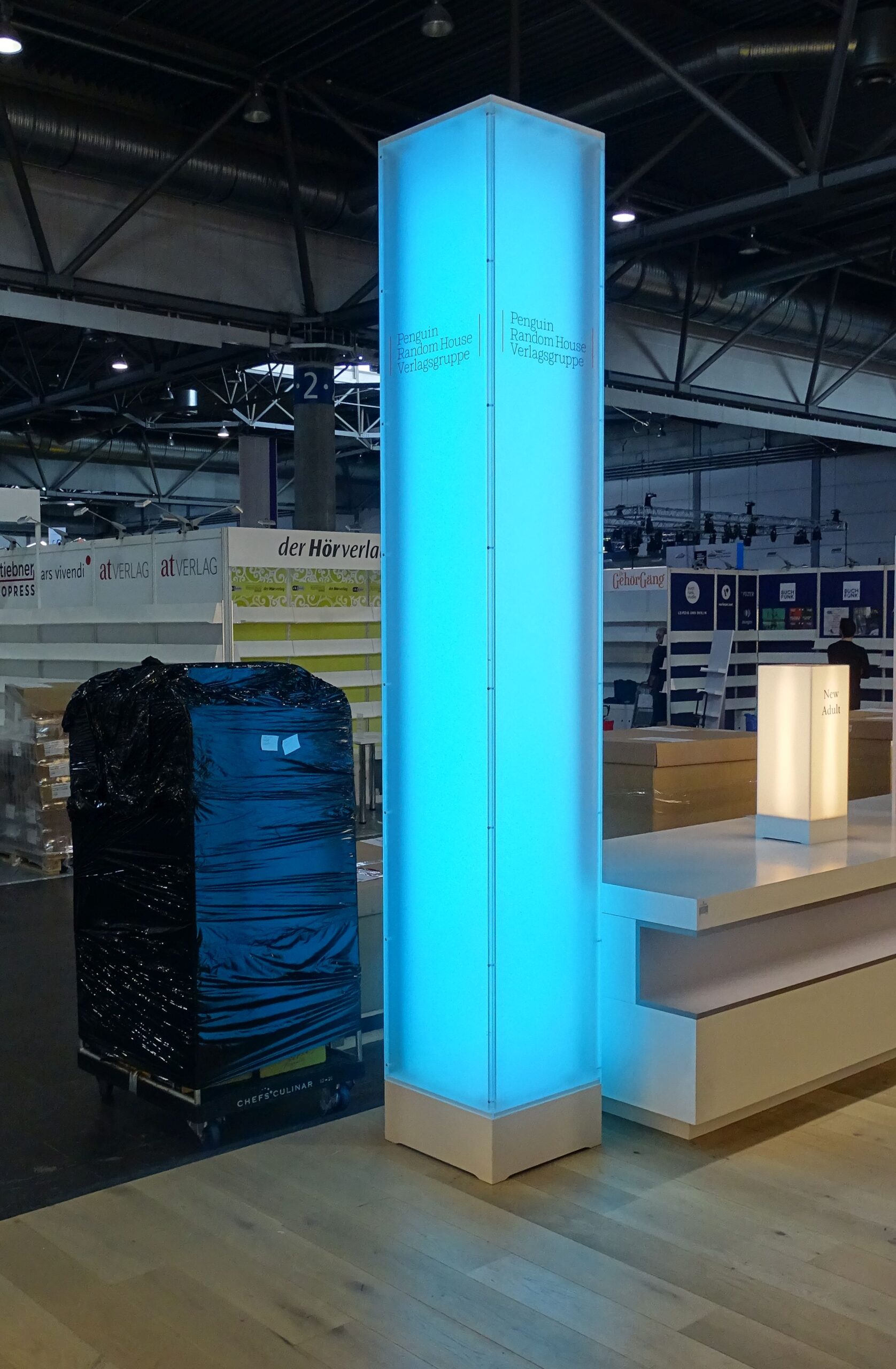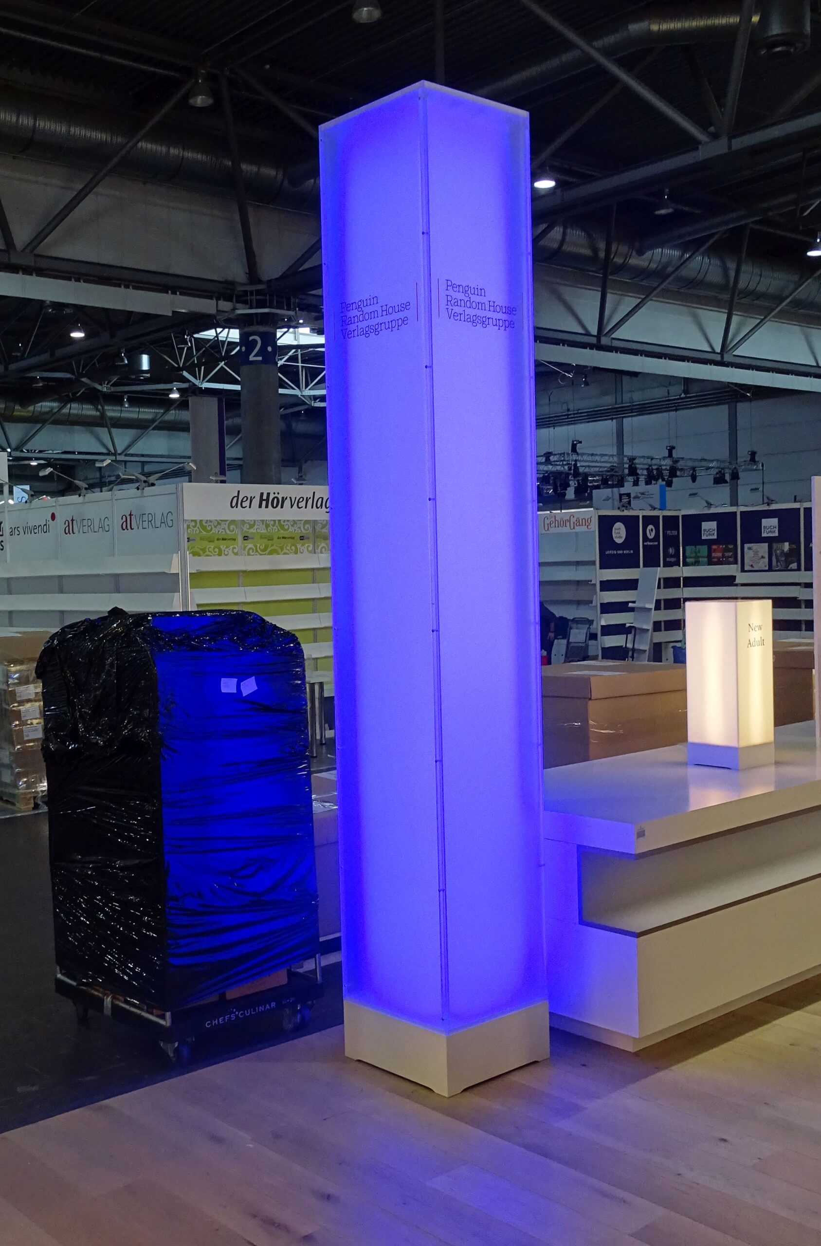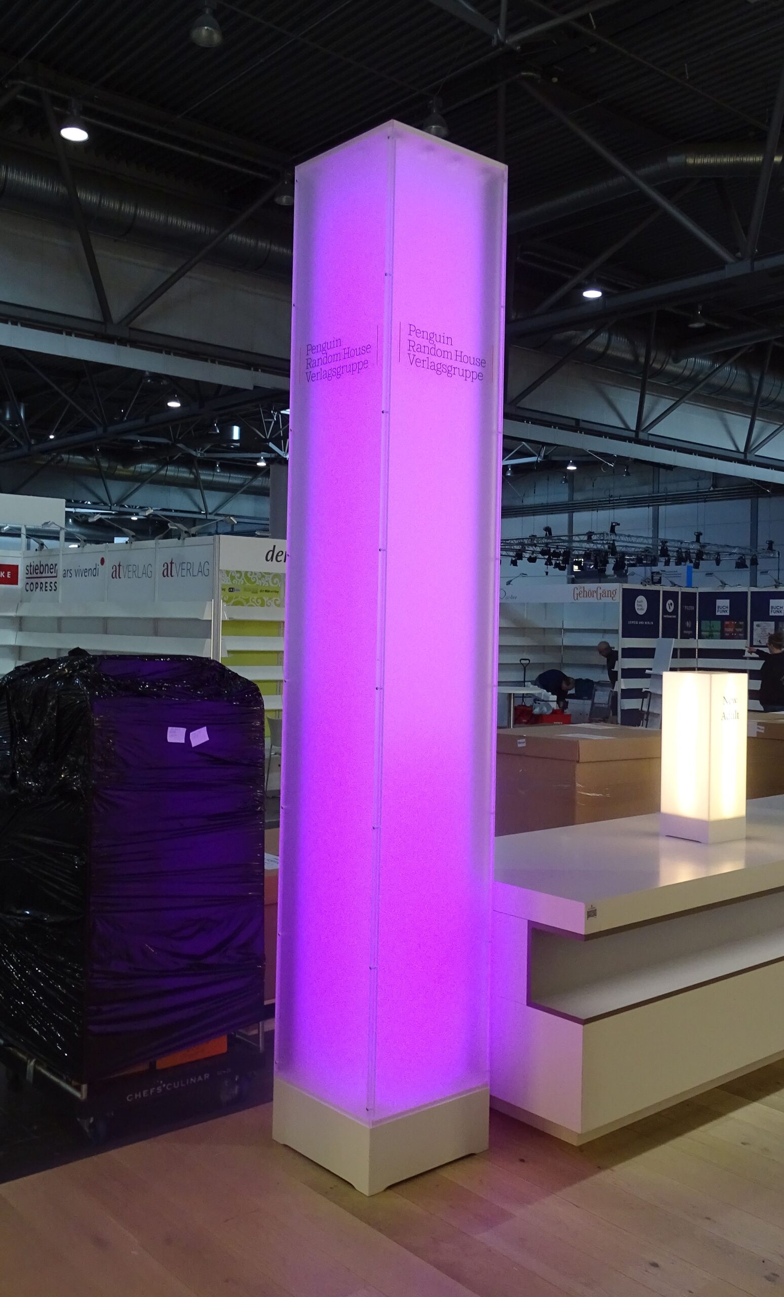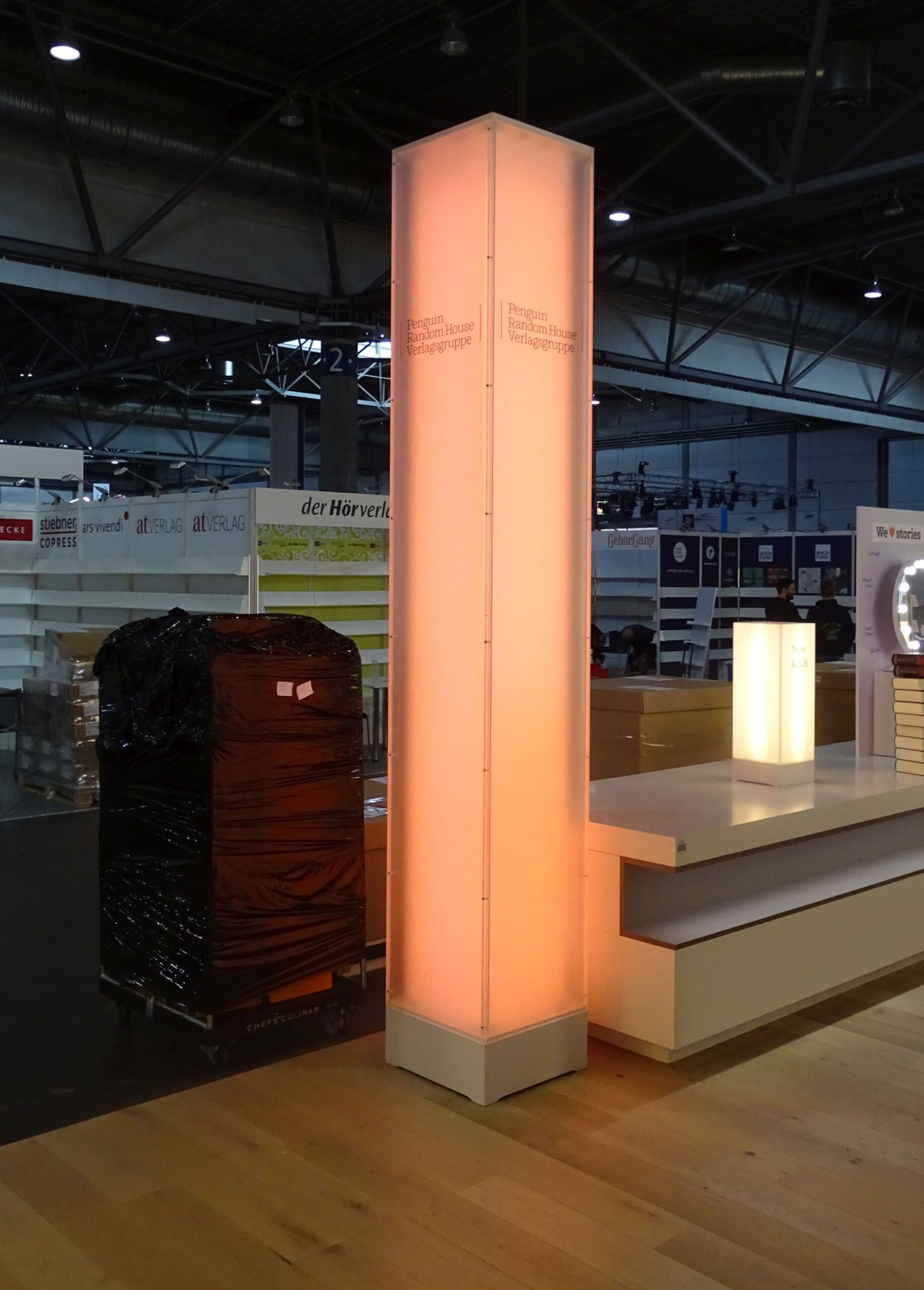 Der Messestand des Gastlandes arbeitet mit dicken Tüchern und intensivem Licht: