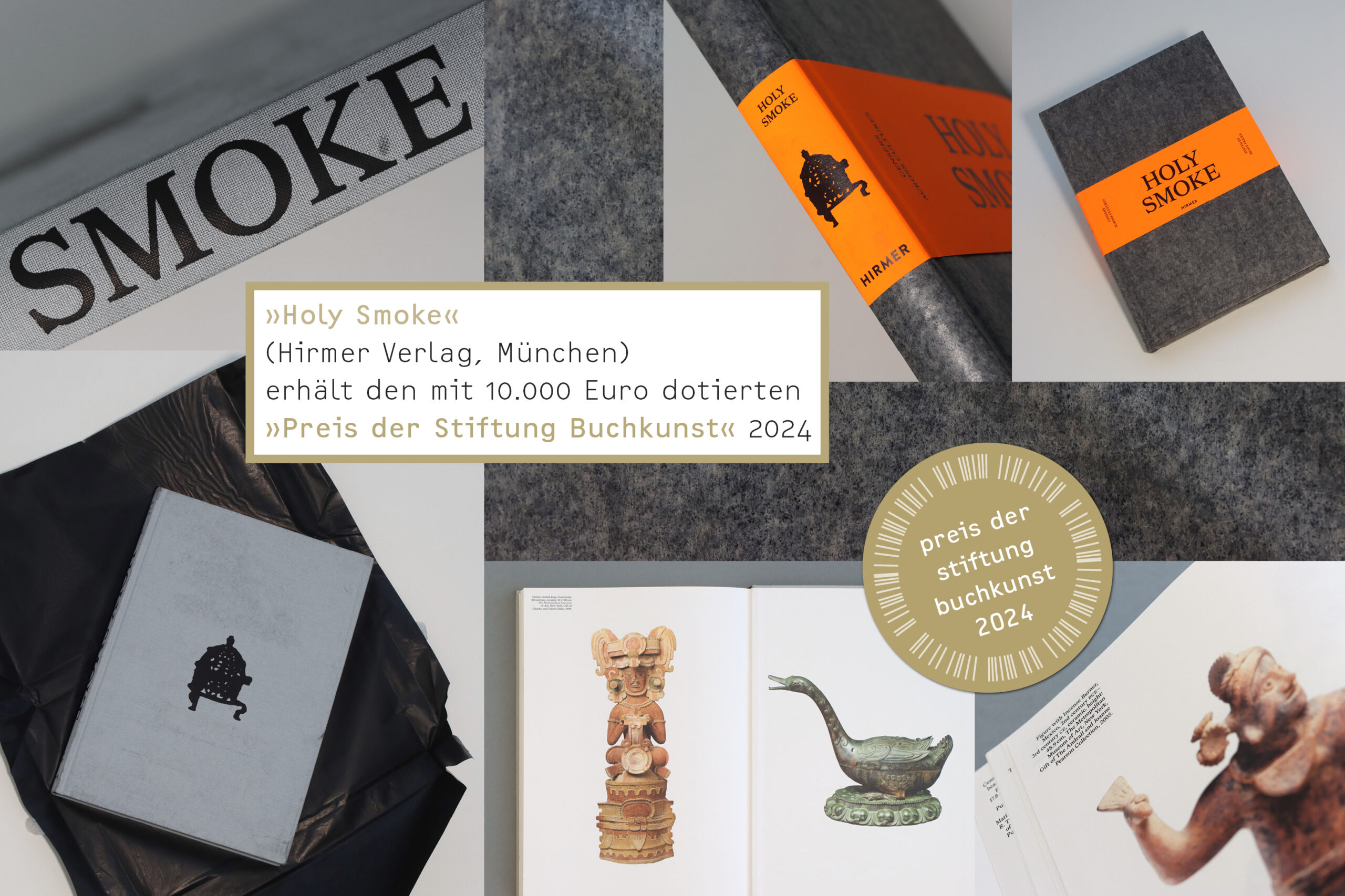 »Holy Smoke macht die Verpackung zur Metapher: Eine leuchtorange glühende Banderole umringt das in Kohlepapier eingeschlagene Buch. Man entfernt die Banderole und befreit den Band vom flatternden Durchschlagpapier. Während dieser Prozedur legt sich die Schwärze auf die Finger und man selbst hinterlässt seine Spuren auf dem grauen Einbandgewebe des druckfrischen Werks. Auf diese Weise wird es zum Unikat. Kultischer Rauch ist Träger von Botschaften des Menschen an höhere Instanzen. Thema des Buches sind die Gefäße seiner Zubereitung und ihre Rolle in verschiedenen Religionen und Epochen.