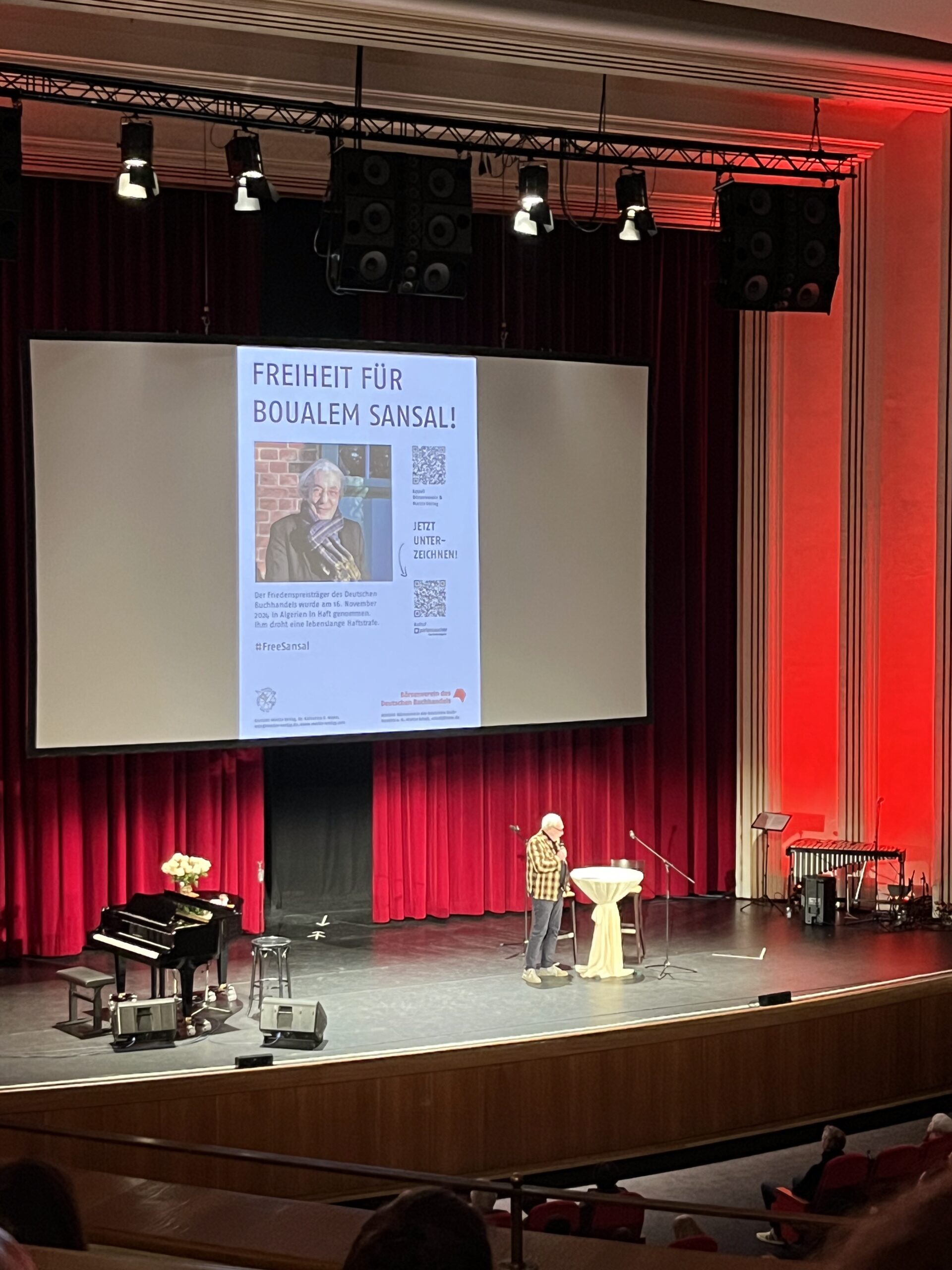 Ein ganzes Potpourri aus Künstler:innen, Literat:innen, Schauspieler:innen und Musiker:innen haben sie eingeladen, durch den Abend führt die befreundete Kabarettistin Gerburg Jahnke, die den Abend mit einem Gedicht auf die beiden Protogonist:innen und Gastgeber:innen des Abends einleitet. Es steckt viel Ruhrpott und Humor in diesem Abend mit Darbietungen unter anderem von Kabarettist Fritz Eckenga oder beim Quiz mit den Schauspieler:innen Till Beckmann und Jenny Ewert. Gute Live-Jazz-Musik inklusive Vibrafon gibt es unter anderem von Stefan Bauer und Michael Heupel. Aber es wird auch politisch. Politikwissenschafts-Professor Claus Leggewie bittet für die Unterstützung einer Petition für die Freilassung des inhaftierten Preisträger des Friedenspreises des deutschen Buchhandels Boualem Sansal und die syrische Dichterin Linah Atfah, die in Wanne-Eickel wohnt (Gerburg Jahnke dazu: „Köln kann jeder, Wanne muss man wollen“), spricht über den Fall des Assad-Regimes.