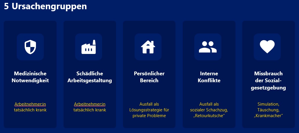 Im zweiten Schritt geht es um das Bewusstsein, dass Fehlzeiten deutlich stärker beeinflussbar sind, als die meisten Führungskräfte und Unternehmen denken. Der allseits bekannte Ausspruch „Krank ist Krank!“ ist ein unbegründeter Glaubenssatz. Denn drei von fünf Ursachen für Fehlzeiten sind sogar direkt durch aktive Führung beeinflussbar.