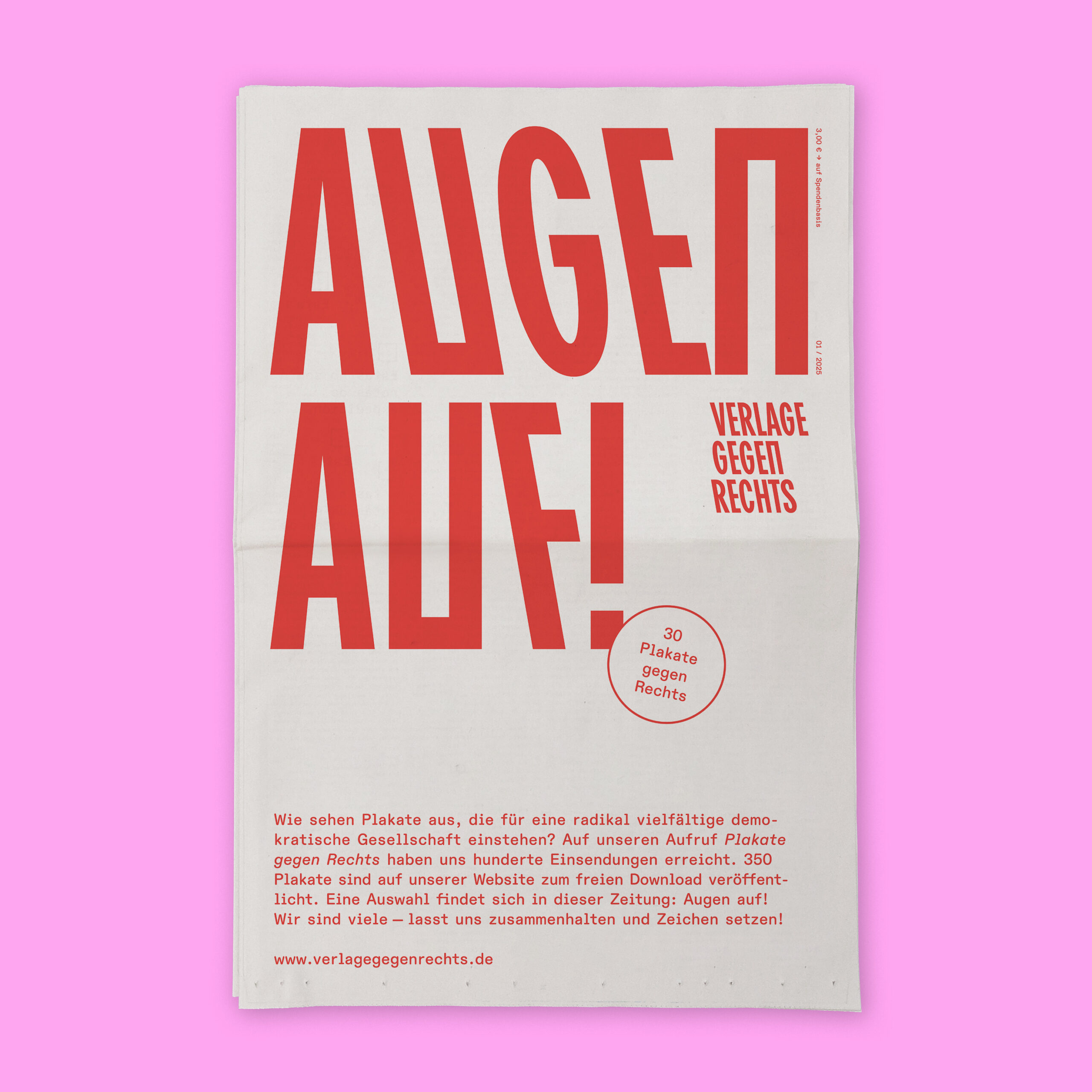 Zudem ist im Januar 2025 ein Publikationsdebüt in Form der Plakat-Zeitung „Augen auf!“ erschienen. Enthalten sind 30 lautstarke Plakate gegen Rechts, eine textliche Einordnung des Projekts und eine Anleitung zum Plakatieren. Die Plakat-Zeitung und ein gedrucktes Plakat-Set kann gegen Spende über die Website bestellt werden.