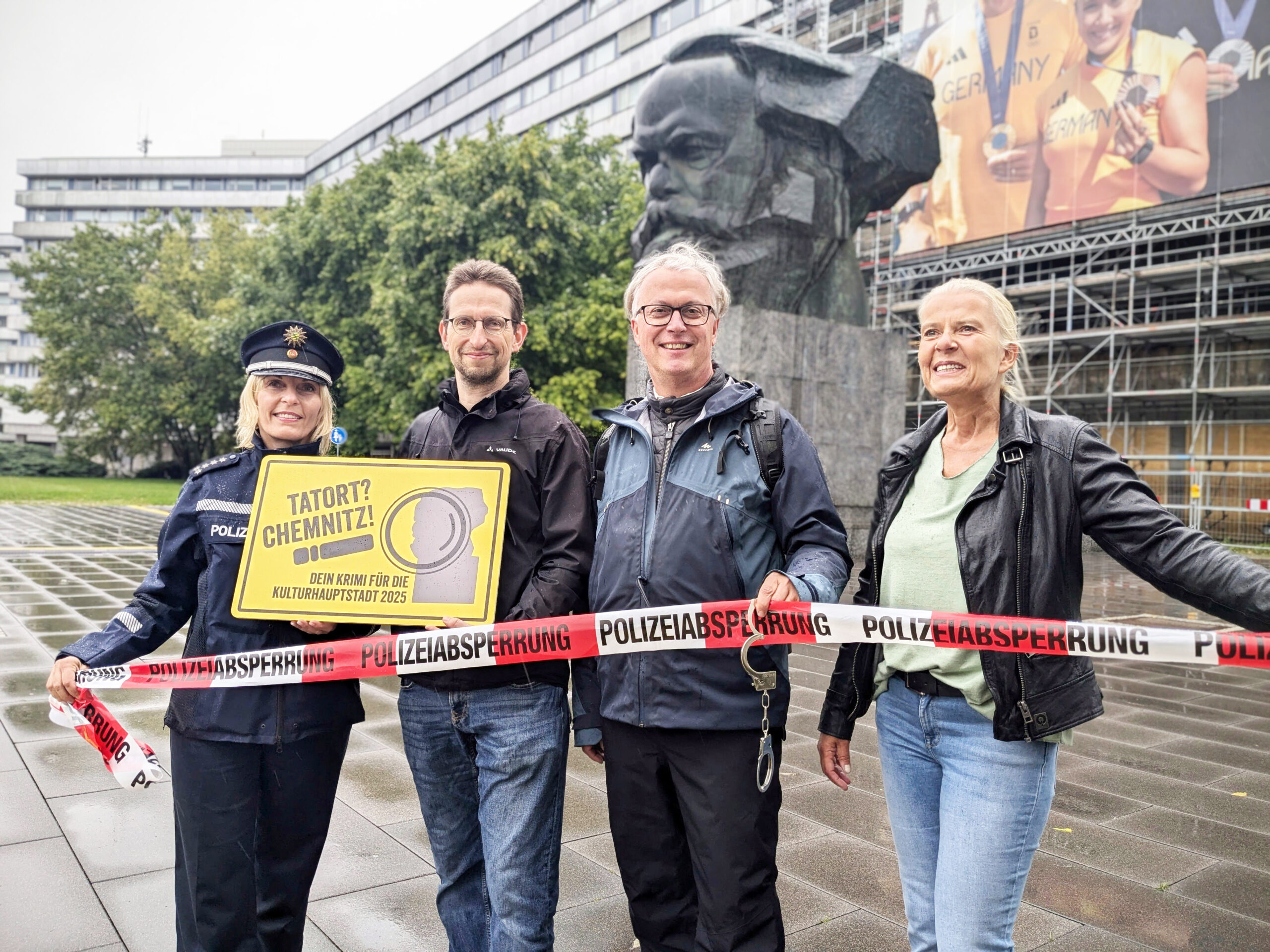 Chemnitz kriminell. Unterm strengen Blick von Karl Marx – der als überlebensgroße Bronzeplastik in der sächsischen Stadt steht – hat die Jury für Krimiwettbewerb „Tatort? Chemnitz!“ Platz genommen. Das Foto zeigt (v.l.n.r.) die Juror:innen Jana Kindt (Erste Polizeihauptkommissarin, ehemalige Pressesprecherin und jetzt Leiterin Fachdienst Prävention der Polizeidirektion Chemnitz), Prof. Dr. Frank Asbrock (Direktor des Zentrums für kriminologische Forschung Sachsen), Uwe Hastreiter (Stadtbibliothek Chemnitz), Prof. Dr. Bernadette Malinowski (Professorin für Neuere Deutsche und Vergleichende Literaturwissenschaft an der Technischen Universität Chemnitz). (Foto: Jens Korch)