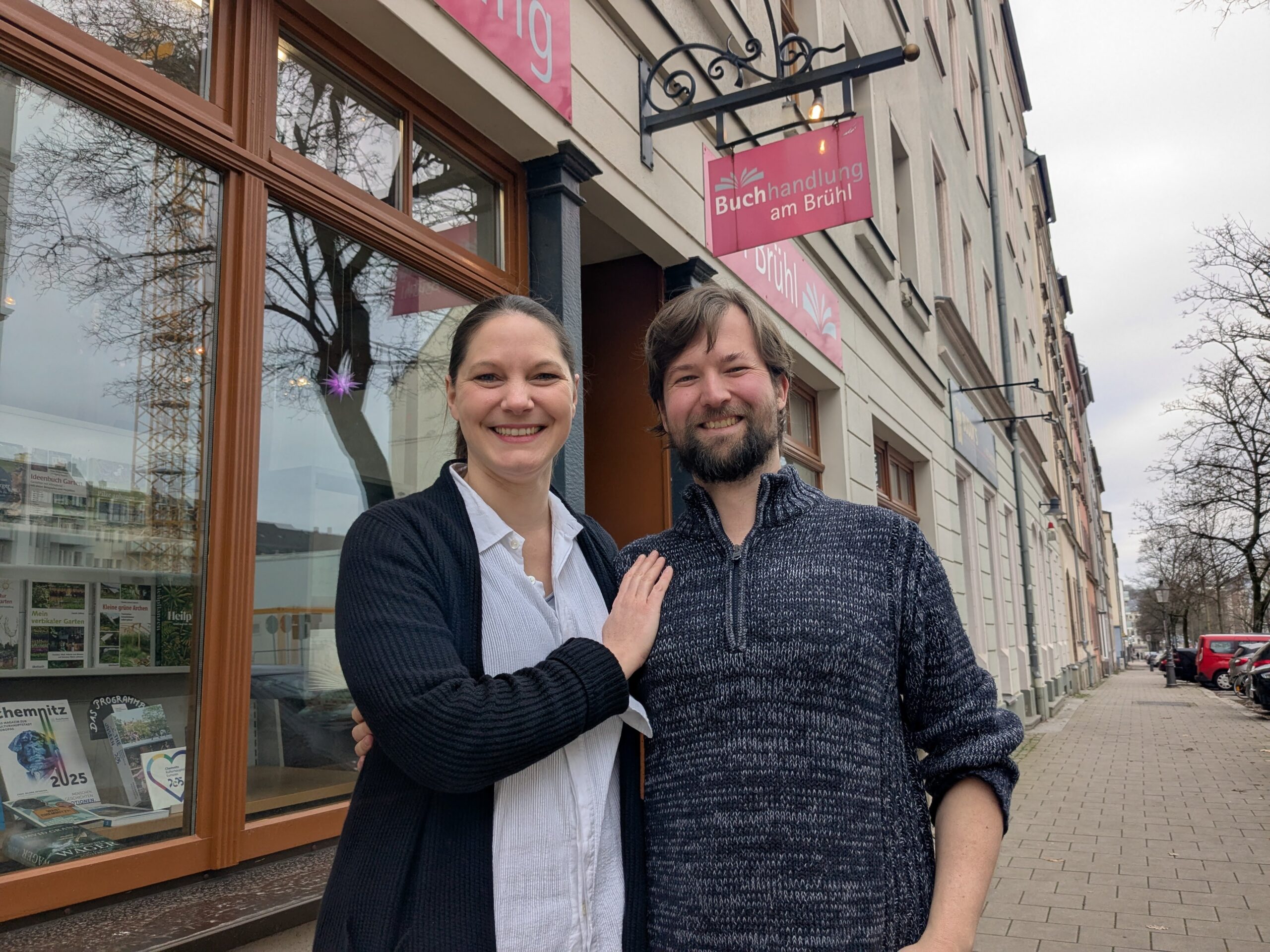 Beispiel Brühl – eine zu DDR-Zeiten angelegte Einkaufs– und Flaniermeile am Rand der Innenstadt. In der Elisenstraße sorgen Tina Kniep und Maximilian Gräber seit wenigen Monaten für die literarische Grundversorgung. Beide kommen aus der Nähe von München, haben bei einem Besuch in Chemnitz einen frisch geschlossenen Buchladen entdeckt. Worauf sie den ehemaligen Betreiber:innen kurzerhand eine Email schickten und Interesse bekundeten … Alte und neue Besitzer:innen wurden sich schnell einig. Kniep und Gräber haben Philosophie studiert, hatten zuletzt als Bürokraft und Lehrer gearbeitet. Und wagten nun den Neuanfang als Buchhändler:innen. Bilanz nach den ersten Monaten: „Uns gefällt es in Chemnitz – wir wollen hier nicht mehr weg“, sagen beide. Dass sie mit einer Übernahme den Buchladen gerettet haben, kommt indes nicht häufig vor, wie auch der Börsenverein als Branchenverband weiß.
