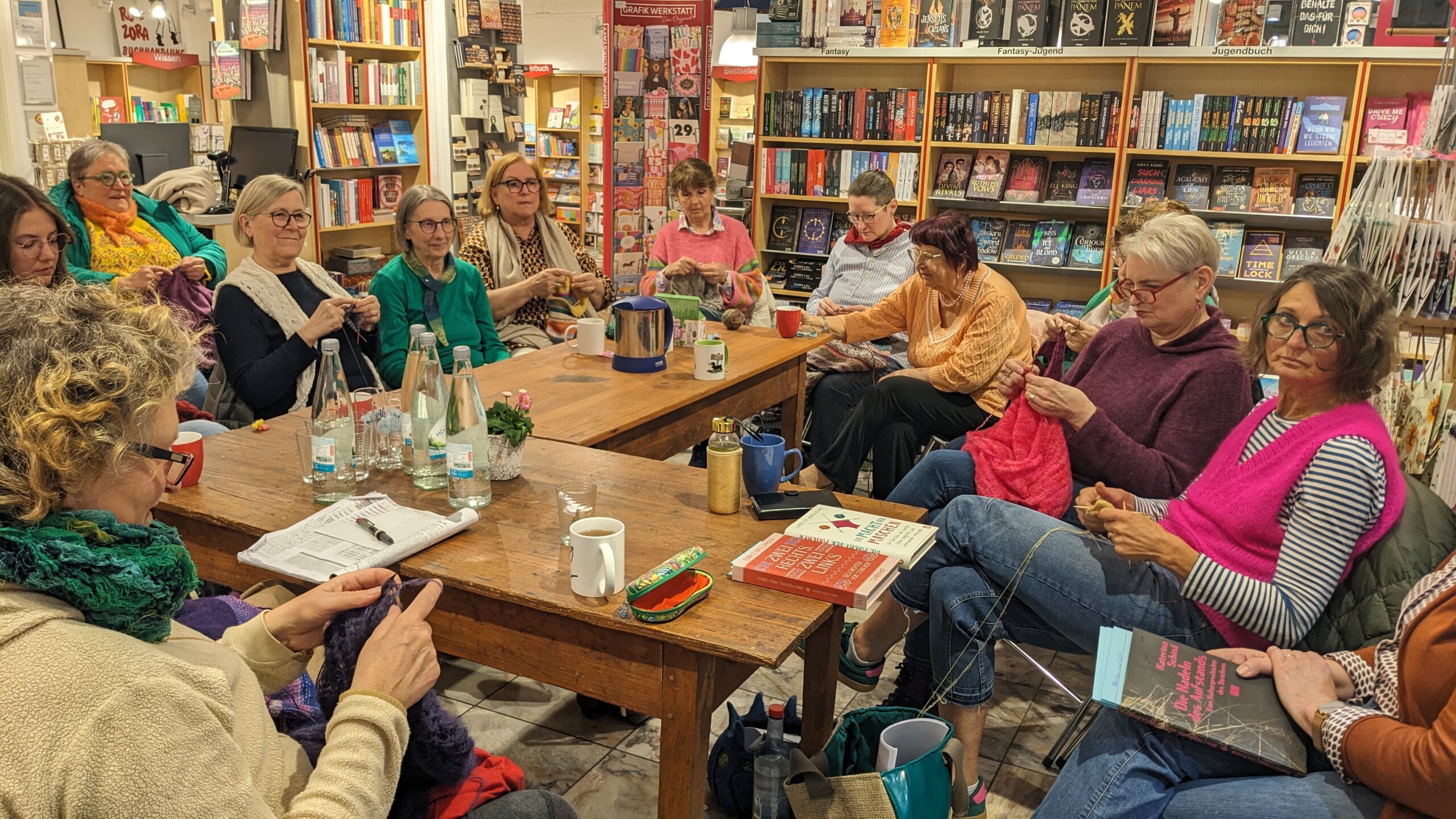 Nach 30 Jahren Strickpause habe sie die Stricklust wieder gepackt, erzählt Buchhändlerin Gertrud Selzer. Schade sei nur, dass man in dieser Zeit nicht lesen, aber zumindest ja Literatur hören könne. Diesen Ansatz hat die Buchhandlung Rote Zora im saarländischen Merzig nun zum Anlass für ihren neuen Strick-Lese-Club genommen. Das erste Treffen fand diesen Mittwochabend, 12.3., statt mit einem kleinen Vortrag der Kundin Therese Schmitt über „das Revolutionäre des Strickens“ ausgehend vom Buch Die Nadeln des Aufstands. Die Idee hinter dem neuen Lesekreis: