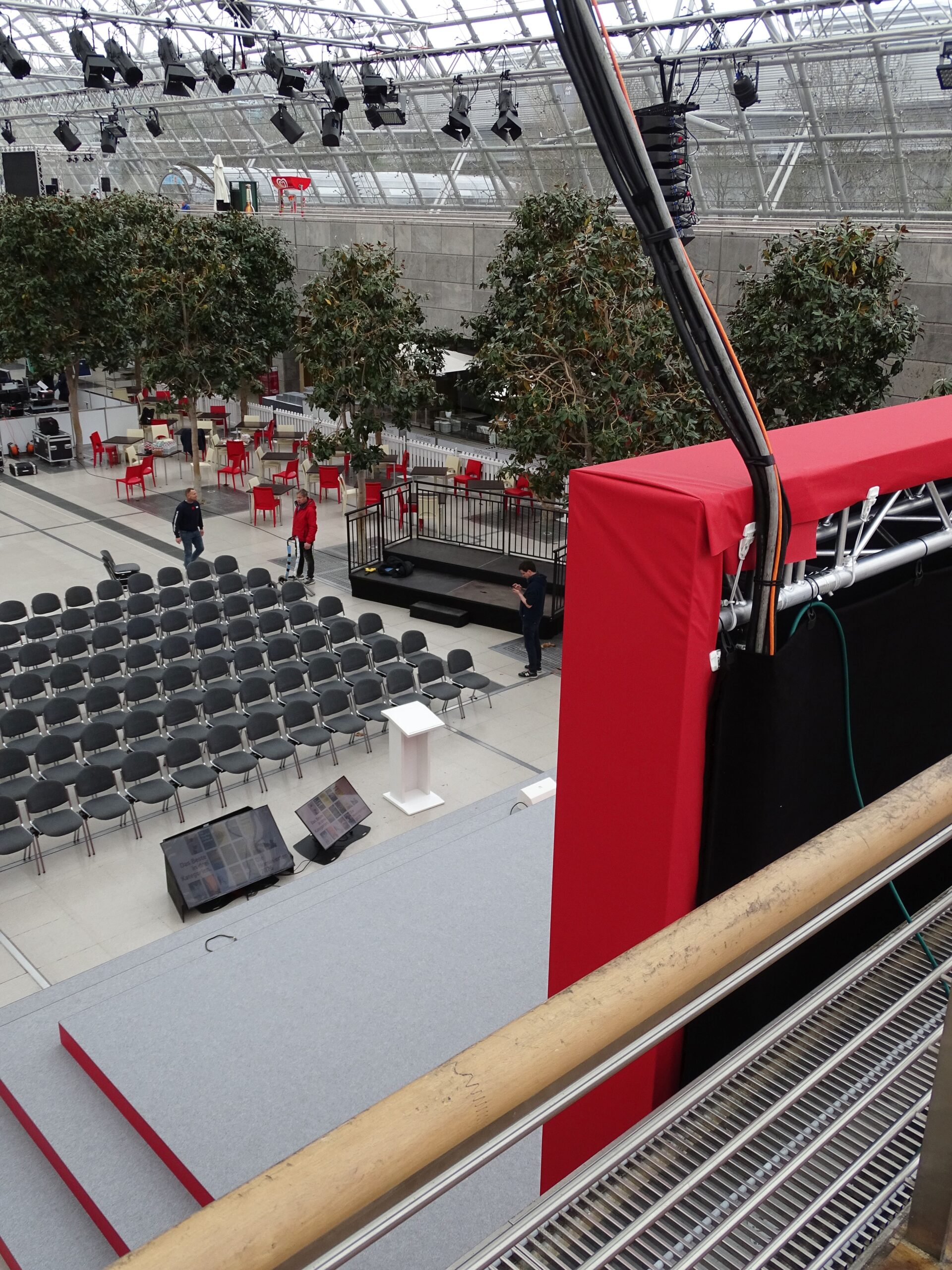Hier findet tatsächlich am Aufbautag ein Interview statt, mit Sound und Publikum, zwischen Gapelstaplern und zugigen Zufahrten. Vielleicht oder hoffentlich ist das auch nur eine Art Probe?