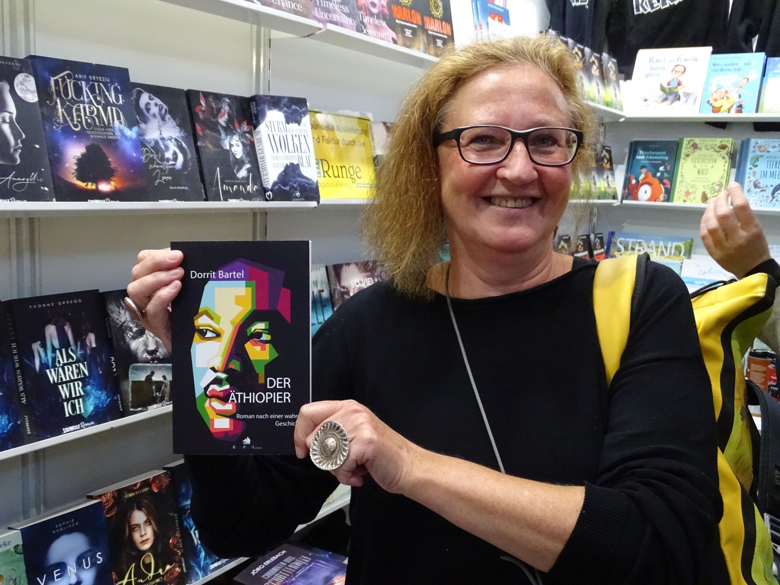 Ich treffe Katharina Opitz am Libro-Stand des Börsenvereins, dem Ort, der die Selfpublisher abgreifen will, bevor Arschmazon das tut.