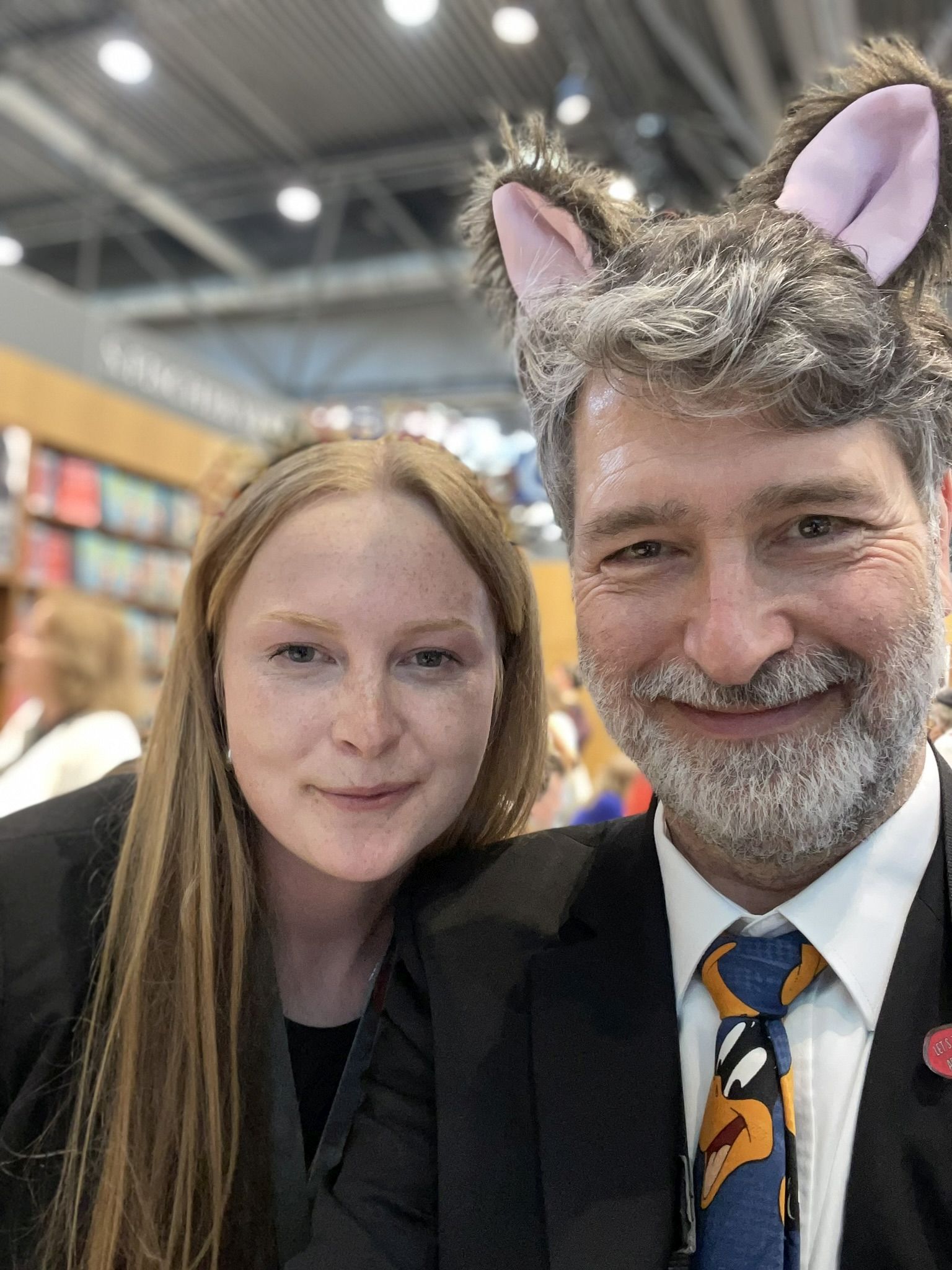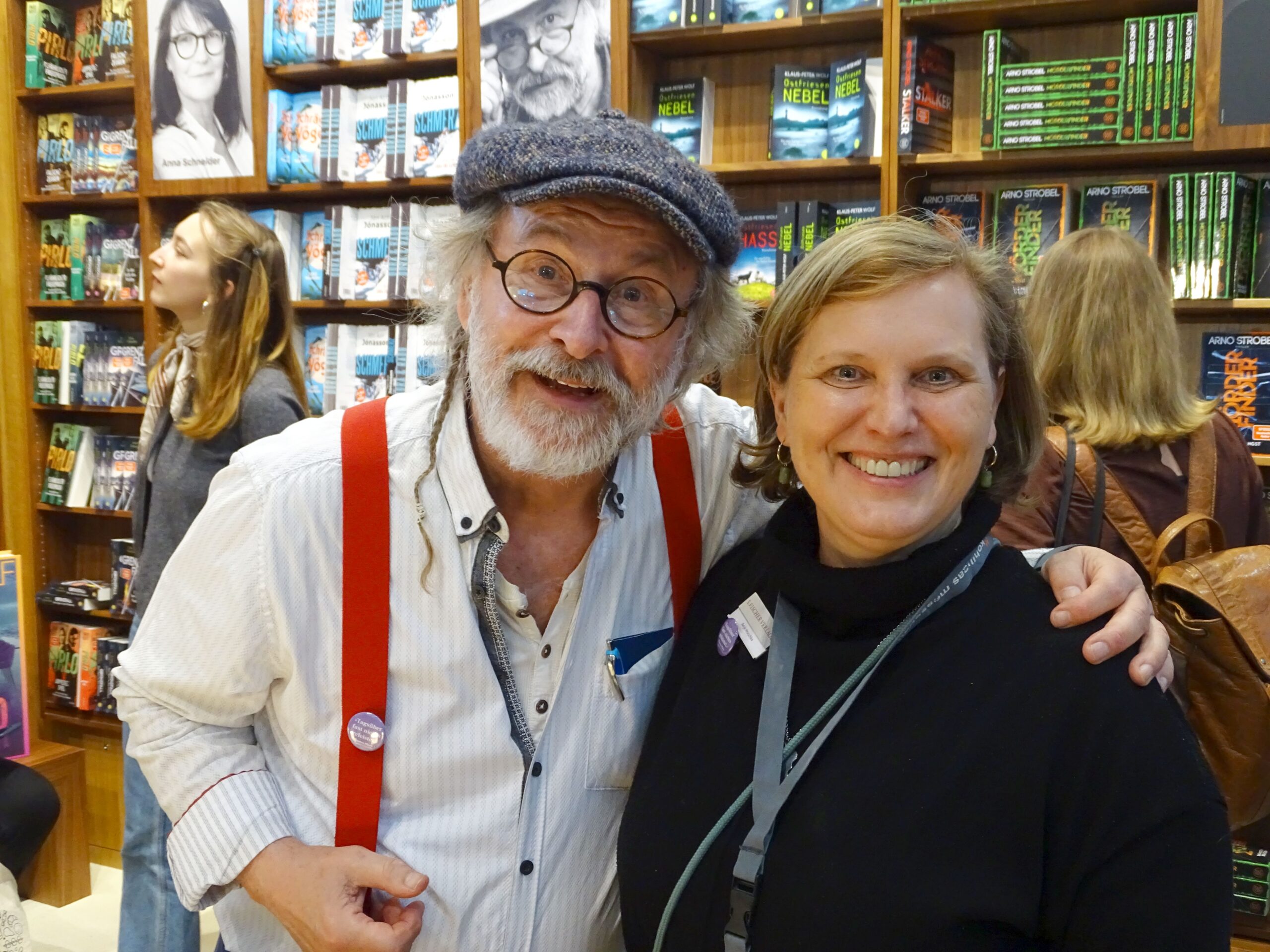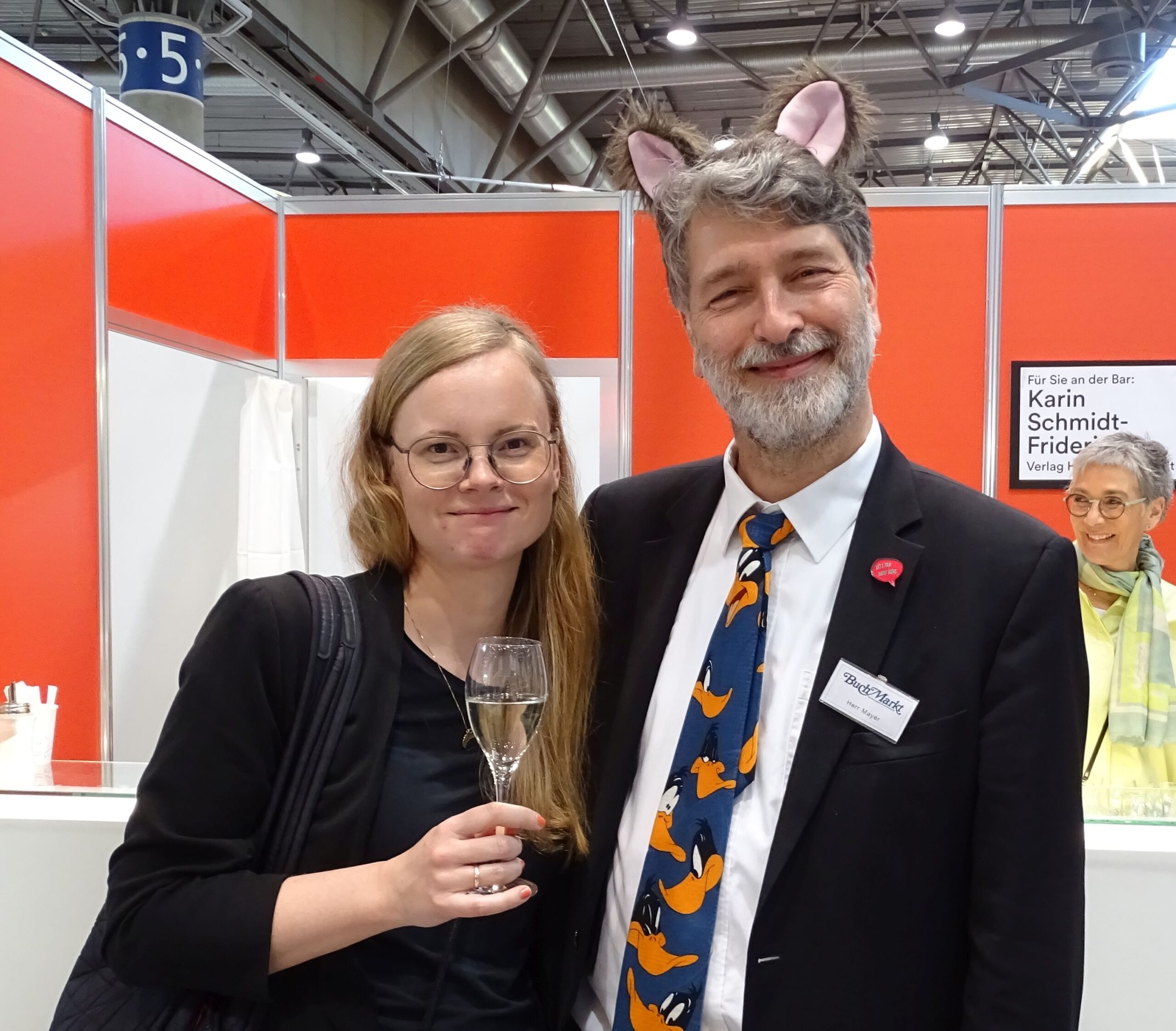 Als ich am Donnerstag Claudia Holzer vom Usborne-Verlag traf, verschoben wir unser Foto, weil wir dachten, am Stand von dtv sei eine bessere Gelegenheit. Alte Messeregel: Immer sofort das Foto machen. Nie verschieben.