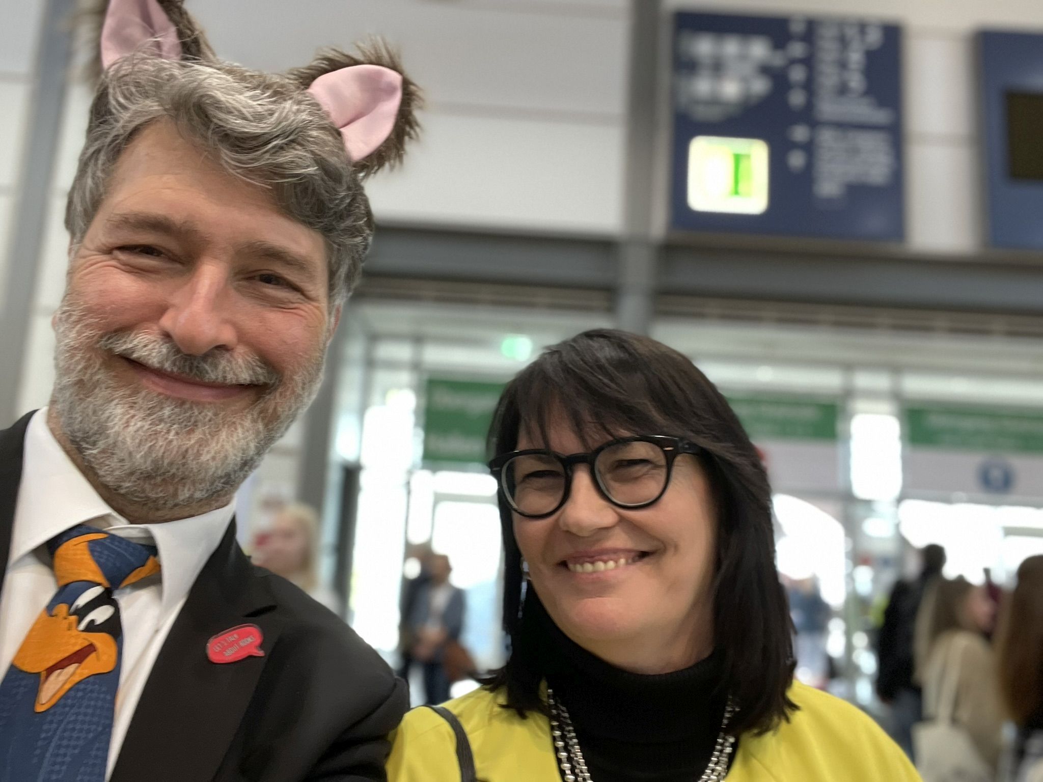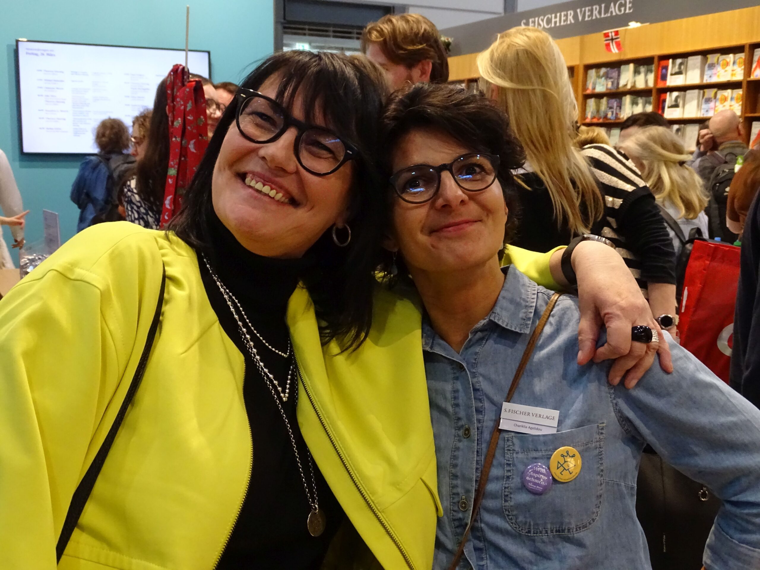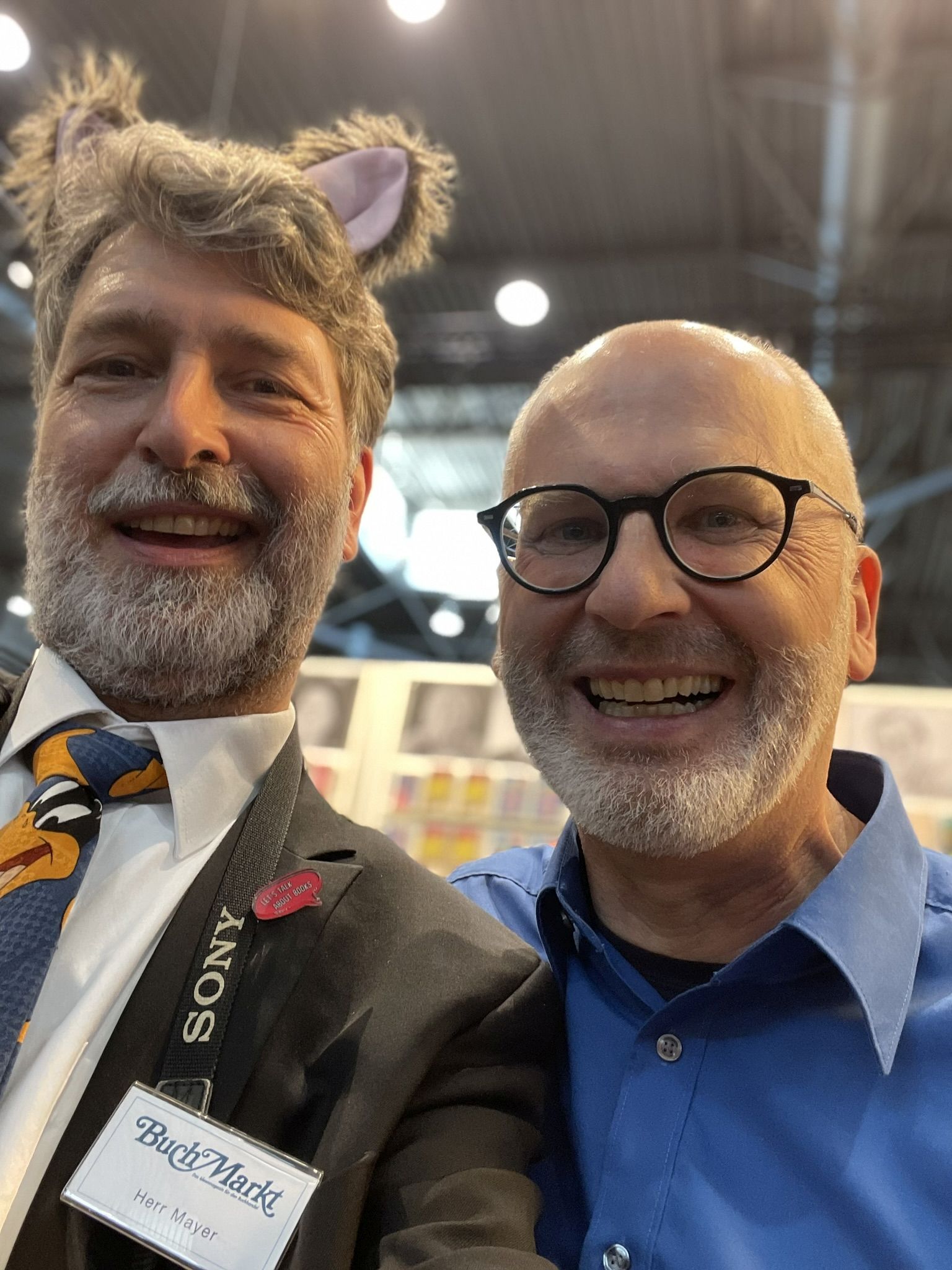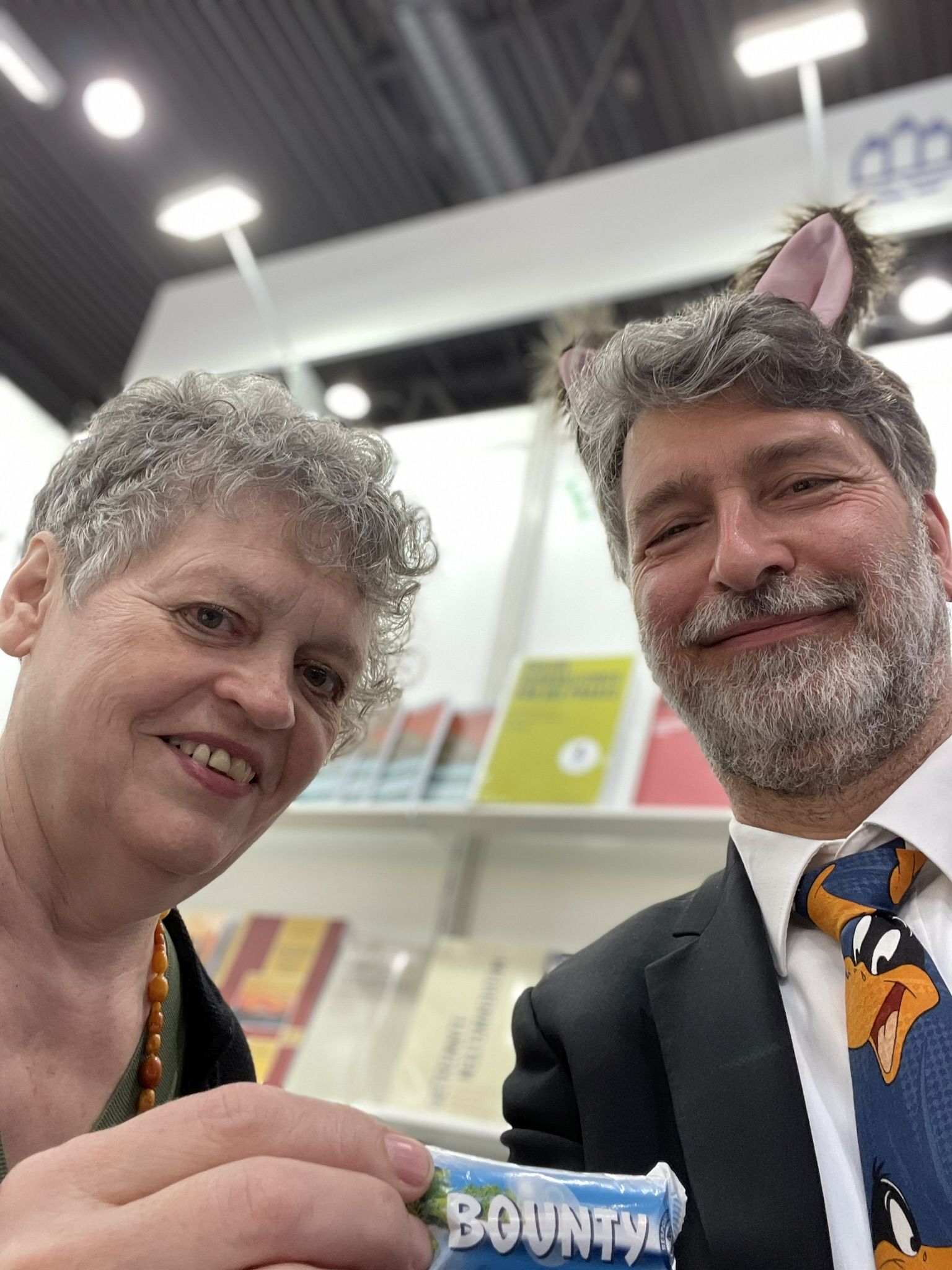 Als ich am Donnerstag Claudia Holzer vom Usborne-Verlag traf, verschoben wir unser Foto, weil wir dachten, am Stand von dtv sei eine bessere Gelegenheit. Alte Messeregel: Immer sofort das Foto machen. Nie verschieben.
