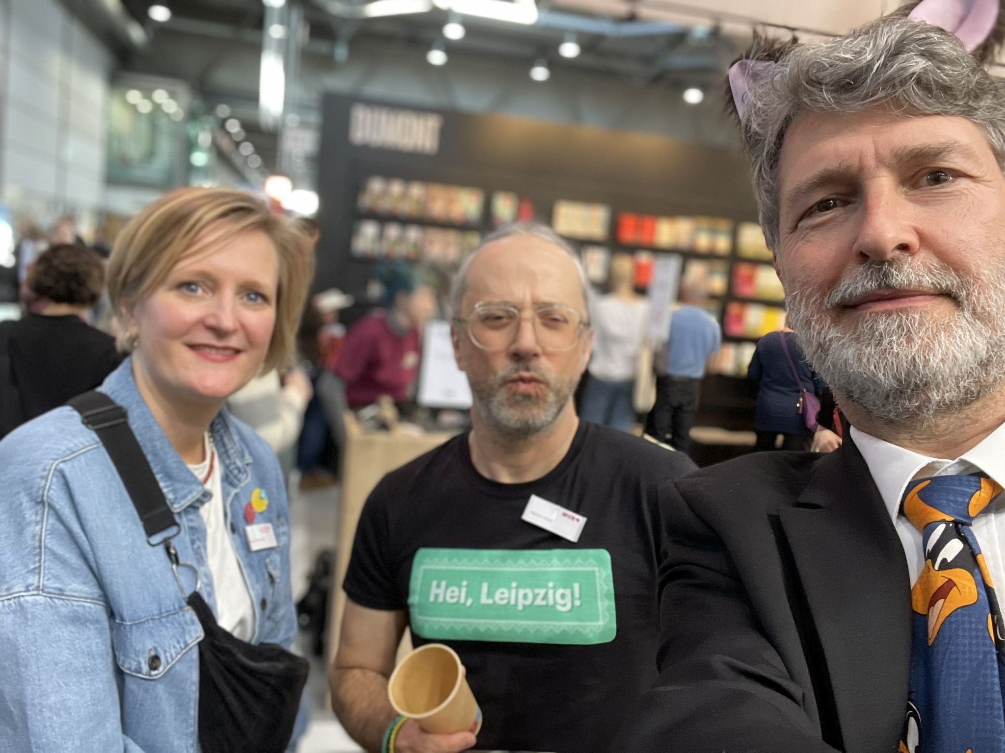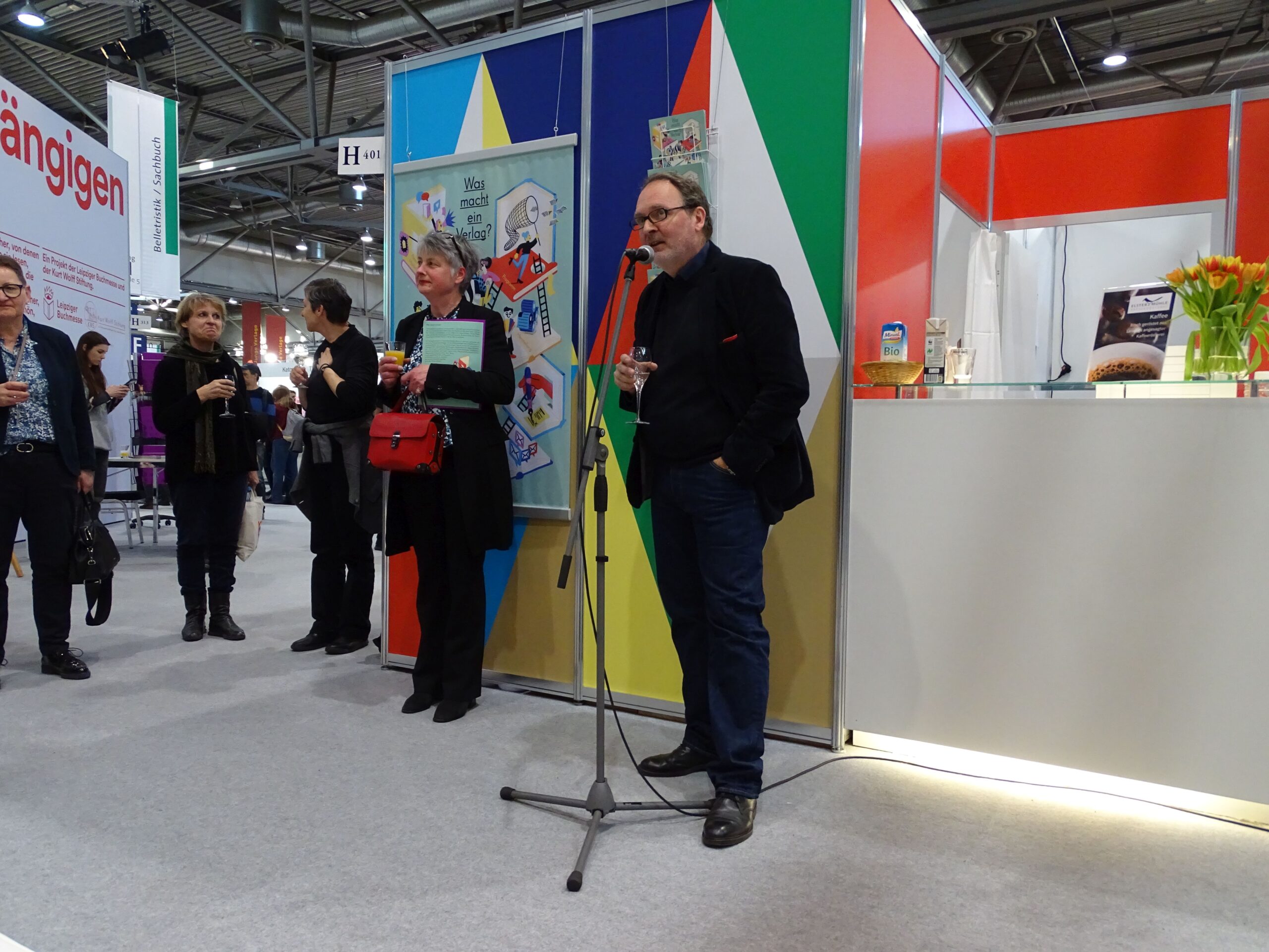 Klaus Kowalke, Admin der gleichnamigen Facebook-Gruppe Buchhandelstreff, eröffnet den jährlichen Buchhandelstreff. Wir warten zwar auf Astrid Böhmisch, die Messedirektorin.