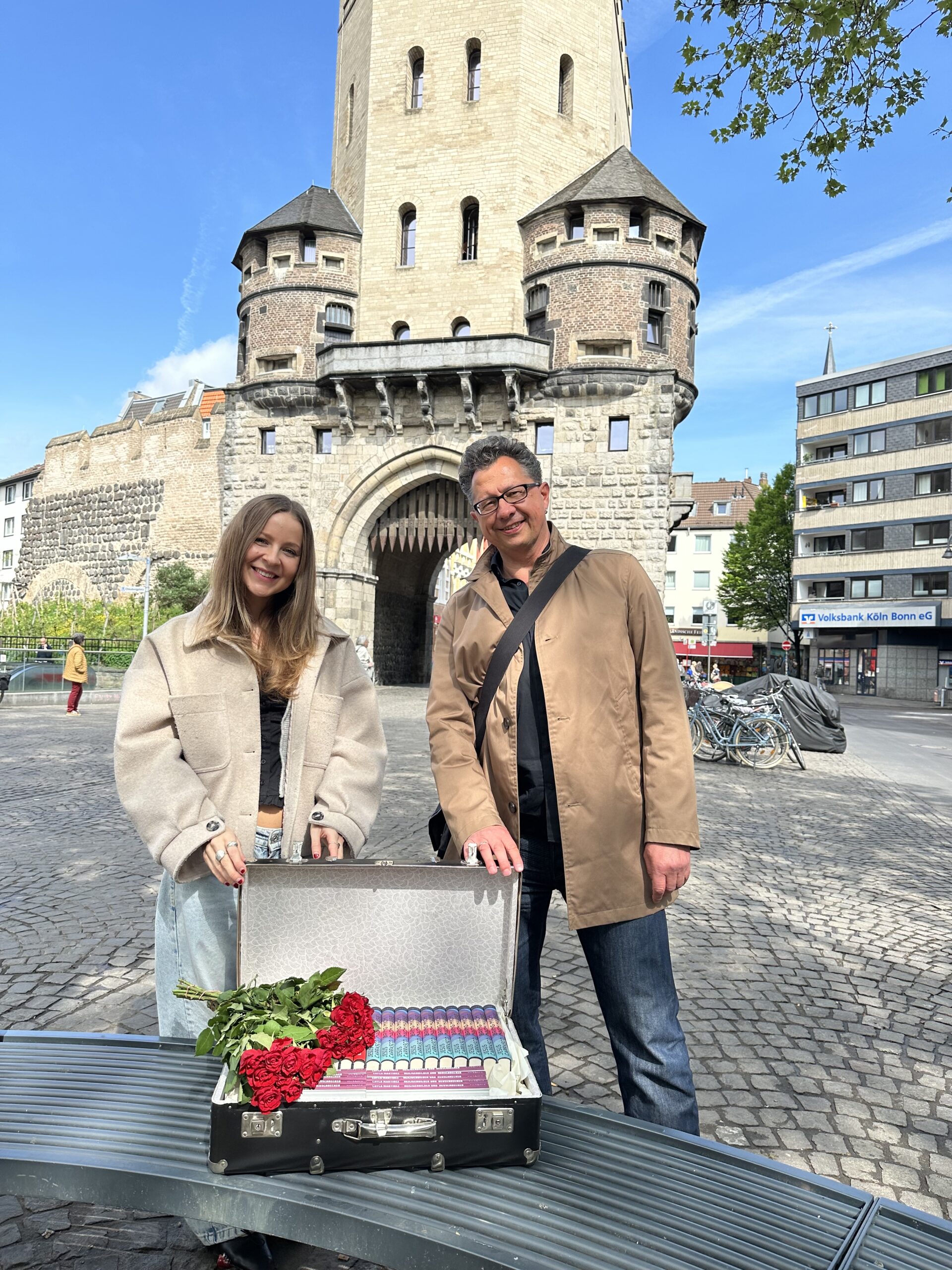 Davon sind wir bei uns noch weit entfernt, doch das Team des Eichborn Verlags wollte zumindest einen Hauch dieser Stimmung nach Köln bringen, berichtet Uwe Kalkowski. Daher waren Social Media Managerin Ella Wonschik und er als Brand Manager mit einem Koffer voller Bücher und einem Strauß Rosen in der Kölner Südstadt unterwegs, um beides zu verschenken. Zur Auswahl standen drei Romane aus Spanien, die bei Eichborn erschienen sind: »Geht so« von Beatriz Serrano (Ü: Christiane Quandt), »Bring mich nach Hause« von Jesús Carrasco (Ü: Silke Kleemann) und »Heiligenbilder und Heuschrecken« von Layla Martínez (Ü: Christiane Quandt). Die angesprochenen Passant:innen konnten sich eines der Bücher aussuchen und erhielten eine Rose. „Wir haben etliche schöne Gespräche geführt, die Aktion hat großen Spaß gemacht“, so Uwe Kalkowski. „Die Angesprochenen waren total überrascht – besonders, da sie anfangs dachten, wir wollten ihnen etwas verkaufen. Umso mehr haben sie sich über das Buch und die Rose gefreut.“