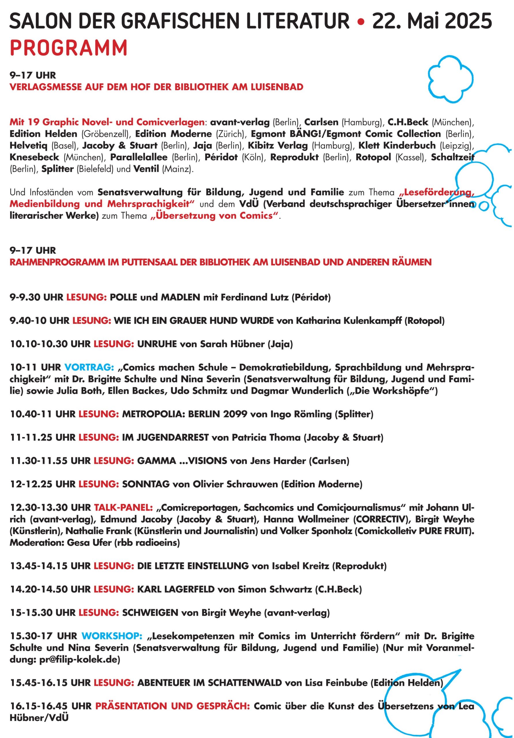Am 22. Mai informieren 19 Verlage und zahlreiche Autor:innen in Berlin wieder über aktuelle und kommende Novitäten und die Herbst/Winter-Programme 2025 im Bereich Comic. Dazu gibt es Workshops, Vorträge, Diskussionrunden und Infostände von Leseförder-Initiativen und Übersetzer:innen-Gruppen.