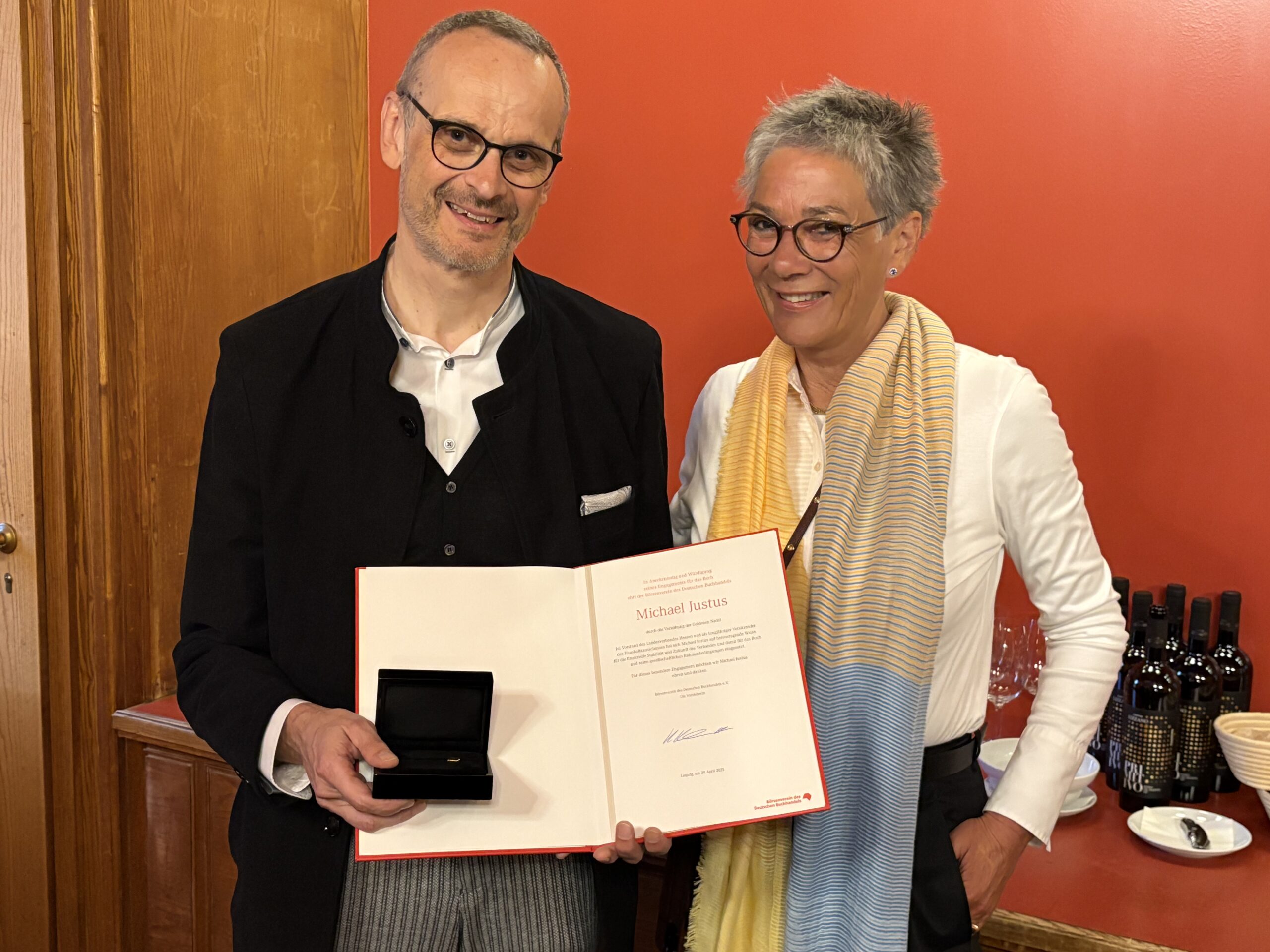 Der Börsenverein des Deutschen Buchhandels ehrte gestern Abend nach den gemeinsamen Sitzungen der Fachausschüsse in Leipzig Michael Justus mit der Goldenen Nadel. Er erhält die Auszeichnung für seine außergewöhnlichen Verdienste für den Börsenverein und die Buchbranche. Die Goldene Nadel verlieh Vorsteherin Karin Schmidt-Friderichs.