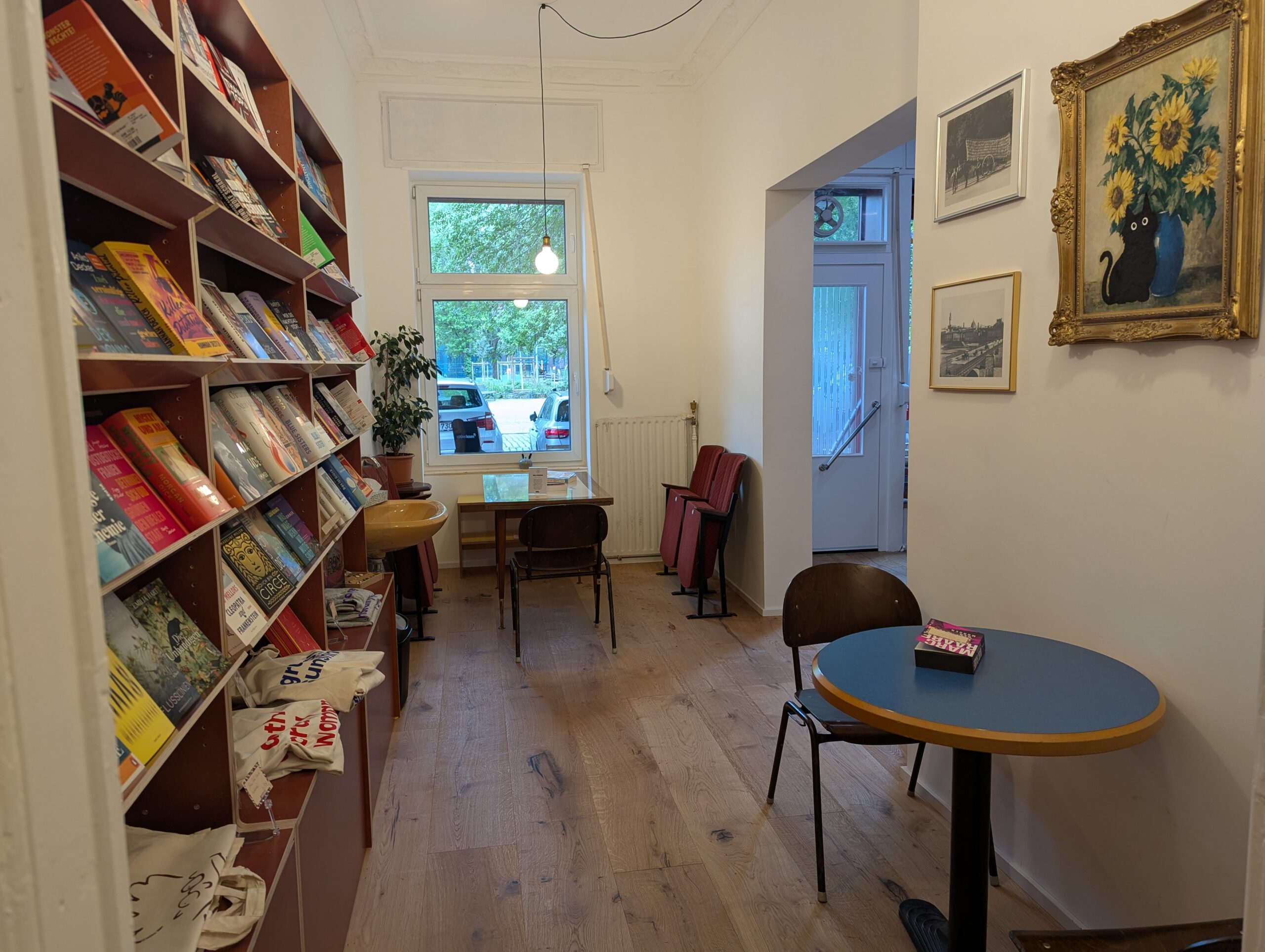 Am 5. Mai hat das hybride Konzept, das weit über „Kaffee-Ecke im Buchladen“ hinausgeht, eröffnet. Hier sollen zwei gleichwertige Erlebniswelten auf 70 Quadratmetern vereint werden. „Ich habe mir von Anfang an vorgestellt, Literatur mit Gastronomie zu verbinden, aber nicht als Ergänzung, sondern als stimmiges Gesamtkonzept“, sagt Monert, die zuvor u.a. bei Audible arbeitete. Buch-Regale und Café-Tische teilen sich entsprechend die drei kleinen Räume. Um allzu viel Buch-Ausschuss zu vermeiden bleibt eines der Waschbecken des vorherigen Friseurs im Geschäft erhalten, an dem sich Kund:innen zwischen hausgemachter Focaccia und Buch die Hände waschen können.