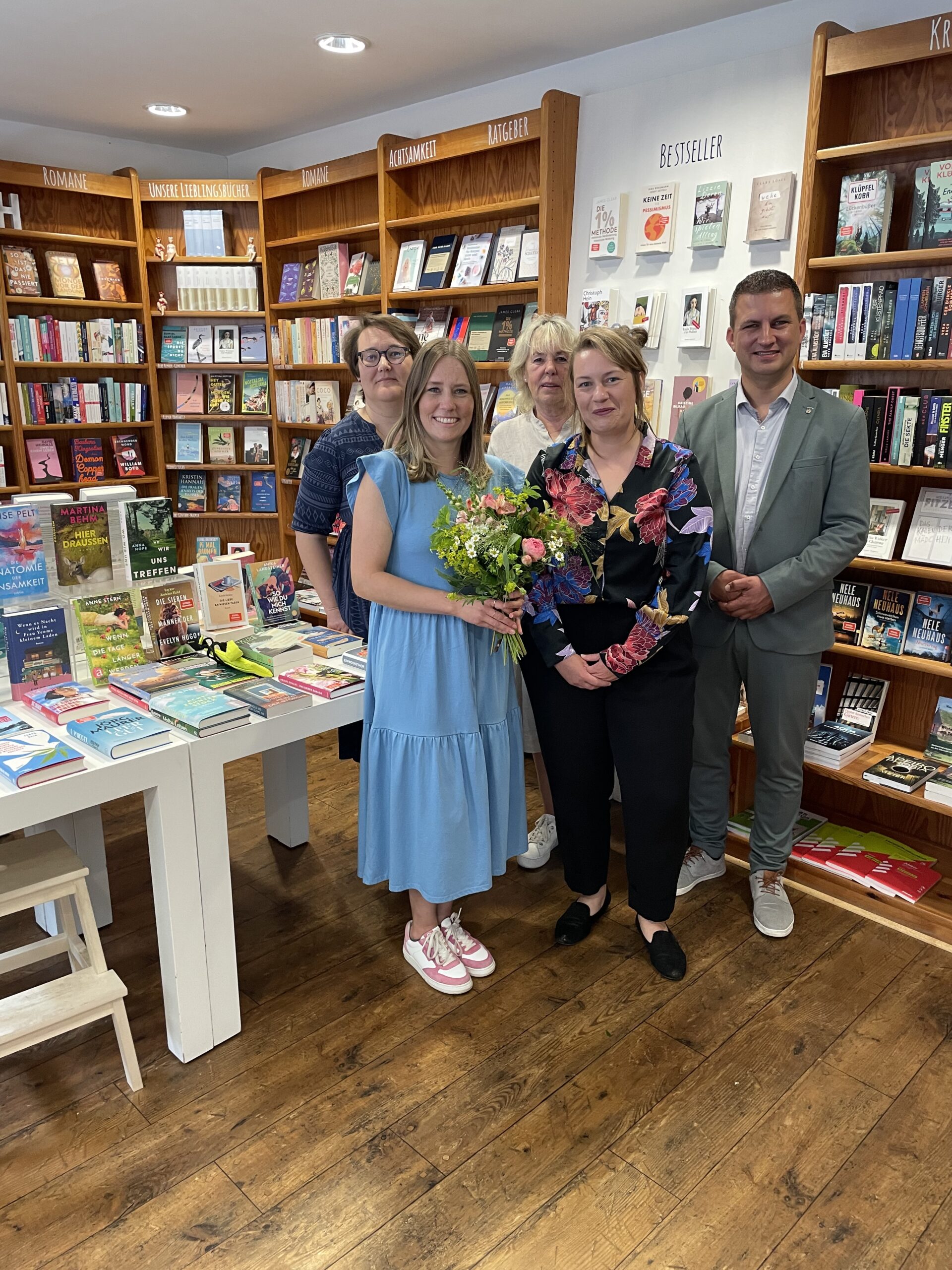 Elena Rakowitz, Mitarbeiterin Bianca Fuchs, Silke Pfeiffer (LV HRS), Elke Reyher-Günther (die Mutter von Elena Rakowitz, die die Buchhandlung Ende der 1970er gegründet und vor zwei Jahren an ihre Tochter übergeben hat) und Bürgermeister René Kirch