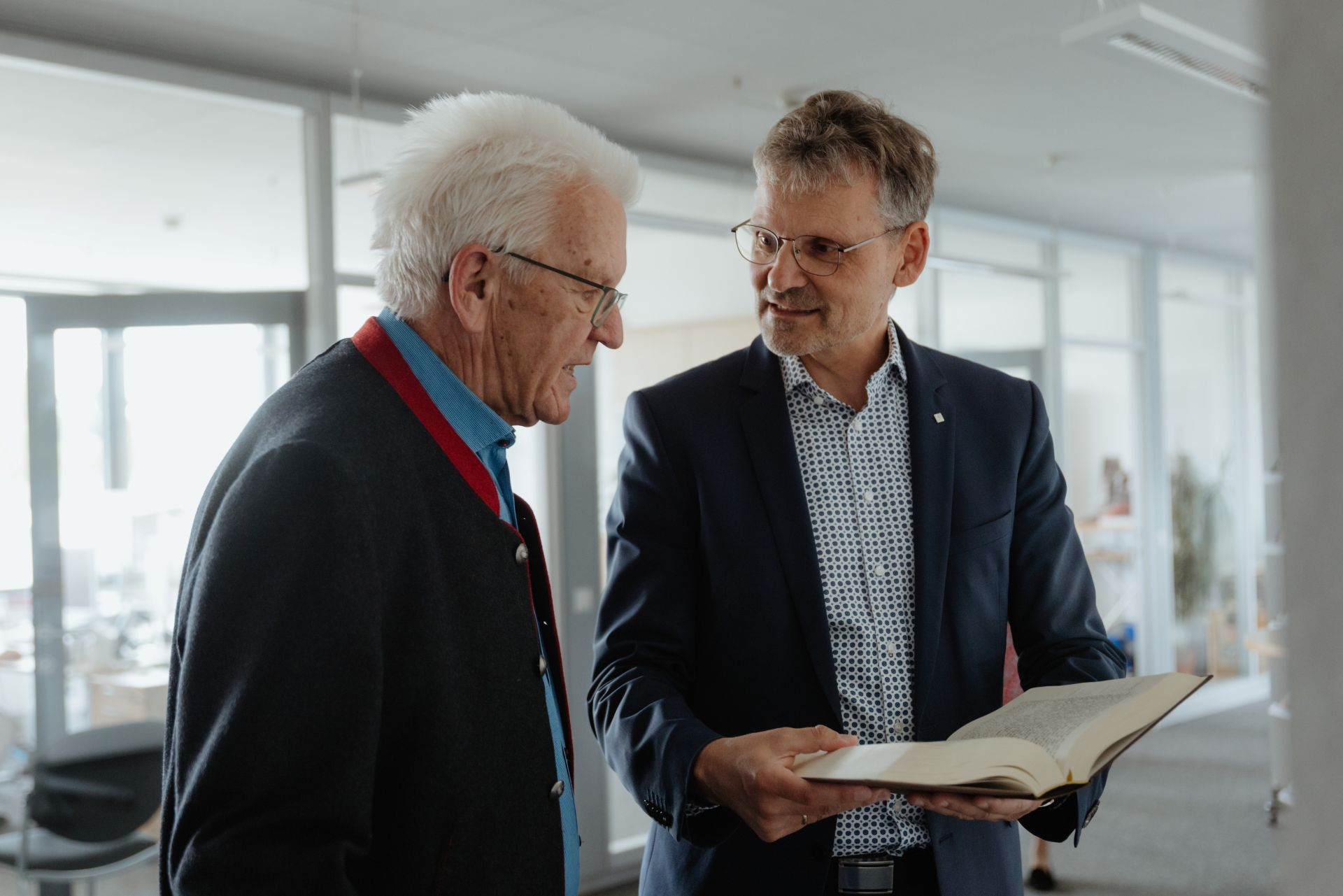 Der Ministerpräsident des Landes Baden-Württemberg, Winfried Kretschmann. hat am Mittwoch, 9. Juli, die Deutsche Bibelgesellschaft an ihrem Standort in Stuttgart Möhringen besucht. Generalsekretär Dr. Christoph Rösel und Mitarbeitende stellten die Arbeit der Bibelgesellschaft vor. Im Gespräch mit dem Ministerpräsidenten ging es sowohl um einzelne Bibel-Ausgaben als auch um die Bedeutung Bibel insgesamt.