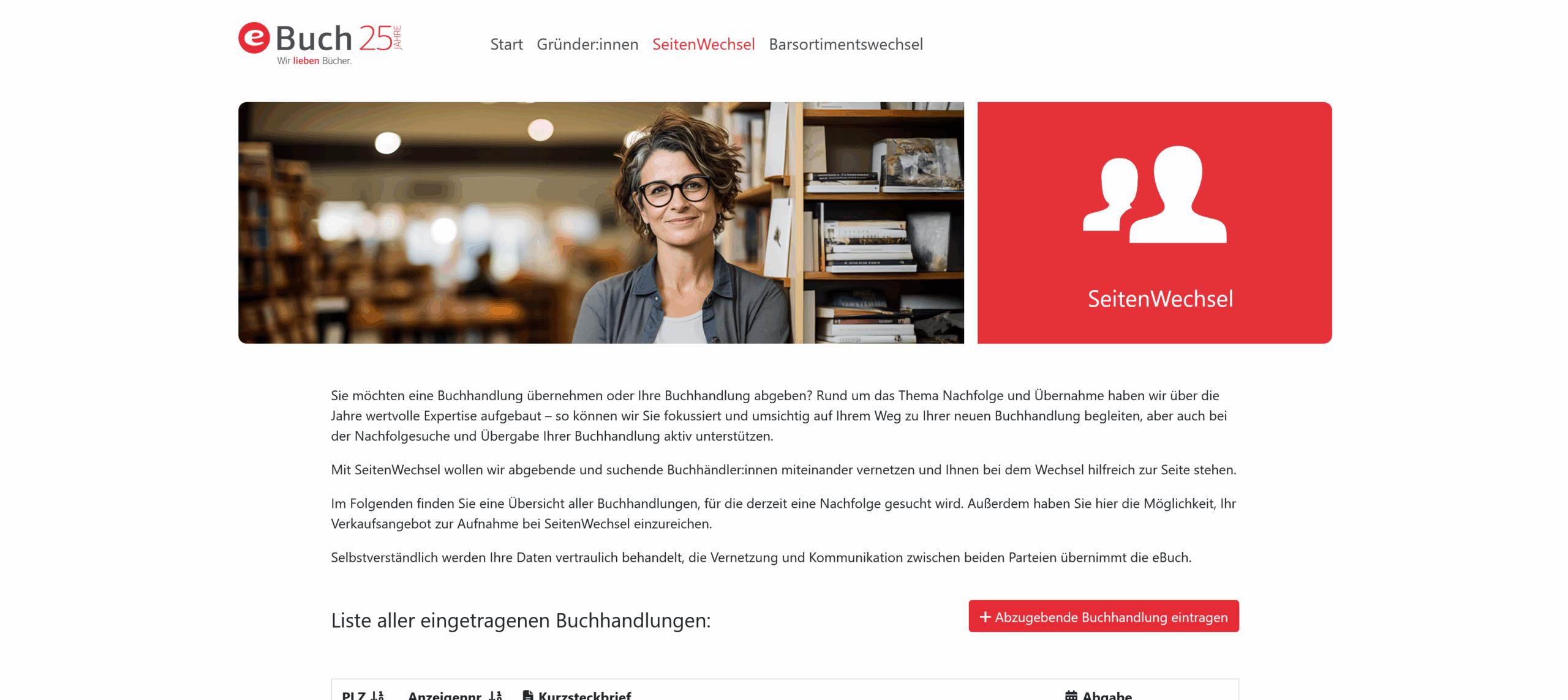 Die eBuch, Deutschlands größte Verbundgruppe und Einkaufsgemeinschaft unabhängiger Buchhandlungen, hat auf ihrer Branchenplattform für Gründer:innen und Nachfolger:innen deinebuchhandlung.de ein neues digitales Tool gestartet: „SeitenWechsel“. SeitenWechsel vernetzt Buchhändler:innen, die ihre Buchhandlung abgeben oder eine solche übernehmen möchten. Das Tool soll unkompliziert sein und auf die Bedürfnisse des inhabergeführten Sortimentsbuchhandels zugeschnitten.