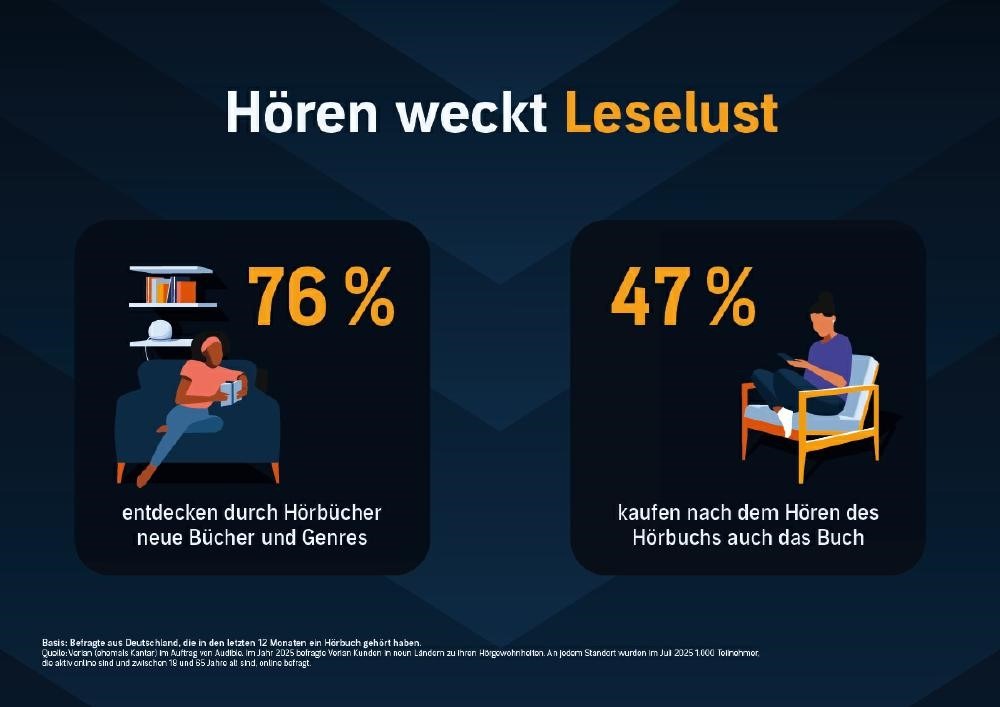 49 Prozent der Deutschen im Alter von 18 bis 65 Jahren hörten 2025 regelmäßig Hörbücher, Hörspiele oder Podcasts (mindestens einmal im Monat) – mit 3 Prozent mehr als im Vorjahr ist dies erneut ein Anstieg und das neunte Wachstumsjahr in Folge. Das zeigt der Hörbuchkompass 2025 von Amazons Audioanbieter Audible in Zusammenarbeit mit dem Forschungsinstitut Verian. Damit belegt Deutschland im Vergleich der vier befragten europäischen Länder, in denen Audible verfügbar ist, beim Anteil regelmäßiger Hörer:innen den zweiten Platz – direkt hinter Spanien (54 Prozent) und vor Italien (45 Prozent) und Frankreich (39 Prozent). Besonders Hörbücher und serielle Audioformate legten deutlich zu, mit jeweils 3 Prozentpunkten mehr als im Vorjahr. Podcasts verzeichneten einen Anstieg von 2 Prozentpunkten. In Frankreich stieg die Nutzung von Hörbüchern sogar um fünf Punkte.