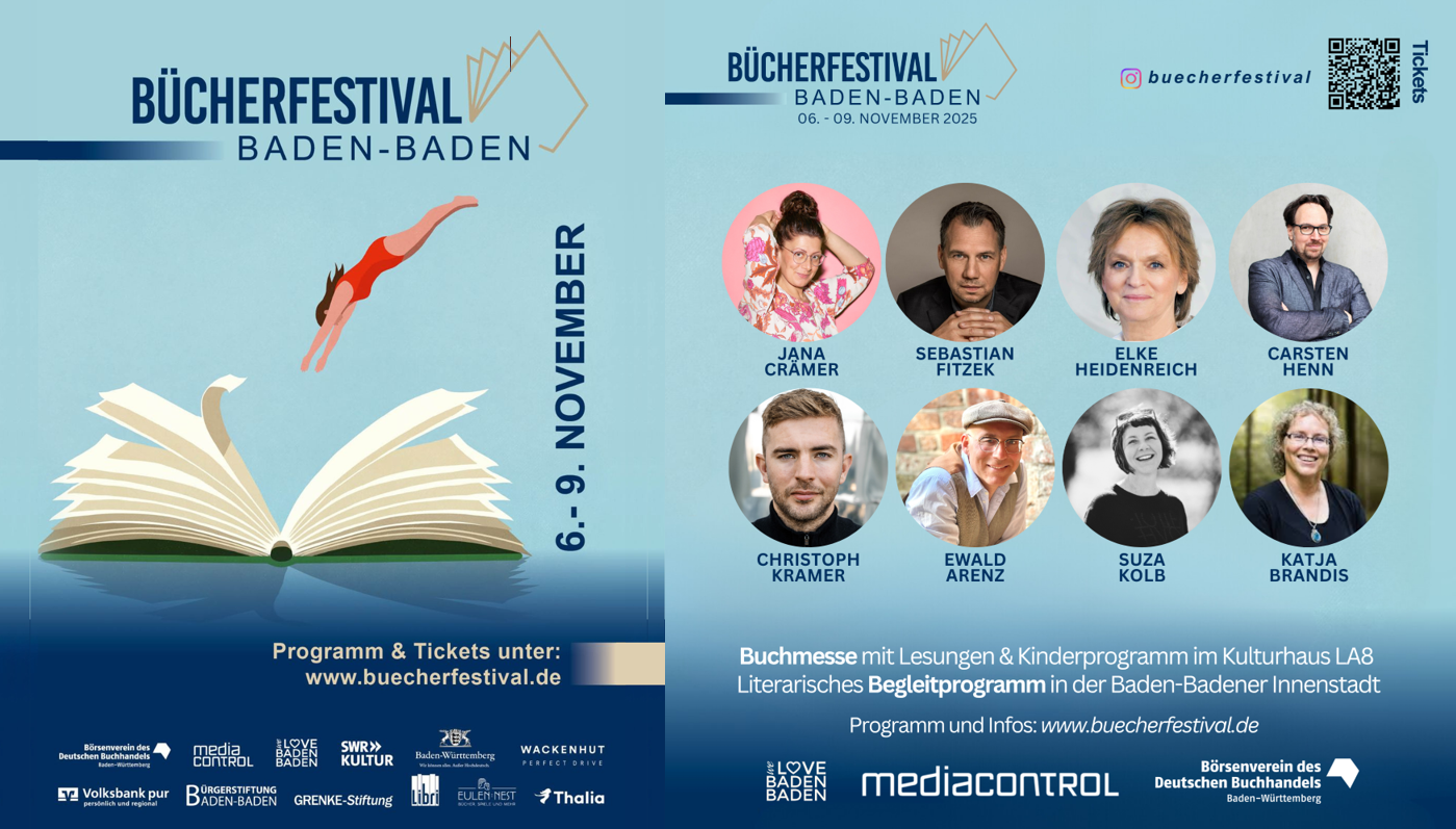 Über 40 Literaturveranstaltungen und eine Ausstellung stehen vom 6. bis 9. November 2025 in Baden-Baden auf dem Plan. Beim Bücherfestival Baden-Baden lesen unter anderem Christoph Kramer (9.11., Porsche Studio) und Elke Heidenreich (7.11., Brenners Park-Hotel & Spa), deren Veranstaltungen bereits ausverkauft sind. Für Bestsellerautor Sebastian Fitzek, der am Eröffnungsabend (6.11., Bénazetsaal des Kurhauses) vor über 1.000 Fans seinen neuen Psychothriller „Der Nachbar“ präsentiert, gebe es nur noch wenige Tickets.