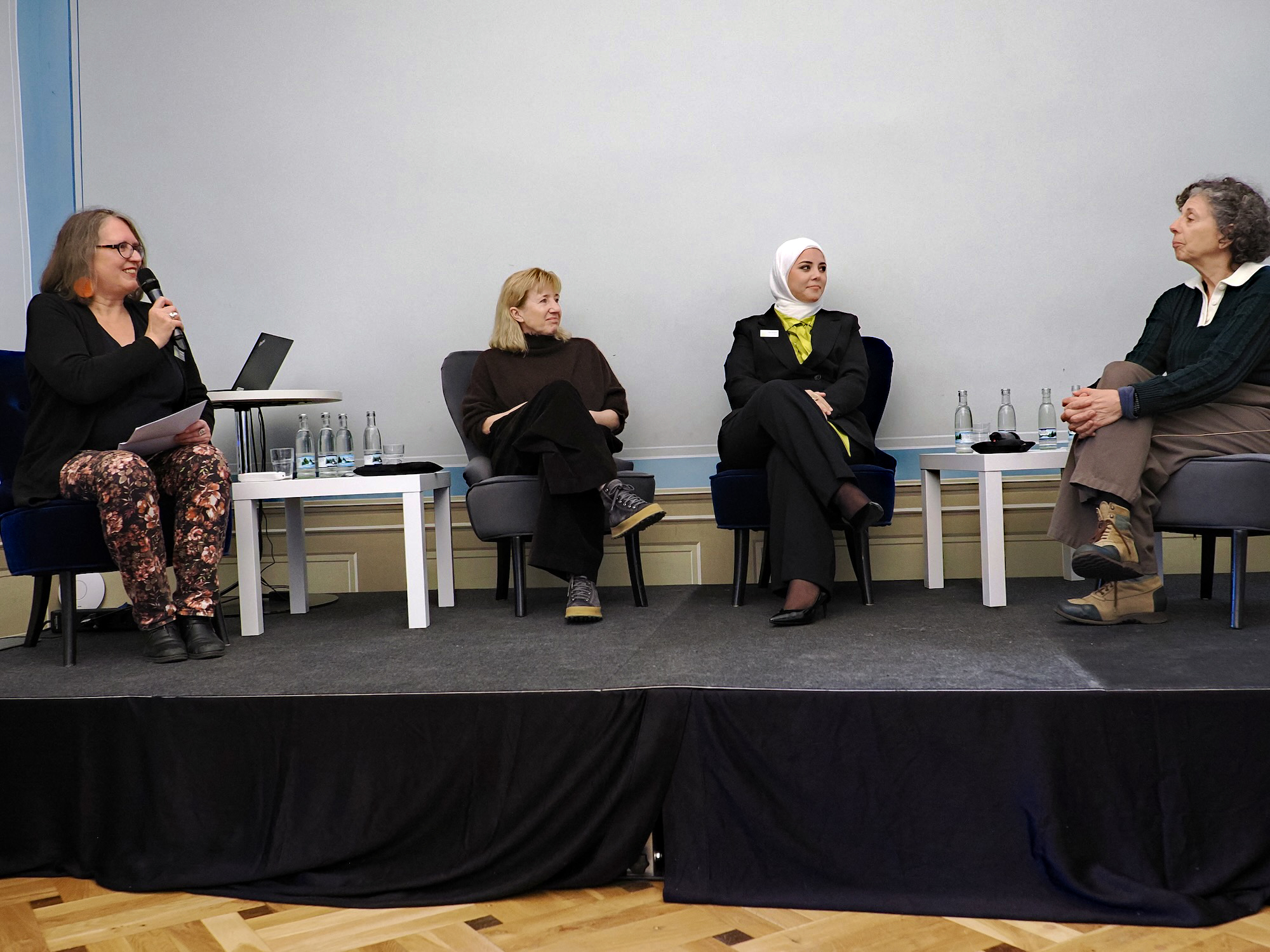 An die Keynote anschließend diskutierten Ines Geipel, die Schriftstellerin Esther Dischereit sowie Nour Al-Zoubi vom Flüchtlingsrat Thüringen e.V. über die reale Lebenswelt und welche Strategien gegen den aktuellen Rechtsruck wirken können. Britta Jürgs, Verlegerin des AvivA Verlags, moderierte die Podiumsdiskussion. Esther Dischereit, die als „eine der wichtigsten literarischen Stimmen unter den Nachkommen der Shoa-Überlebenden in Deutschland“ gilt und sich selbst als „solidarische Zeugin“ bezeichnete, betonte, dass es darum gehe „sehen [zu] wollen, was ist“ und dass sich aus dem Sehen eine Verantwortung ergebe. Sie beschrieb eindringlich die Wirkmechanismen der Vertreibung und wie es sich anfühlt, wenn die Familie auf der ganzen Welt verstreut lebt. Man wisse auch häufig gar nicht, wer überhaupt überlebt habe und wo man anfangen solle zu suchen, erklärte sie. Ähnlich ergeht es der engagierten Sozialarbeiterin Nour Al-Zoubi, die im Jahr 2015 aus Syrien nach Deutschland floh und im Alltag permanent rechtfertigen muss, warum ein Bürgerkrieg Menschen in die Flucht treibt. Alle im Podium stimmten überein, dass es wichtig sei, die Stimmen der direkt Betroffenen hörbar zu machen, mit Menschen direkt zu sprechen und durch Medien ihre Perspektive zu veröffentlichen, denn nur im Dialog entstehe Verständnis.
