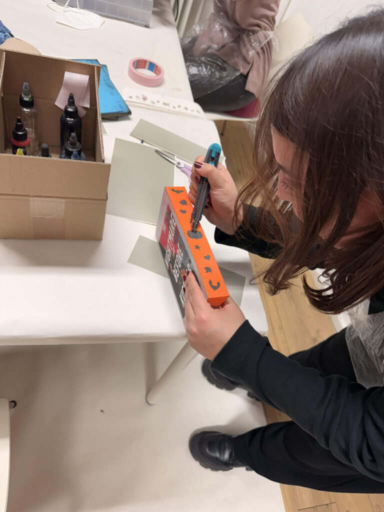 Das geschah unter professioneller Anleitung des Wunderzeilen-Verlags. Zur Anwendung kamen zwei Sprühkabinen, eine große Auswahl an Farben, Schablonen und viel Glitzer. So konnten die Creator:innen ihre Bücher in Einzelstücke verwandeln und ihrer Kreativität freien Lauf lassen.