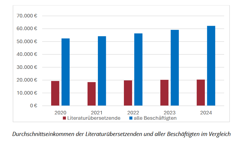 So unverzichtbar und wertvoll die Arbeit von Übersetzenden für die Verlage demzufolge sei, so unbefriedigend sei ihre Bezahlung, wertet der VdÜ: Die meisten Literaturübersetzenden seien hoch qualifiziert und ganzjährig ausgelastet. Dennoch erwirtschafteten sie 2024 ein Jahreseinkommen von durchschnittlich nur 20.363 Euro vor Abzügen – das ist weniger als ein Drittel des deutschen Durchschnittseinkommens. Da es unter diesen Bedingungen kaum möglich ist, Reserven zu bilden oder gar eine adäquate private Altersvorsorge aufzubauen, sind Literaturübersetzende auch im Alter akut armutsgefährdet.
