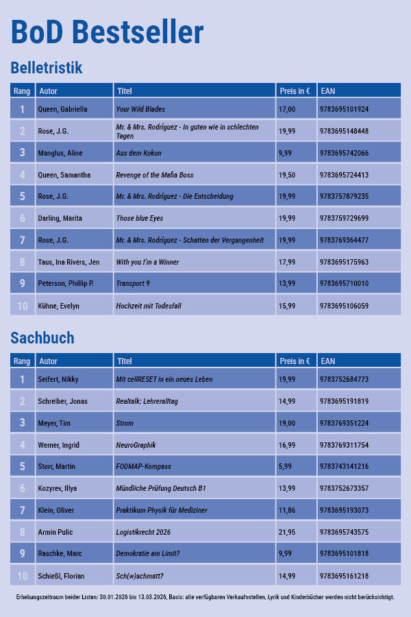 Wie können Buchhändler:innen sich im Dschungel der Selfpublishing-Novitäten orientieren? Die Bestsellerliste des Dienstleisters BoD erscheint monatlich bei BuchMarkt und gibt einen Überblick über die meistverkauften Titel des Anbieters.