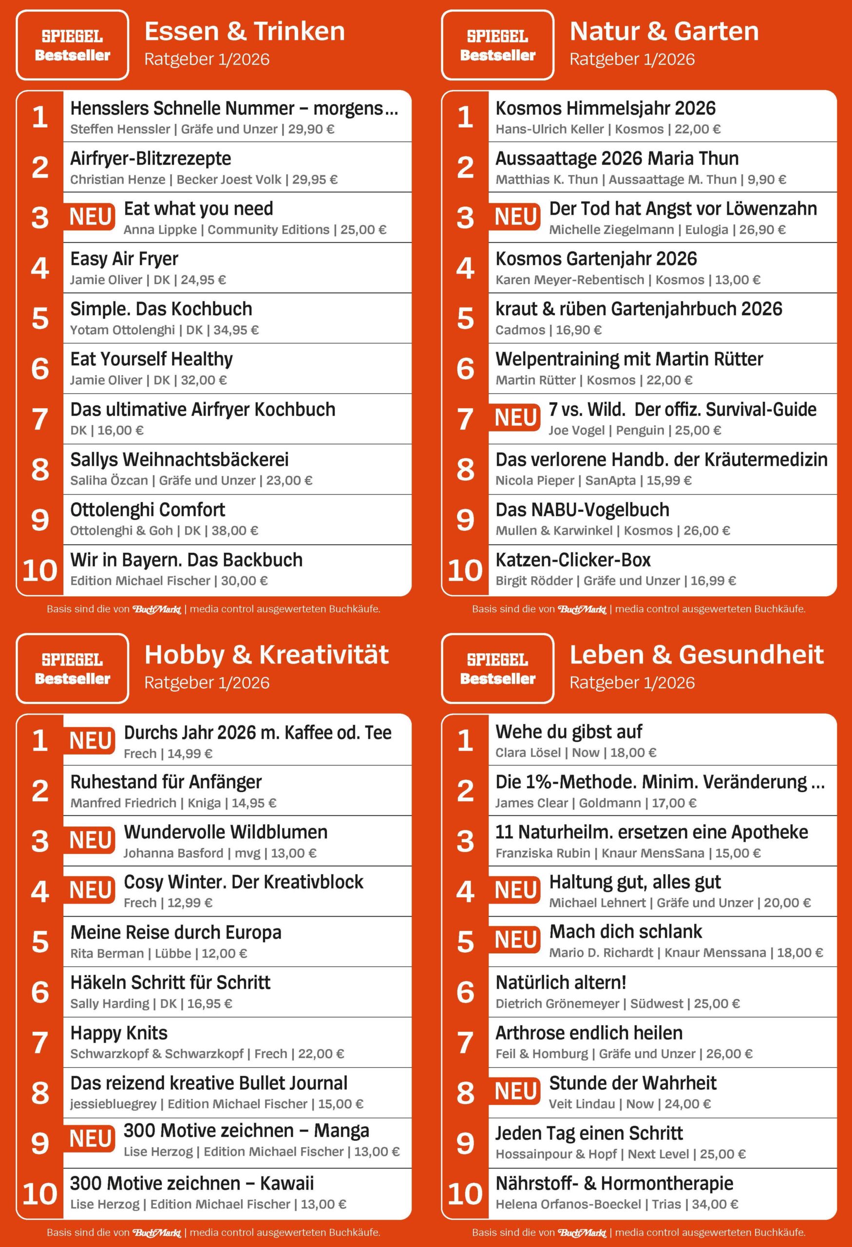 - SPIEGEL Bestseller Ratgeber Top 10: Essen & Trinken, Natur & Garten, Leben & Gesundheit, Hobby & Kreativität