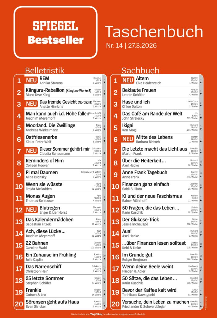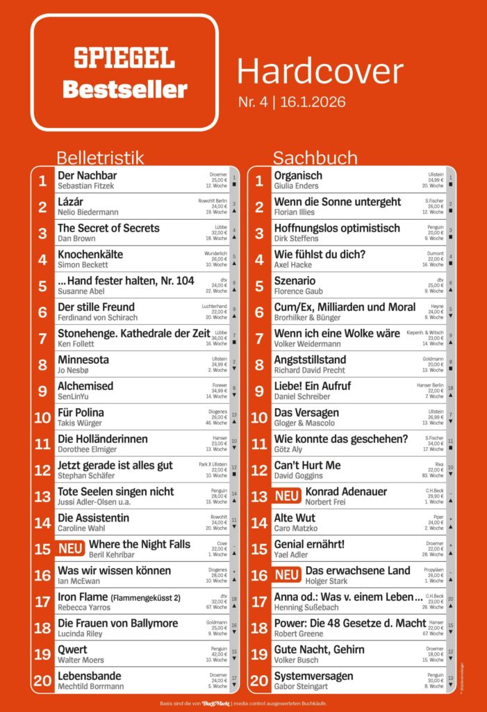 - Die SPIEGEL-Bestsellerlisten finden Sie als Information für die Buchbranche (b2b) auf buchmarkt.de am Donnerstag (gültig seit 03.07.2025).