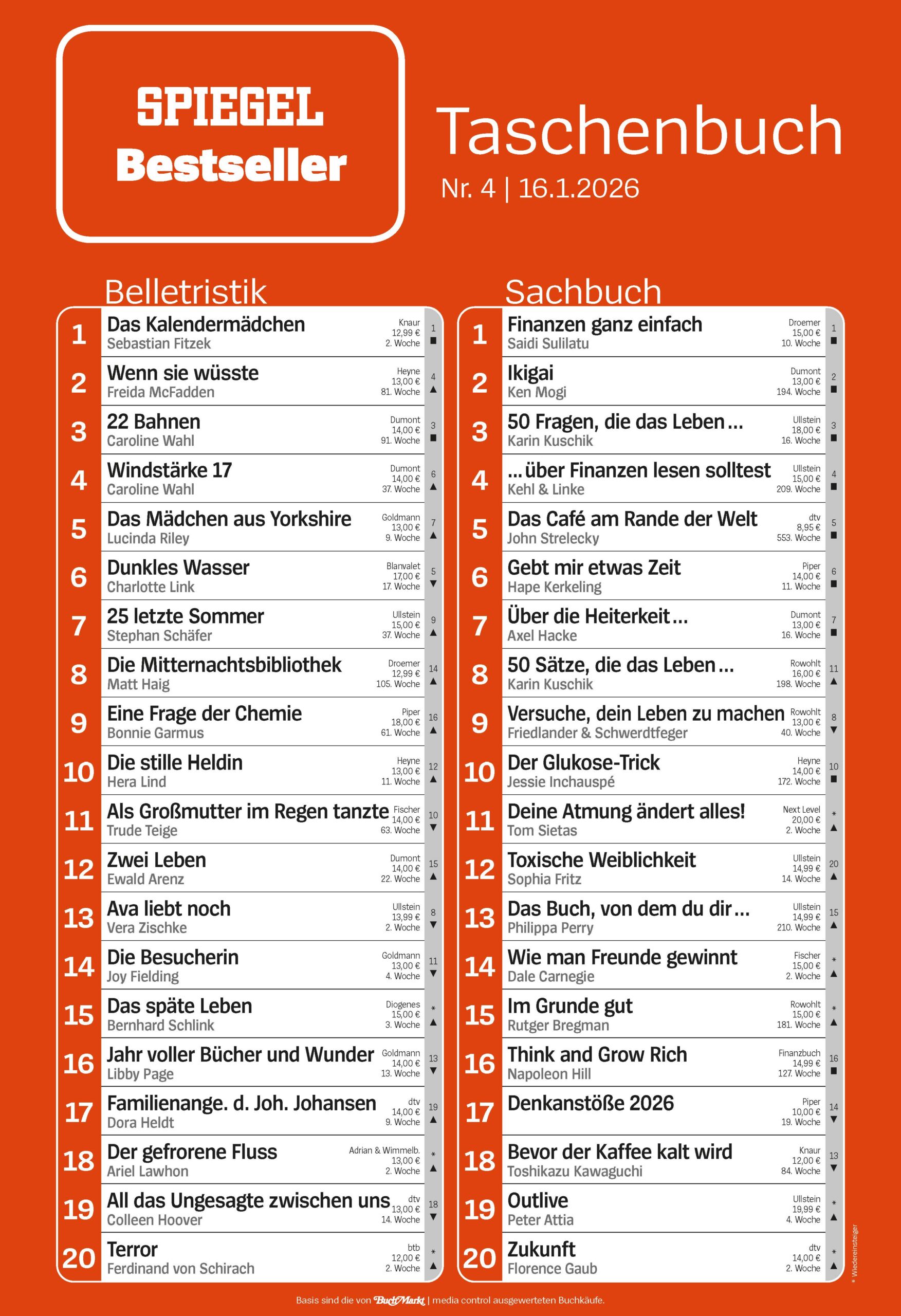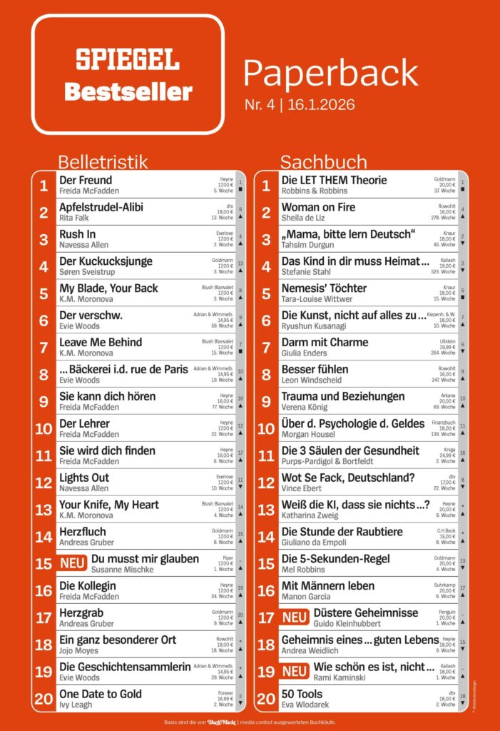- wöchentlich Bestseller Belletristik und Sachbuch Taschenbuch, Medienpartner DER SPIEGEL