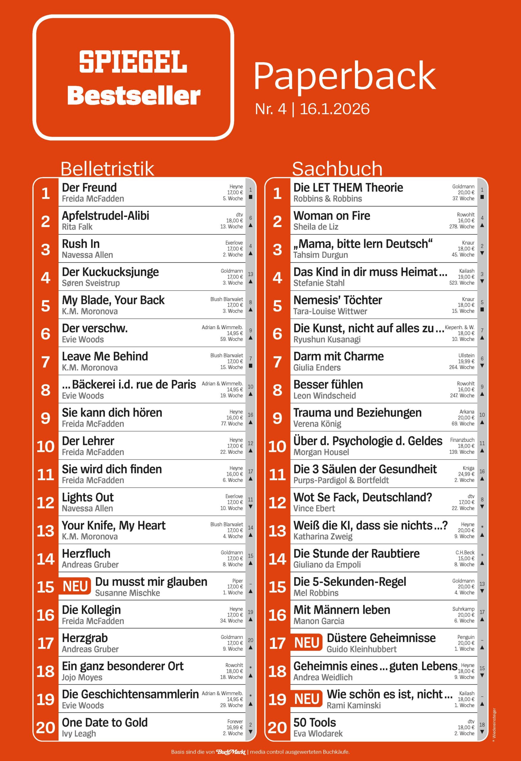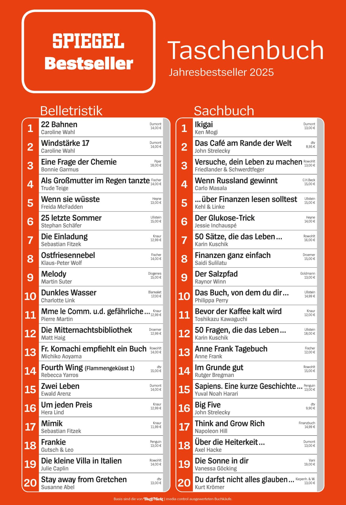 - wöchentlich Bestseller Belletristik und Sachbuch Paperback, Medienpartner DER SPIEGEL