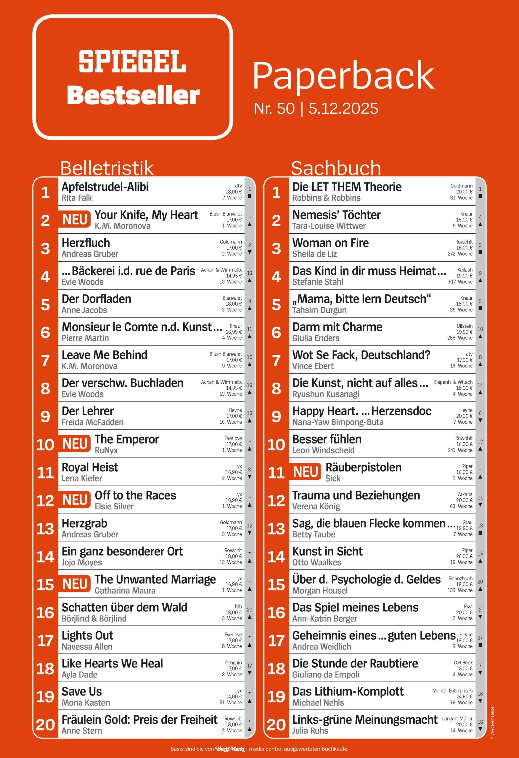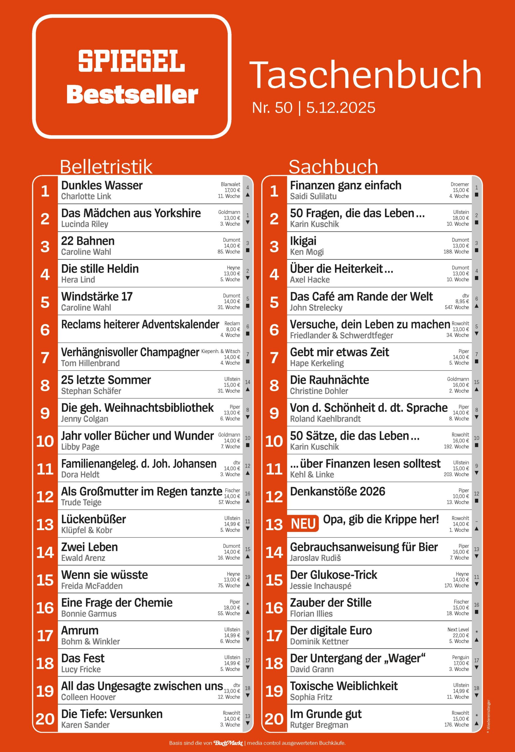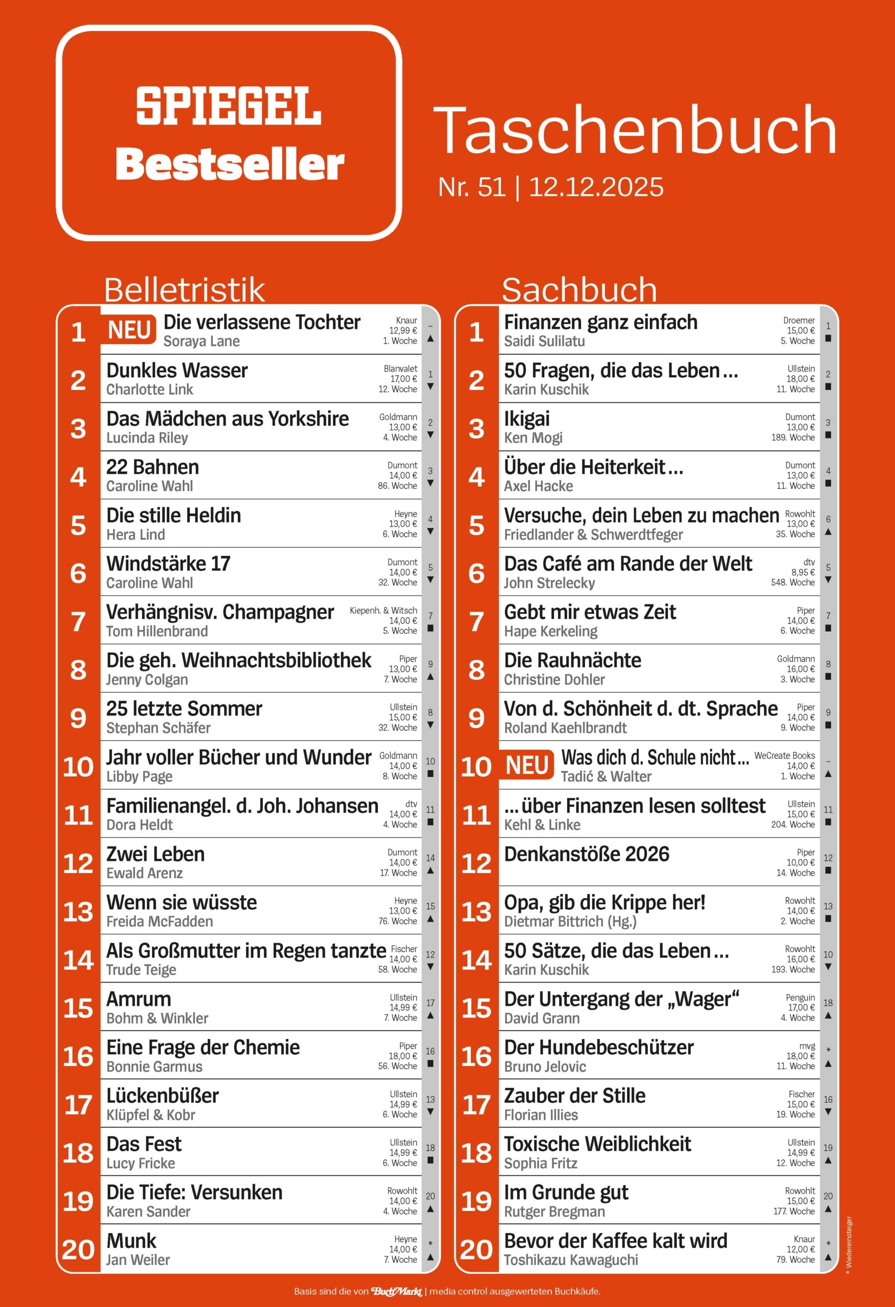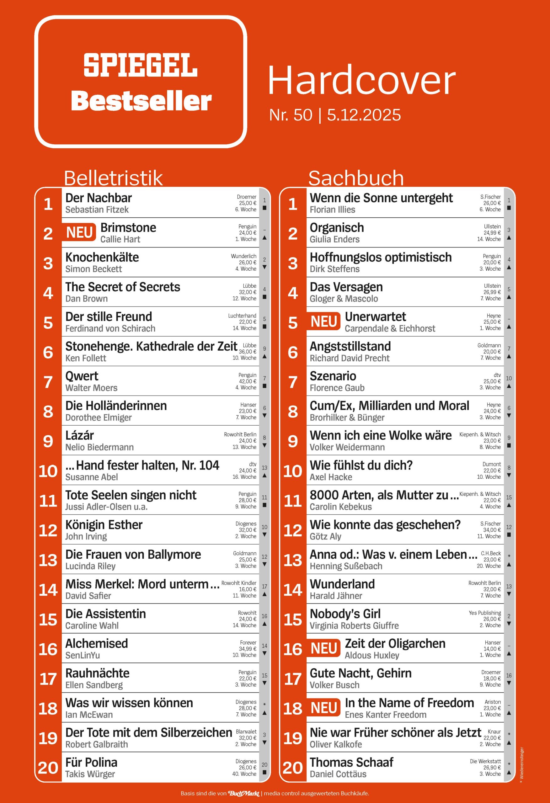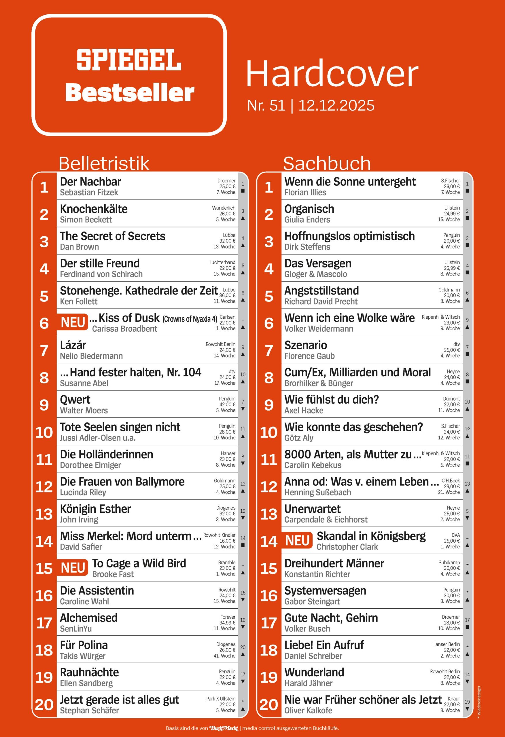 Sie finden die wöchentlichen SPIEGEL-Bestsellerlisten an dieser Stelle immer ab Donnerstag, 10 Uhr (gilt ab 3.7.25). Erst ab diesem Zeitpunkt dürfen Platzierungen auch durch Sie öffentlich bekannt gegeben werden.